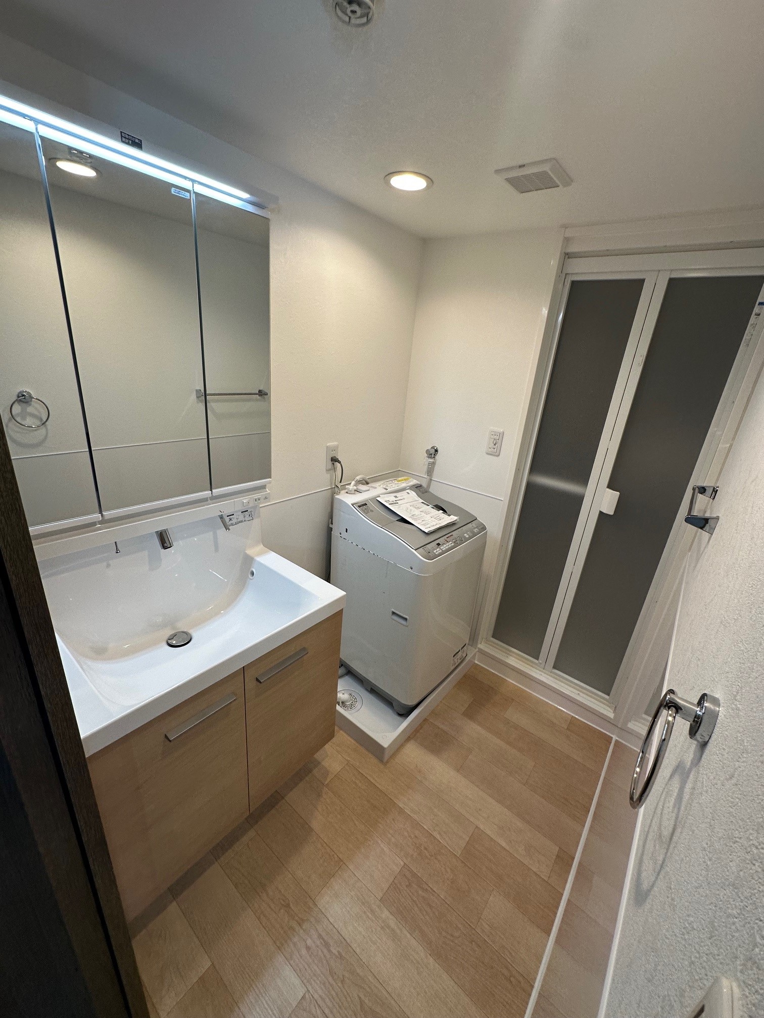 工事詳細 | 洗面所リフォーム(内装のみ) ・クロス張り変え(※天井のみ下地後クロス張り) ・ソフト巾木貼り替え ・床CF貼り ・コンセント/照明交換 ・タオル掛け交換 |