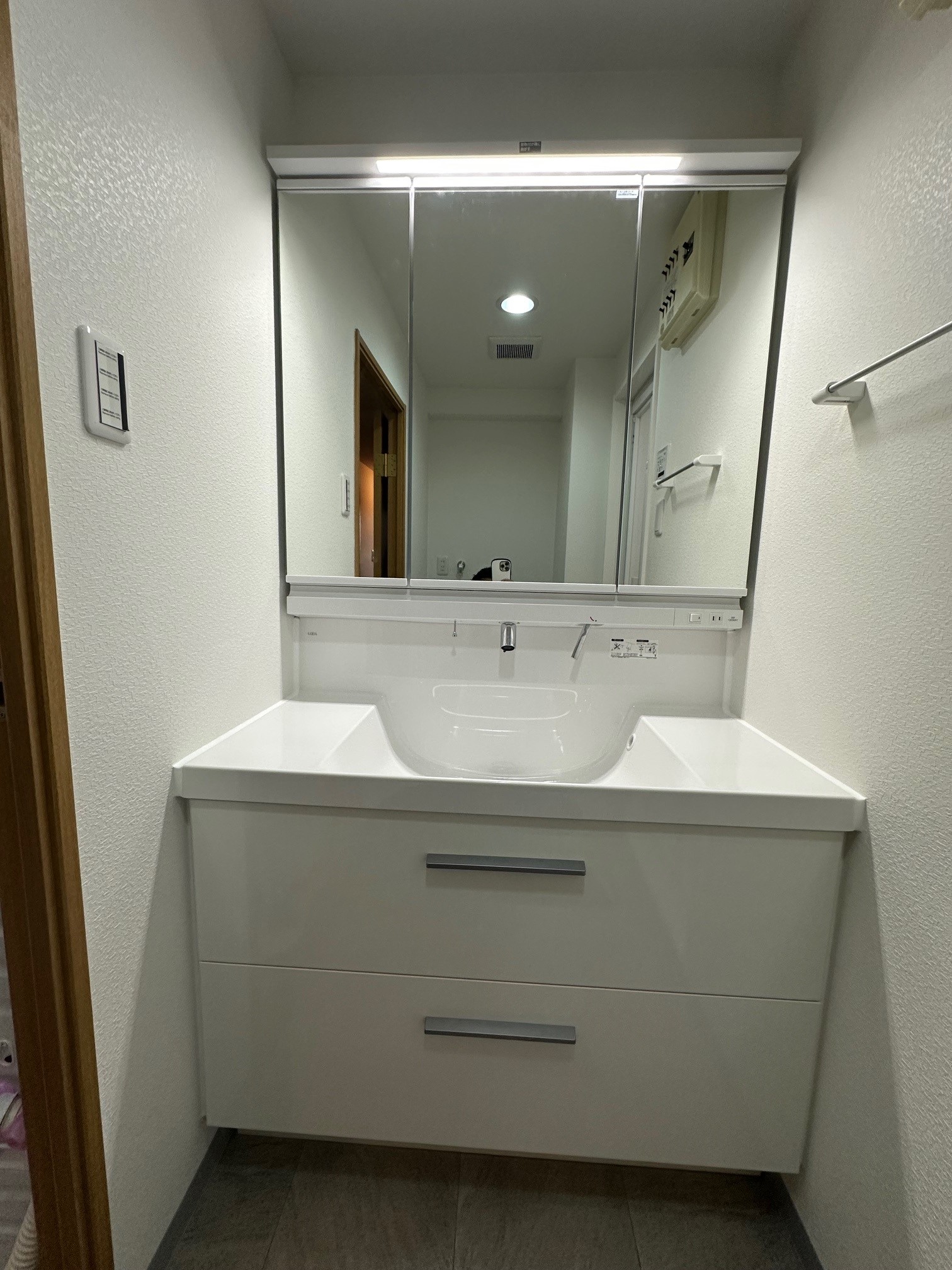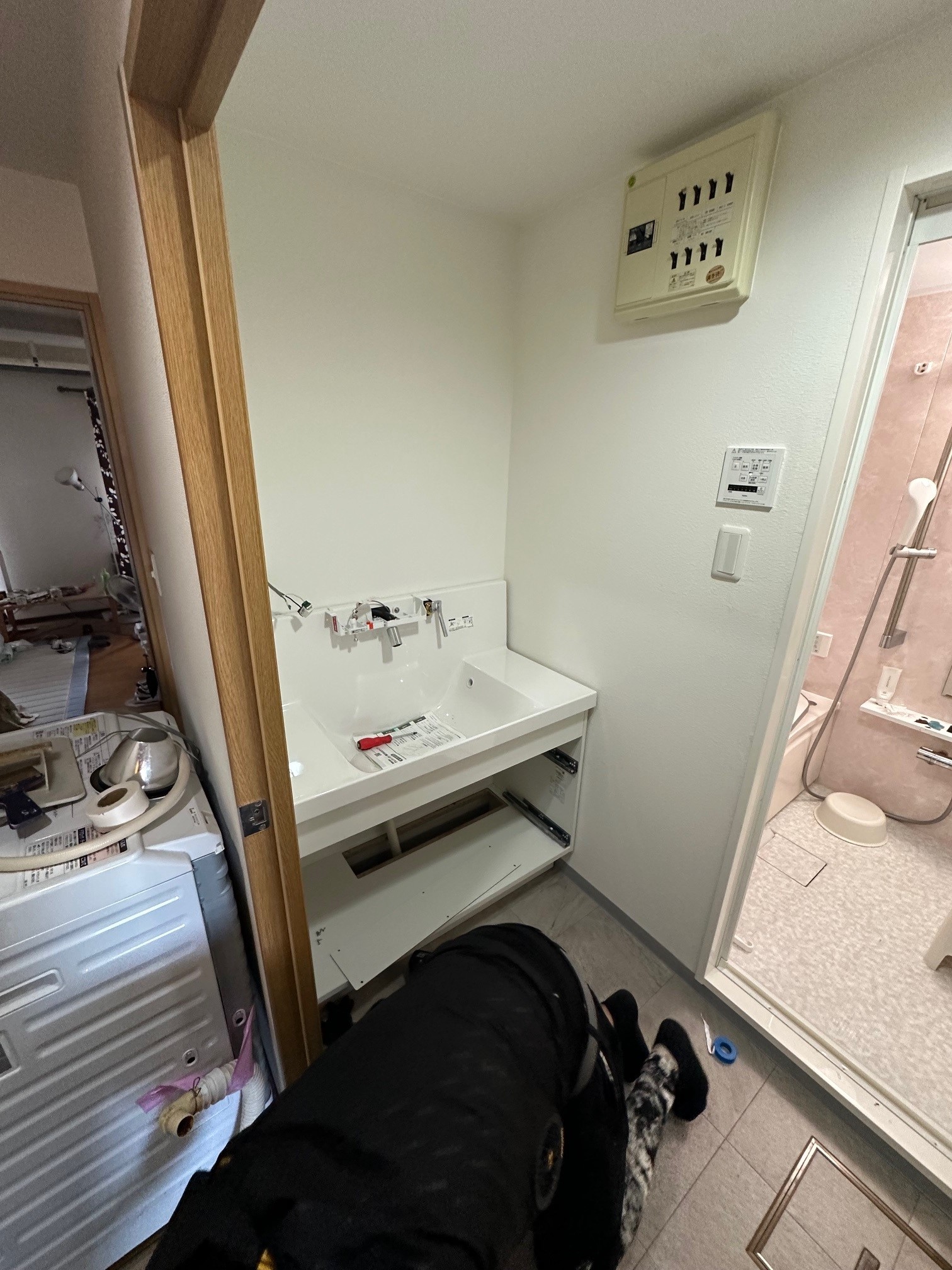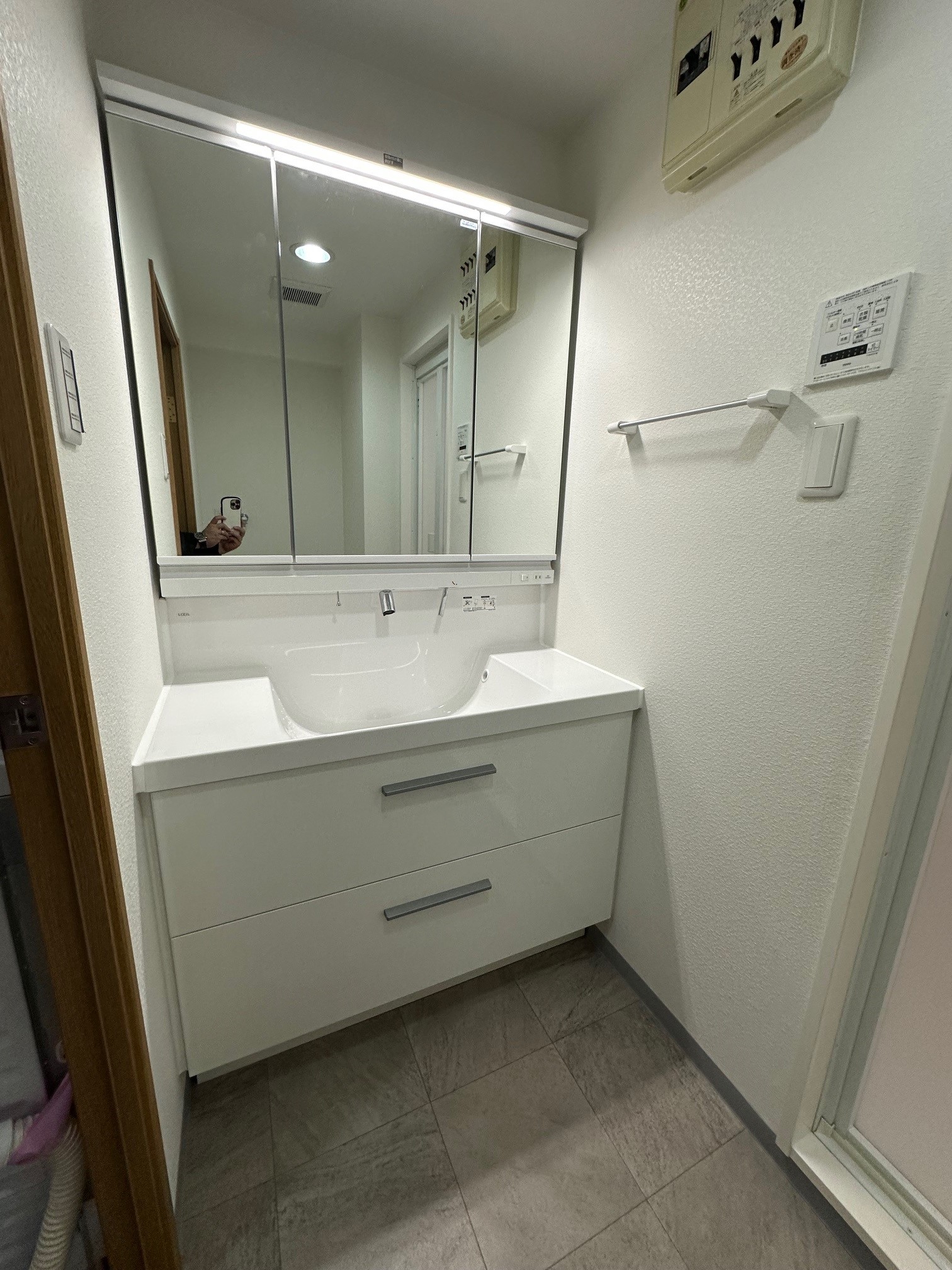 | 工事詳細 | 洗面室リフォーム ・洗面台取り替え ・クロス貼り替え ・床CF貼り替え ・ソフト巾木貼り替え ・防水パン交換 ・タオル掛け取り付け ・換気カバー交換 ・コンセント/スイッチ交換 |