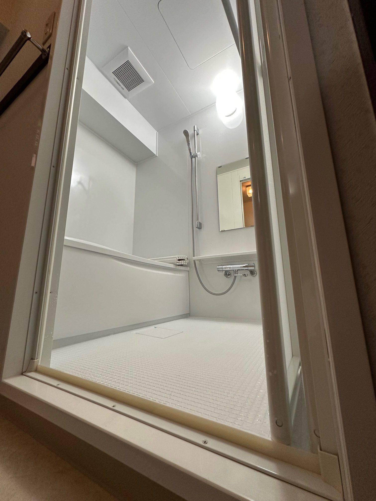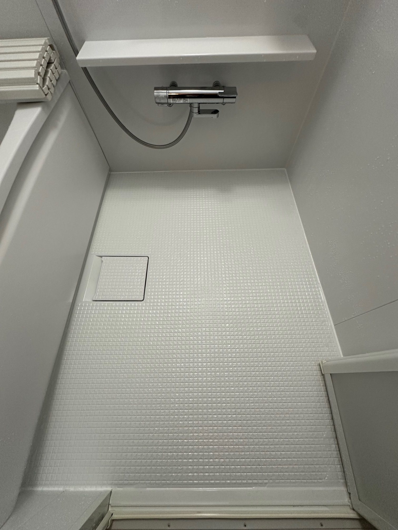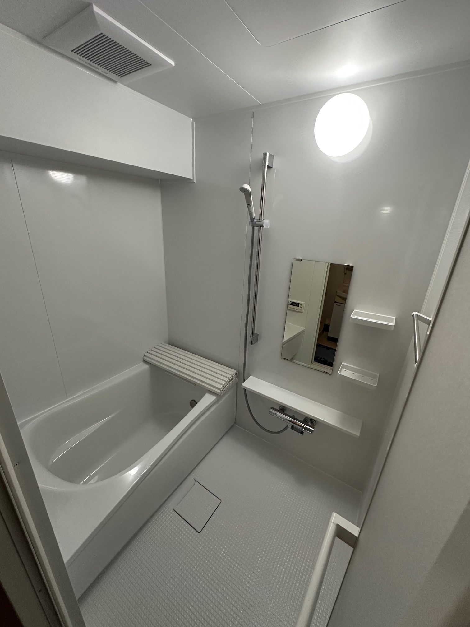 工事詳細 | 浴室改修工事 ・周辺パネル:プリエホワイト ・浴槽:ゆるリラ浴槽(ホワイト) ・カウンター:ホワイト ・床:カラリ床(ホワイト) |