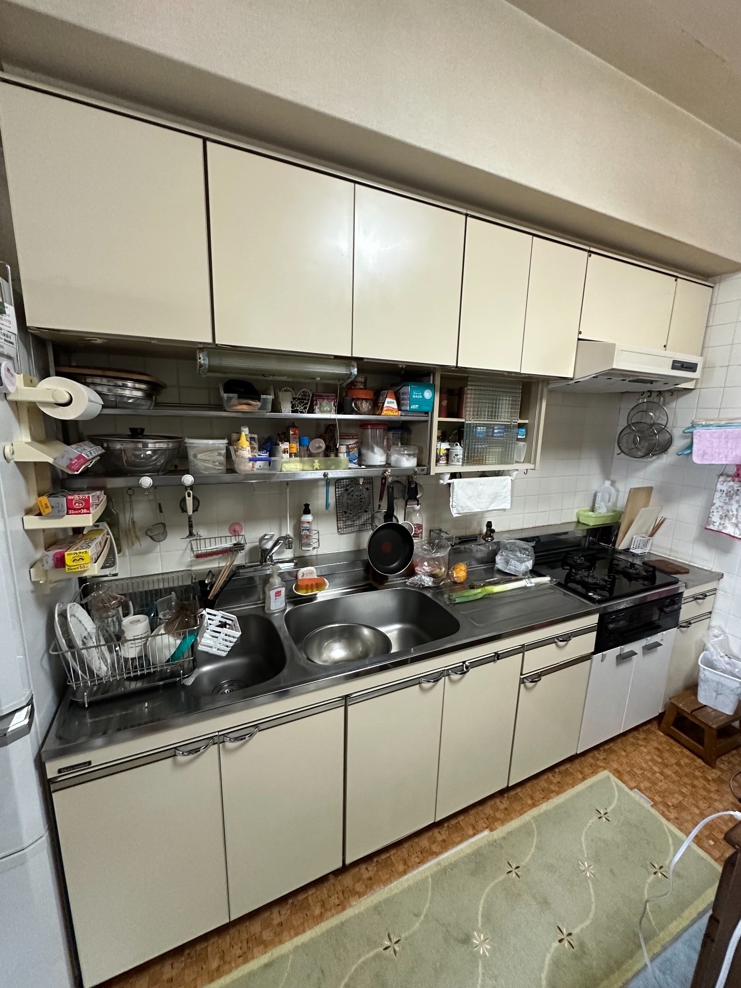 工事詳細 | キッチンリフォーム/床CF張り ・扉:スライド(アコードホワイト) ・キッチンパネル:クリアホワイト ・ワークトップ:ステンレス ・シンク:ステンレス ・コンロ:ガラストップ3口 ・レンジフード:フラットスリム W900 ・水栓:引き出しホース付き |