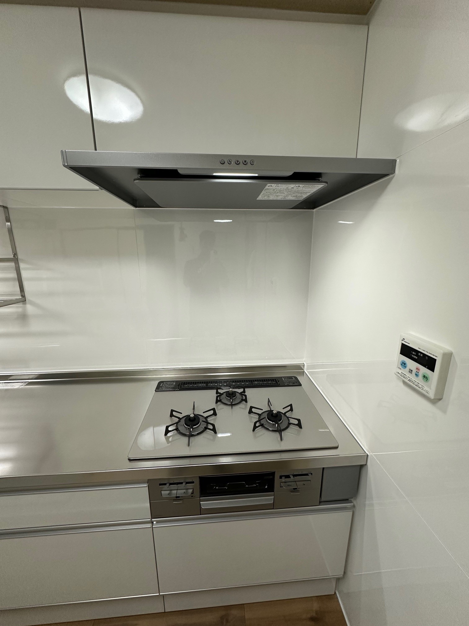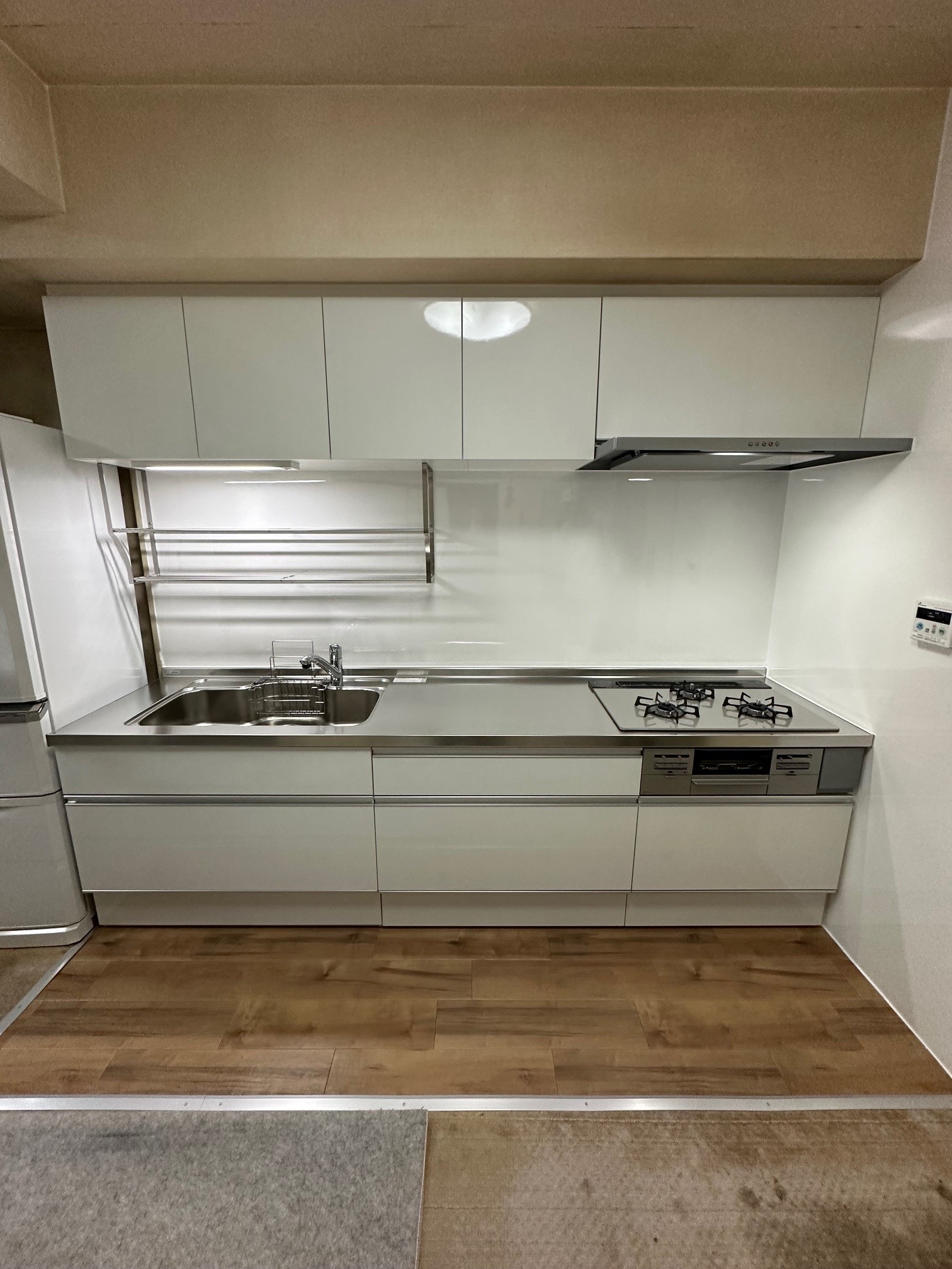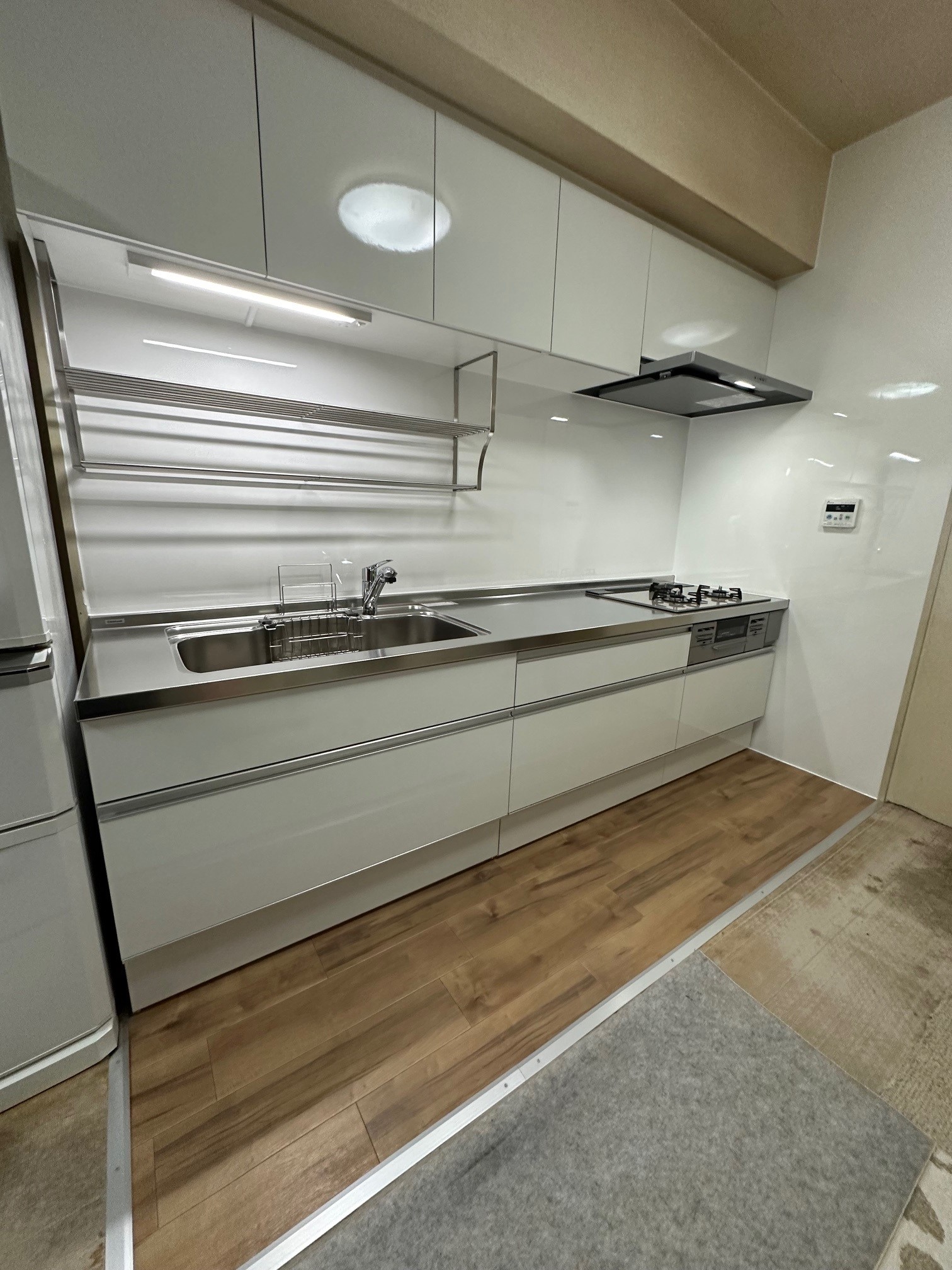 工事詳細 | キッチンリフォーム/床CF張り ・扉:スライド(アコードホワイト) ・キッチンパネル:クリアホワイト ・ワークトップ:ステンレス ・シンク:ステンレス ・コンロ:ガラストップ3口 ・レンジフード:フラットスリム W900 ・水栓:引き出しホース付き |