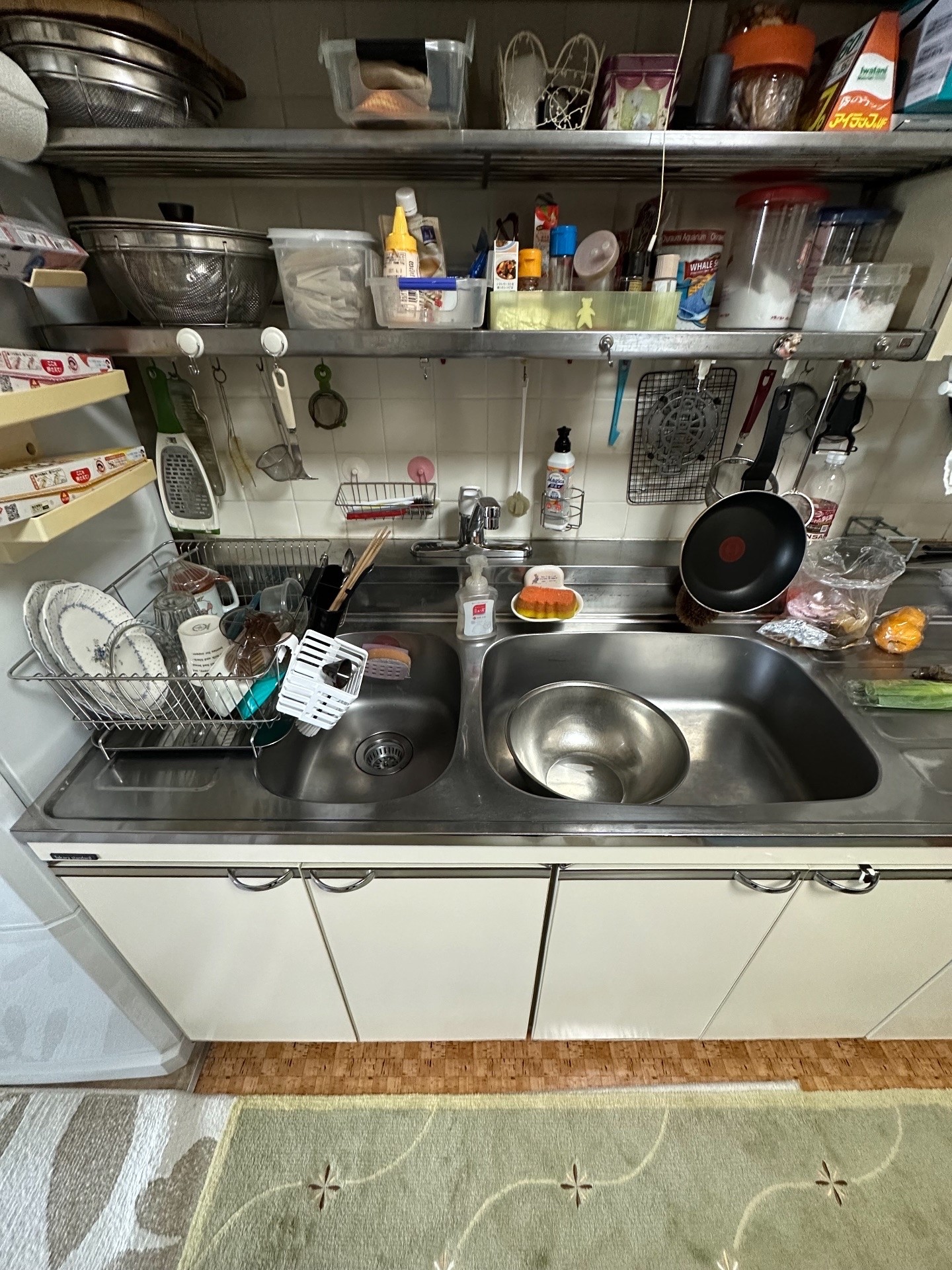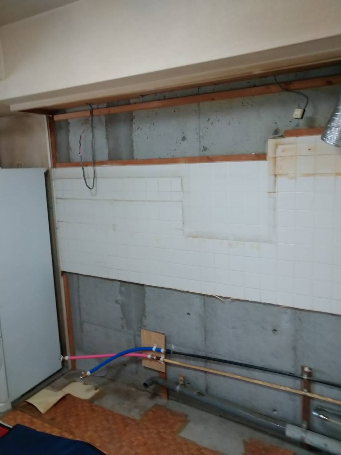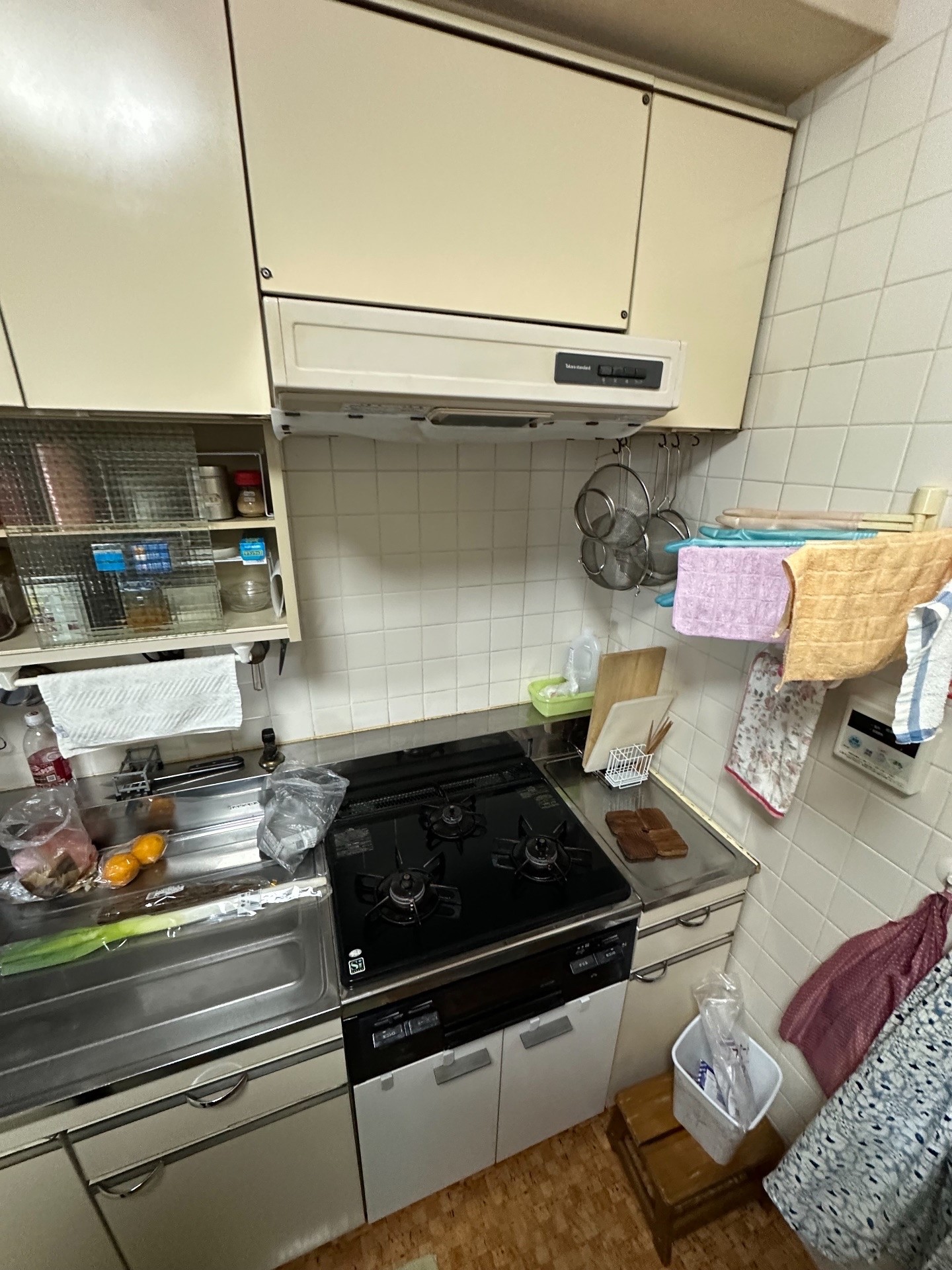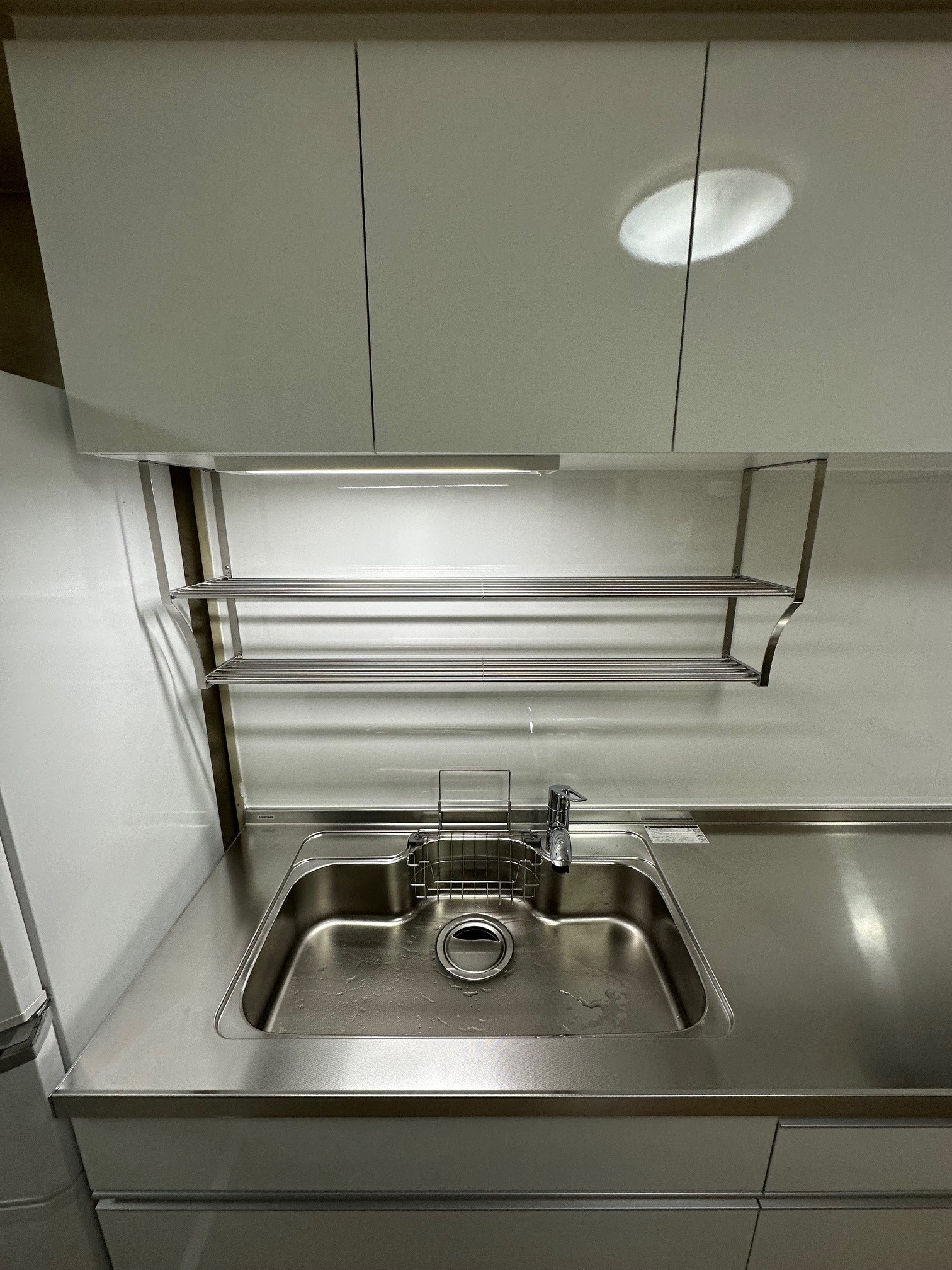 工事詳細 | キッチンリフォーム/床CF張り ・扉:スライド(アコードホワイト) ・キッチンパネル:クリアホワイト ・ワークトップ:ステンレス ・シンク:ステンレス ・コンロ:ガラストップ3口 ・レンジフード:フラットスリム W900 ・水栓:引き出しホース付き |