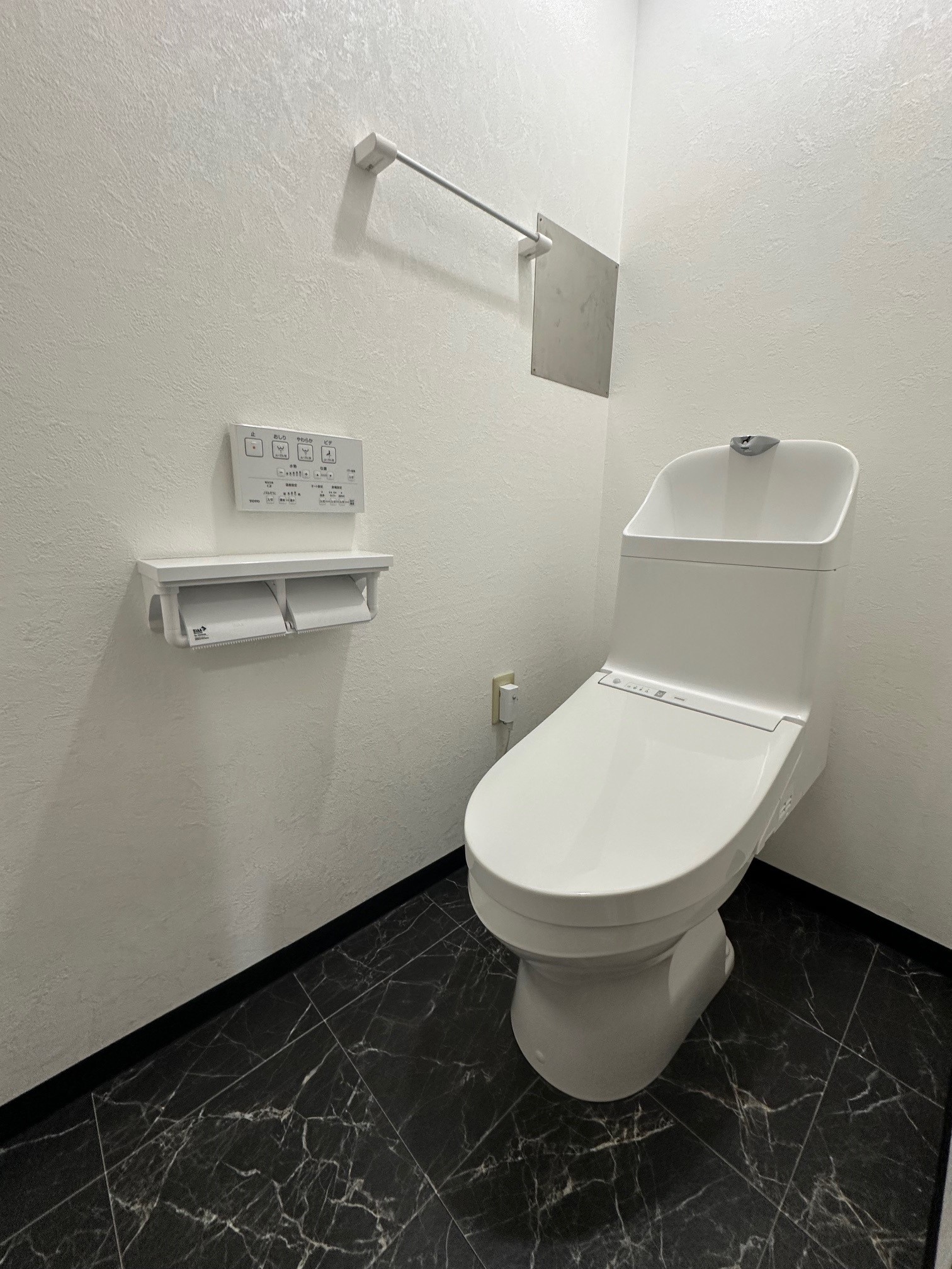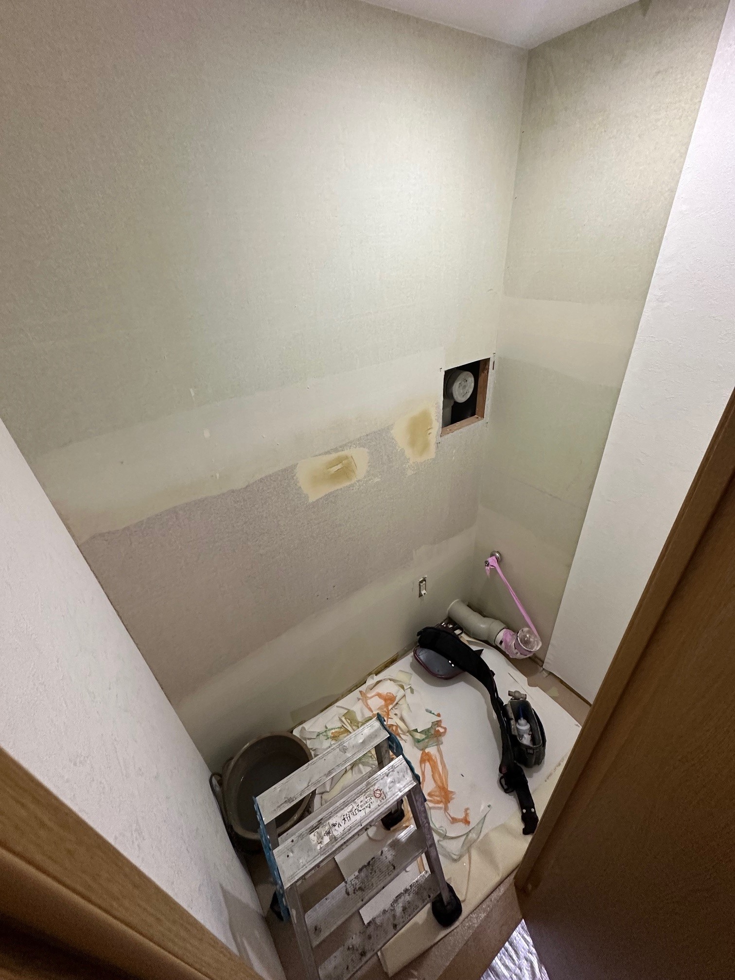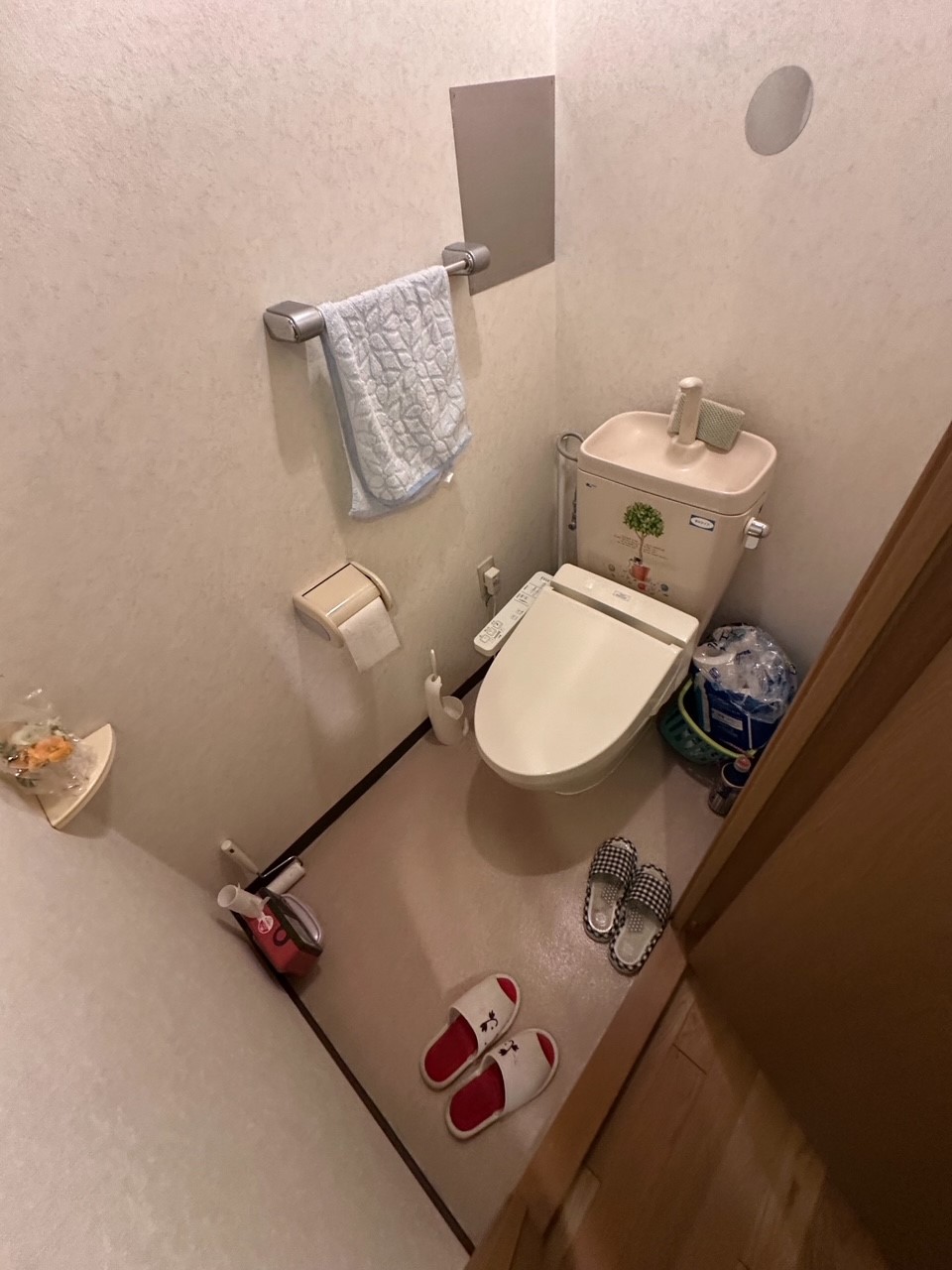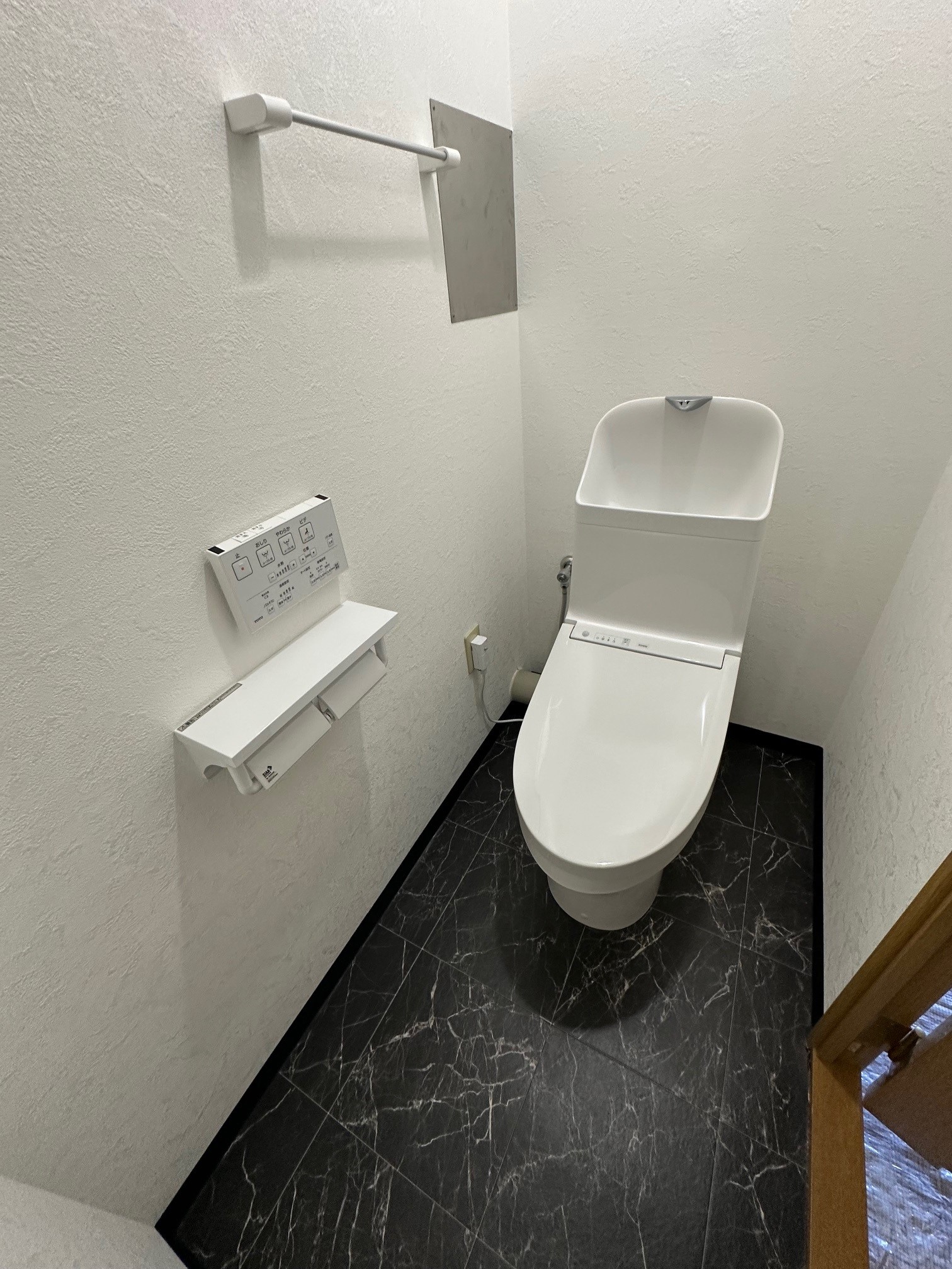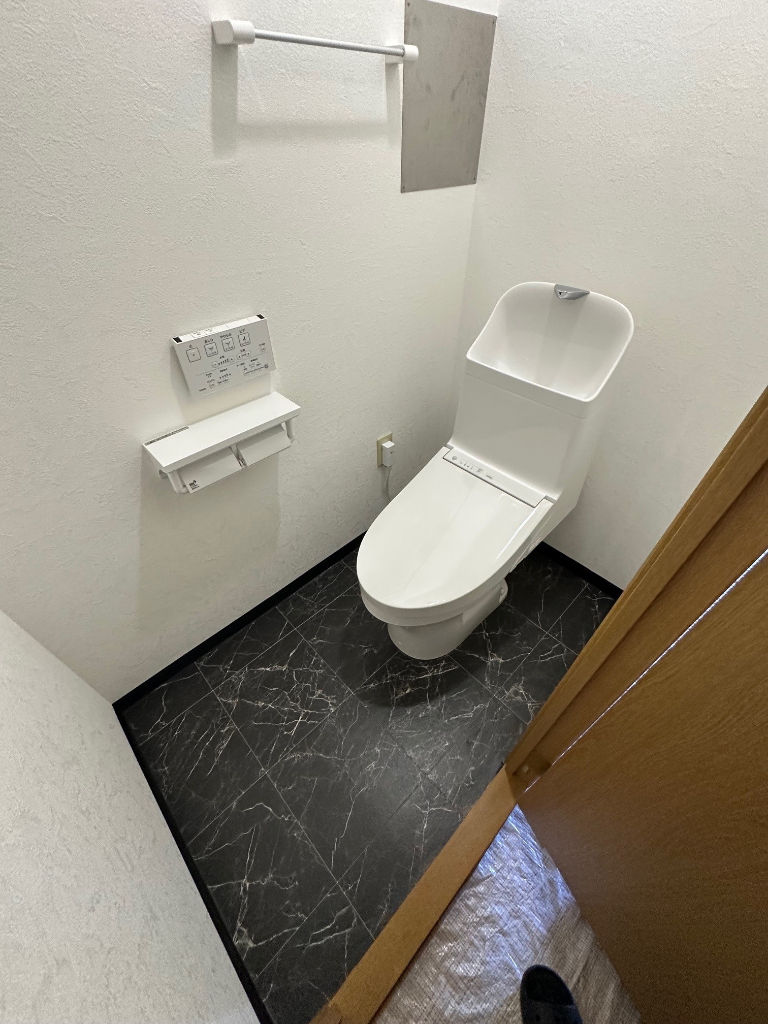 工事詳細 | トイレリフォーム ・クロス貼り変え ・ソフト巾木張り替え ・床CF貼り ・ペーパーホルダー交換 ・タオル掛け交換 ・コンセント交換 ・トイレ入れ替え |