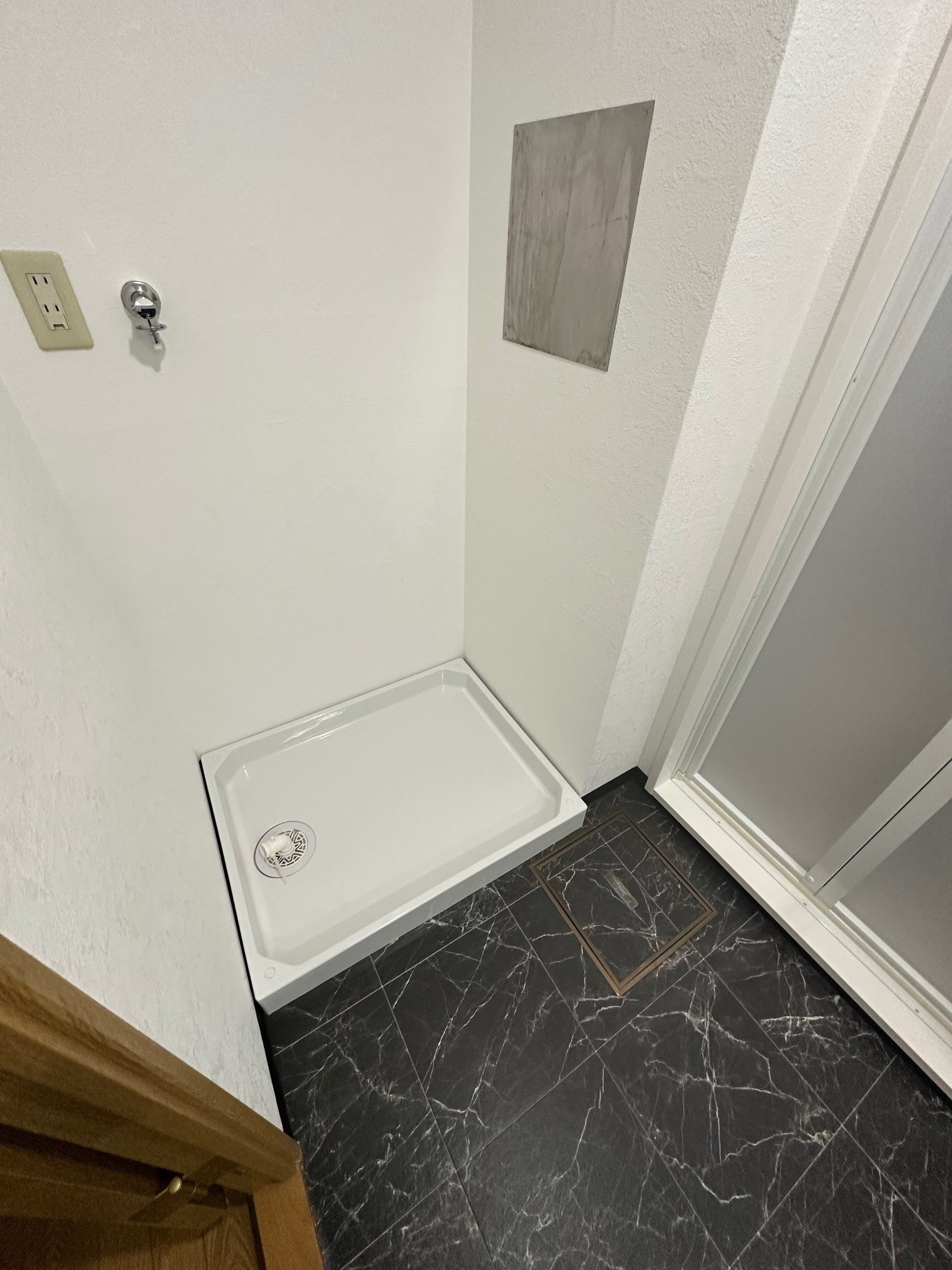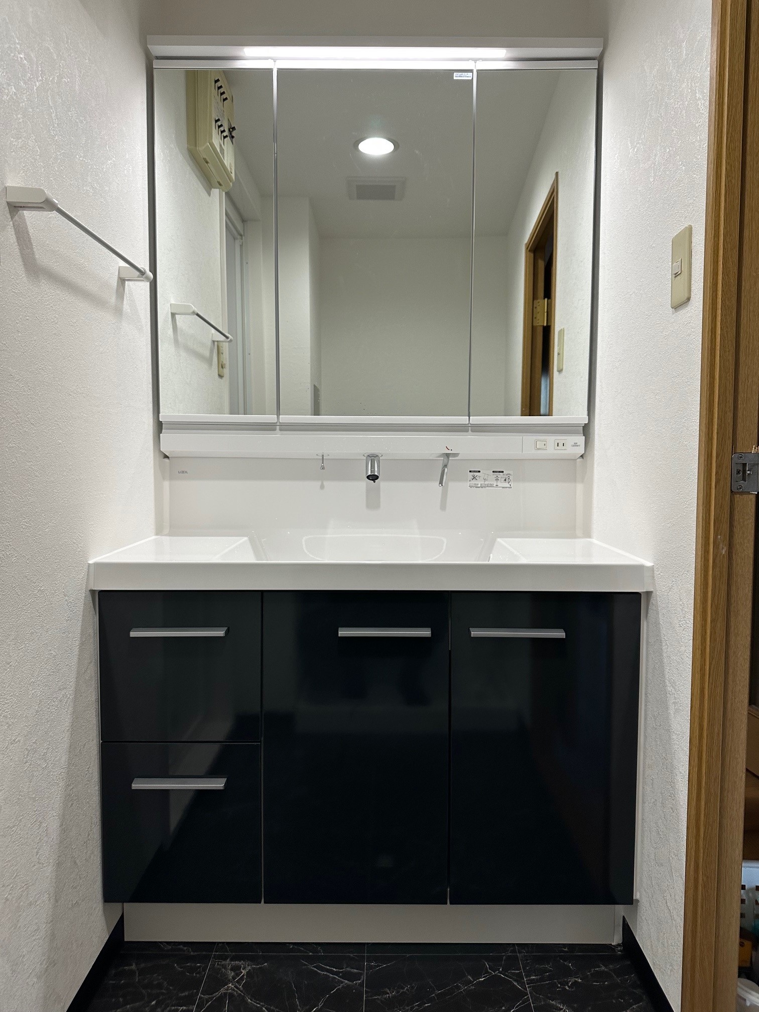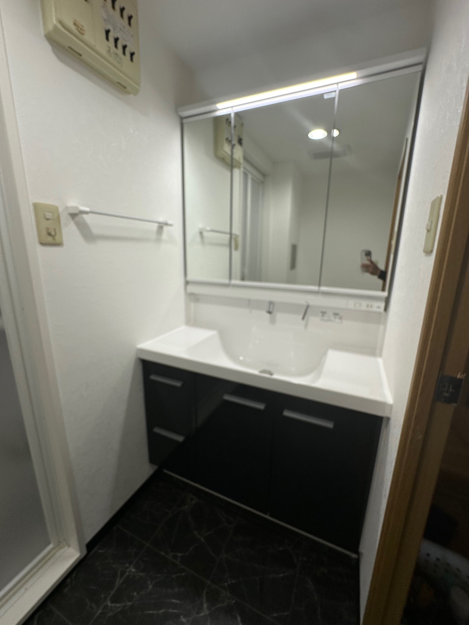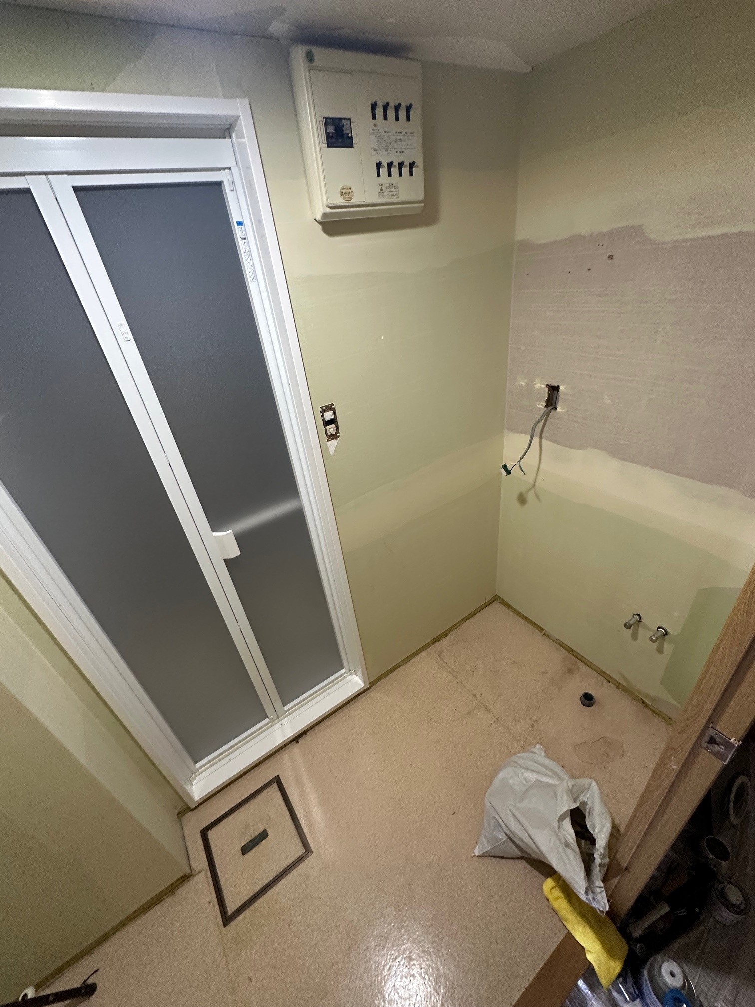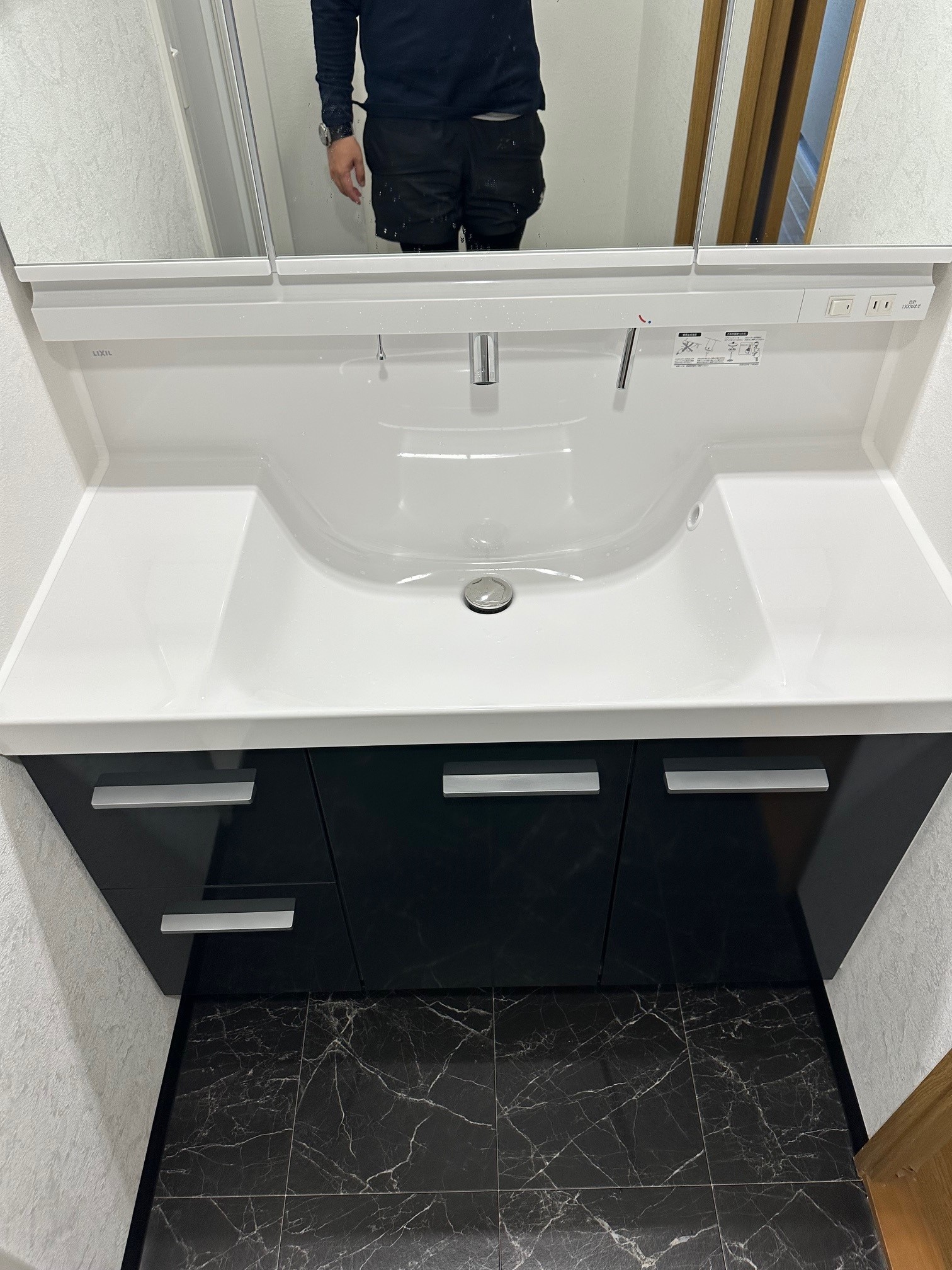工事詳細 | 洗面室リフォーム ・洗面台取り替え ・クロス貼り替え ・床CF貼り替え ・ソフト巾木貼り替え ・防水パン交換 ・タオル掛け交換 ・換気カバー交換 |