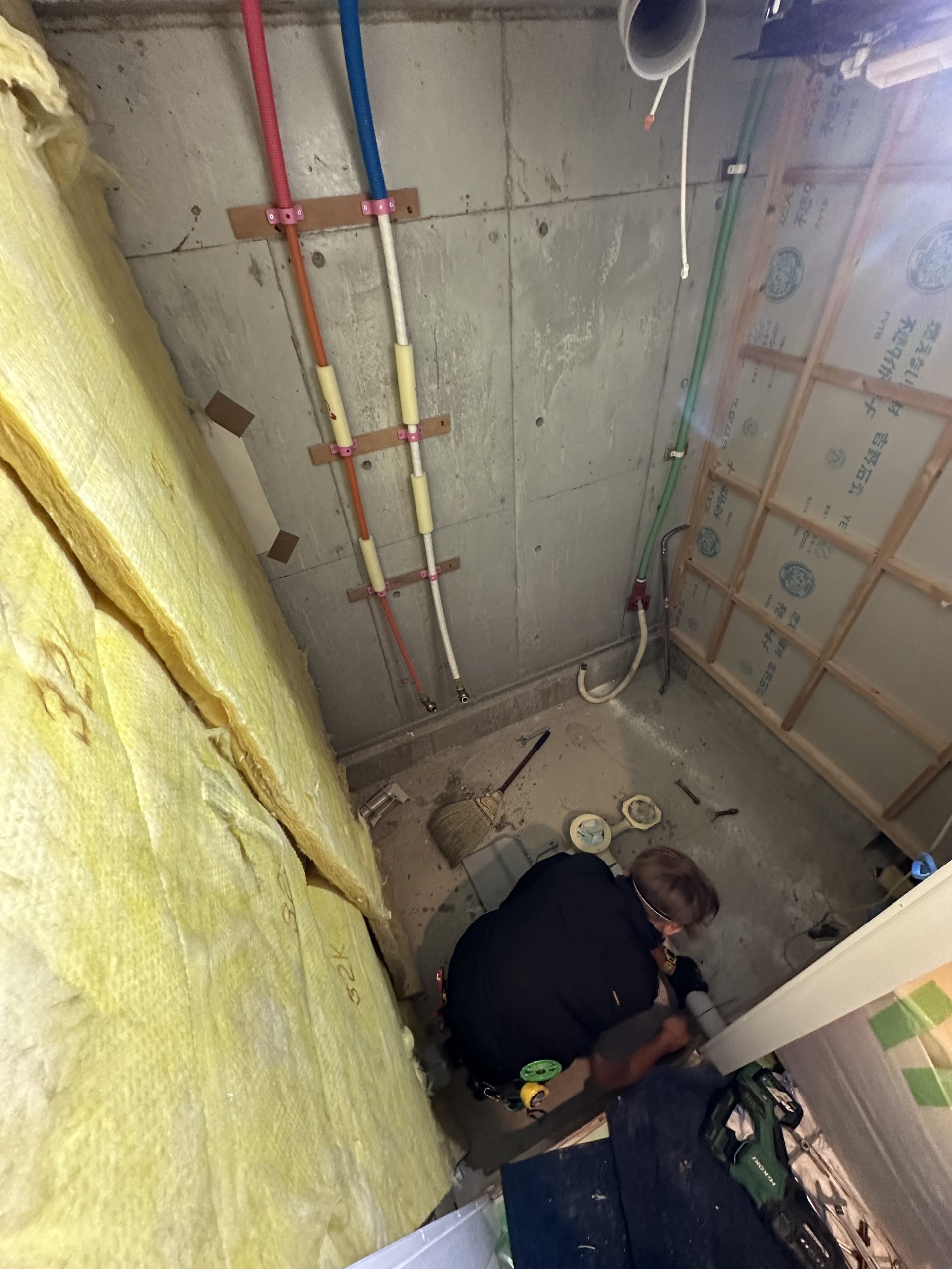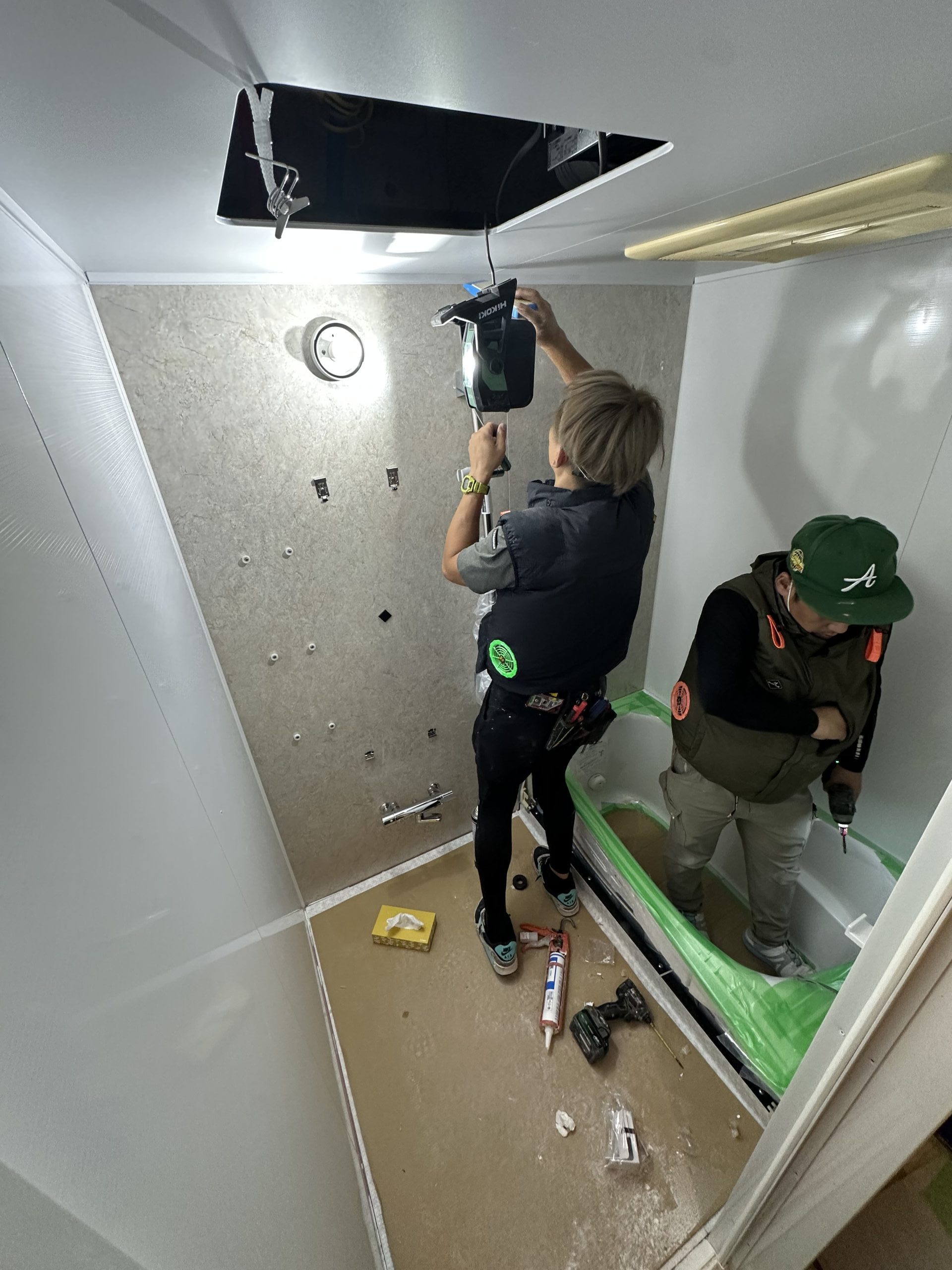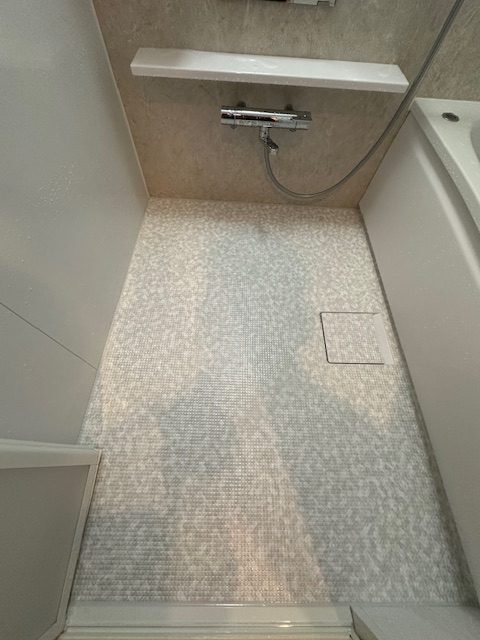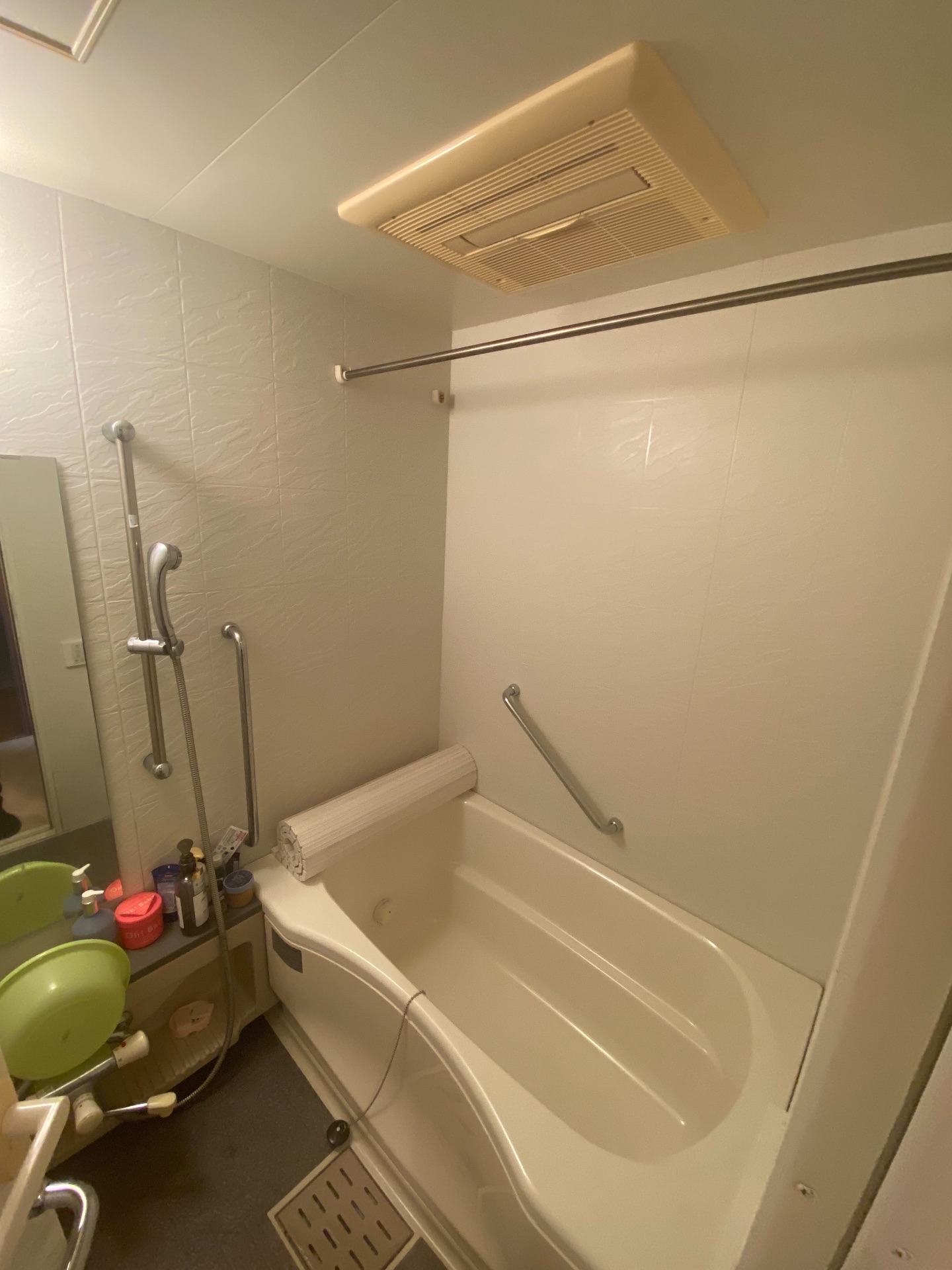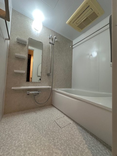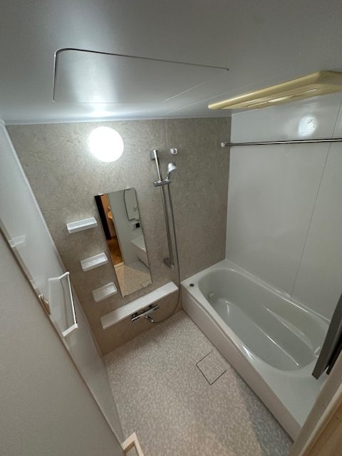 工事詳細 | 浴室改修工事 ・アクセントパネル:フロールベージュ ・周辺パネル:プリエホワイト ・浴槽:ゆるリラ浴槽(ホワイト) ・カウンター:ホワイト ・床:ほっカラリ床(ホワイト ラグ調) ・換気扇:現状使用 ・シャワーヘッド:ミラブル潤 |