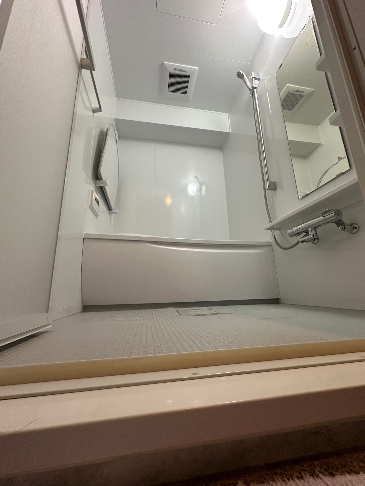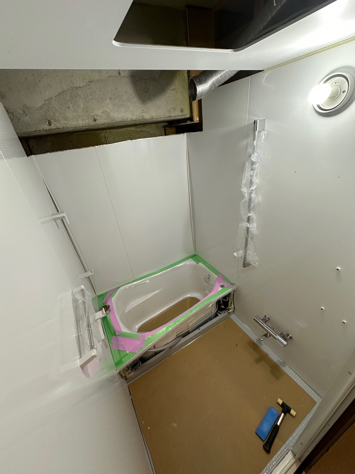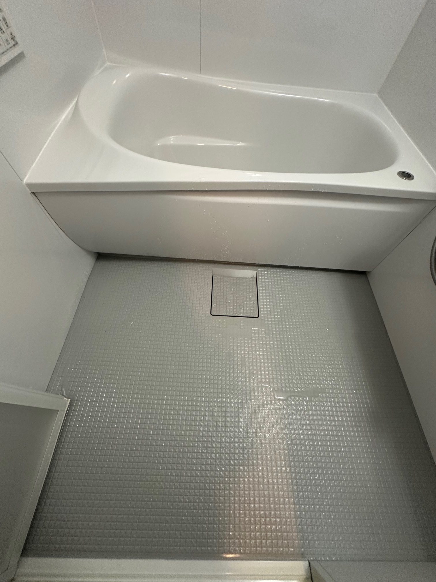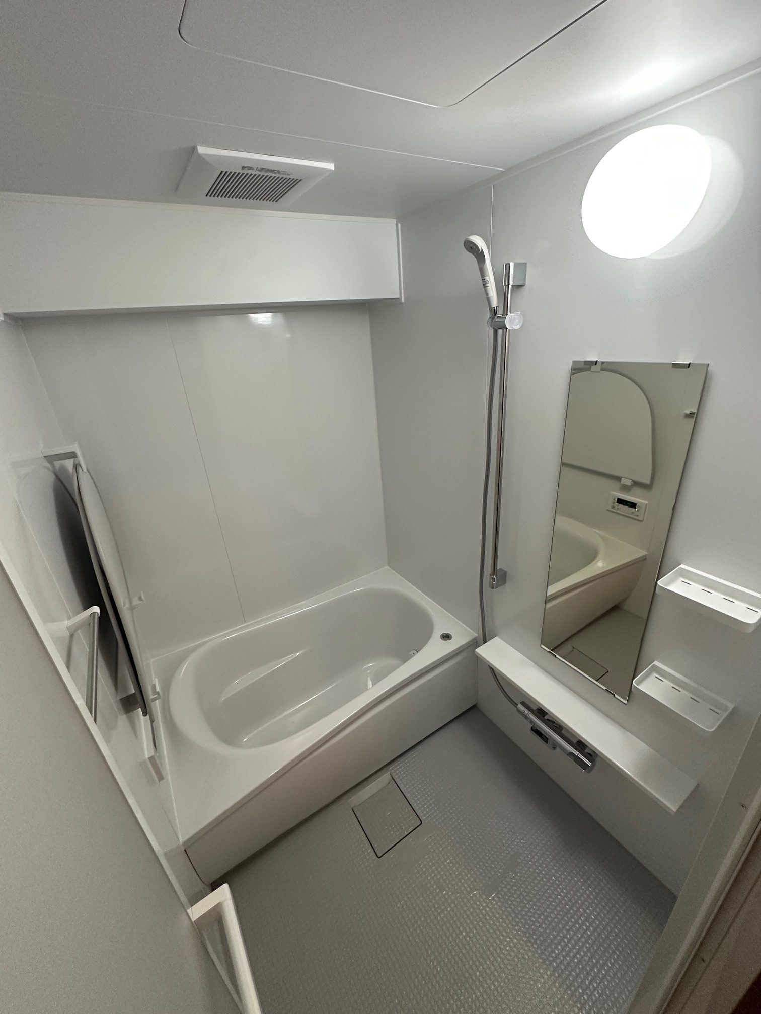 | 工事詳細 | 浴室改修工事 ・周辺パネル:プリエホワイト ・浴槽:ゆるリラ浴槽(ホワイト) ・カウンター:ホワイト ・床:カラリ床(ライトグレー) |