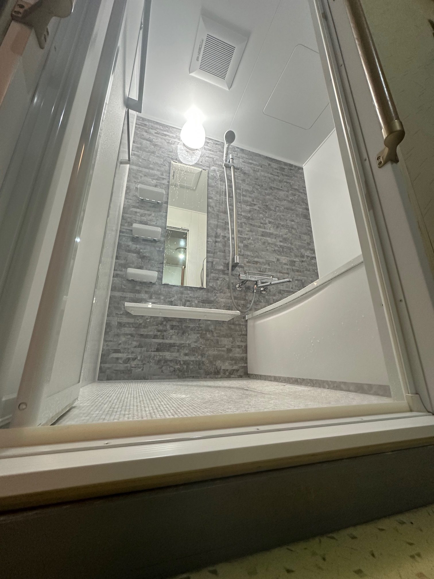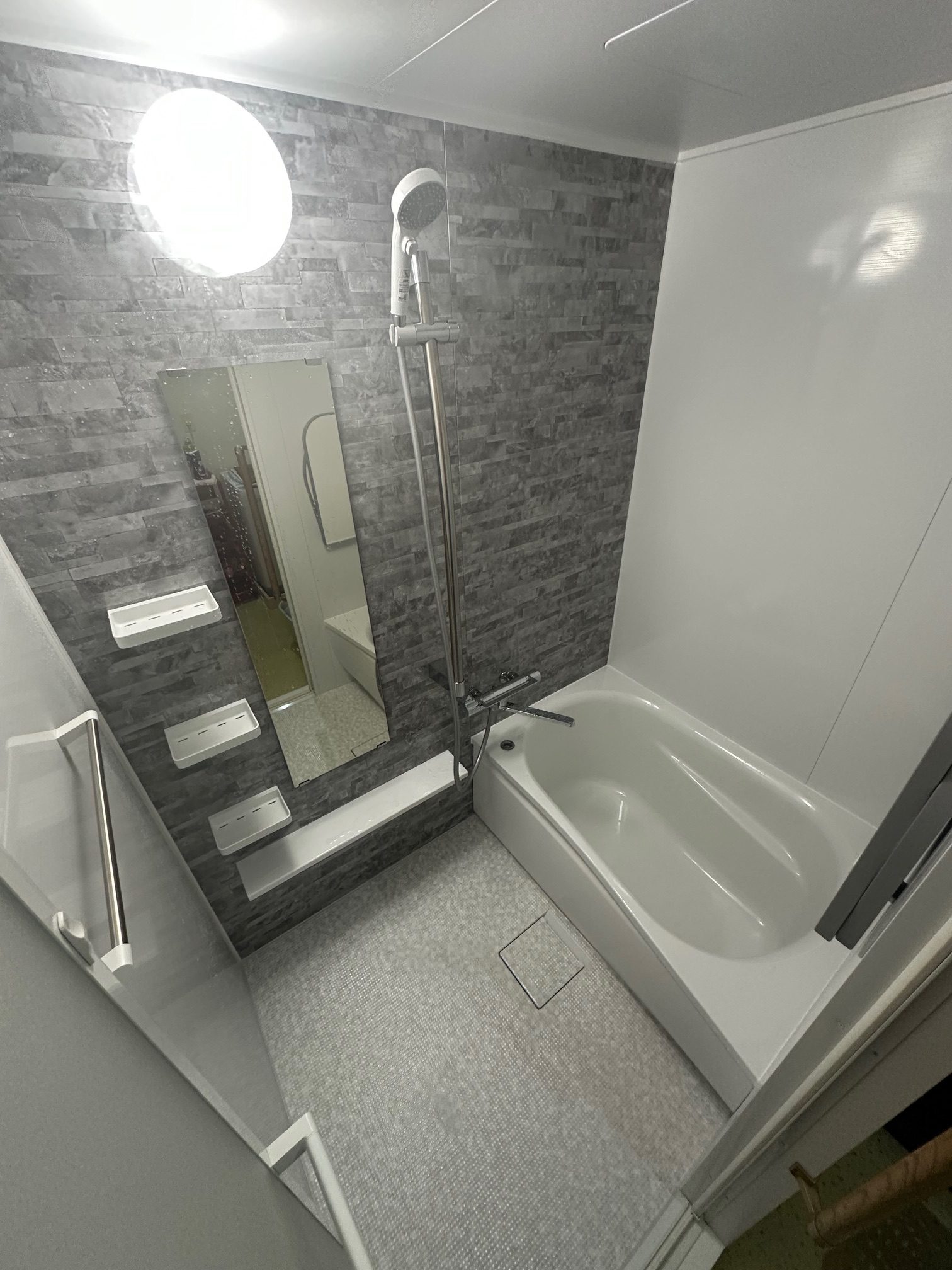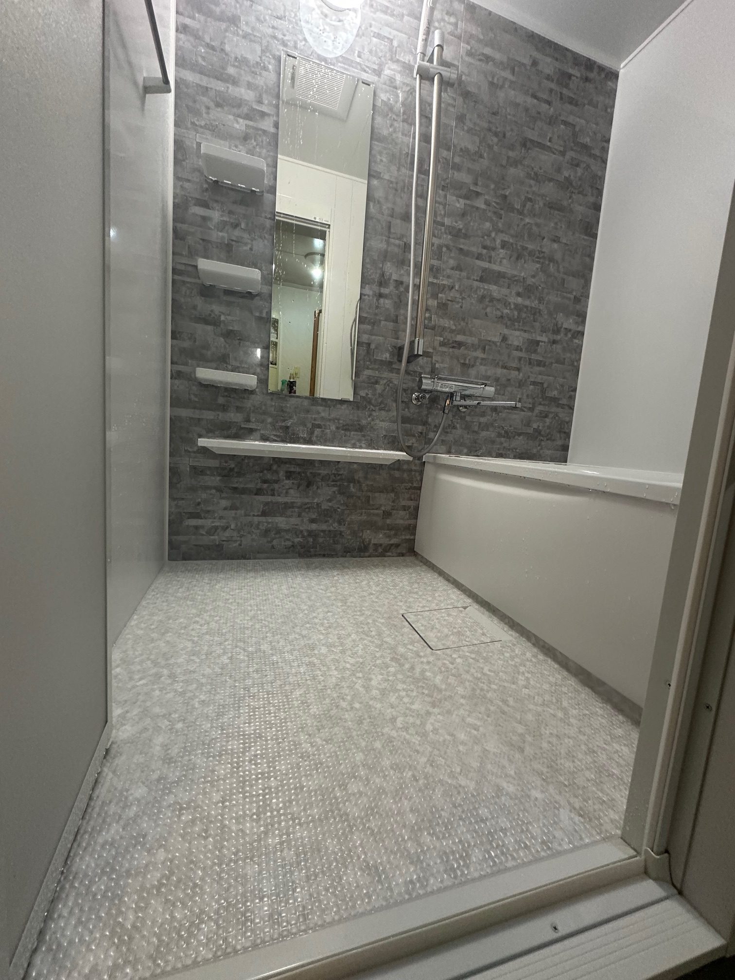工事詳細 | 浴室改修工事 ・アクセントパネル:クレアライトグレー ・周辺パネル:プリエホワイト ・浴槽:ラウンド浴槽(ホワイト) ・カウンター:ホワイト ・床:ほっカラリ床(ホワイト ラグ調) |