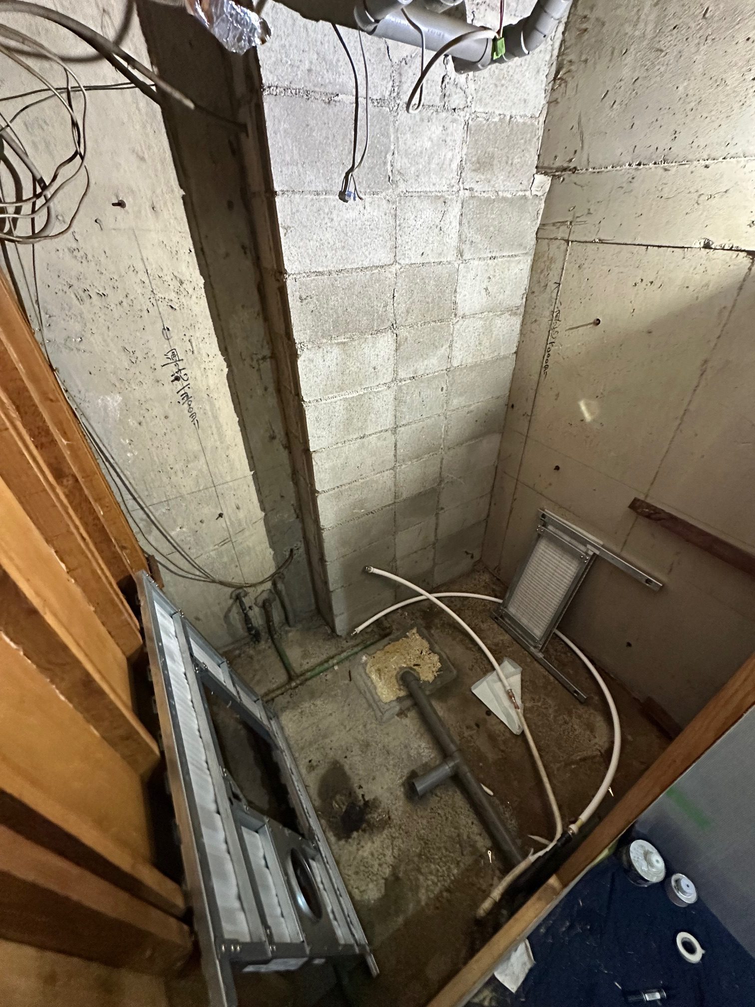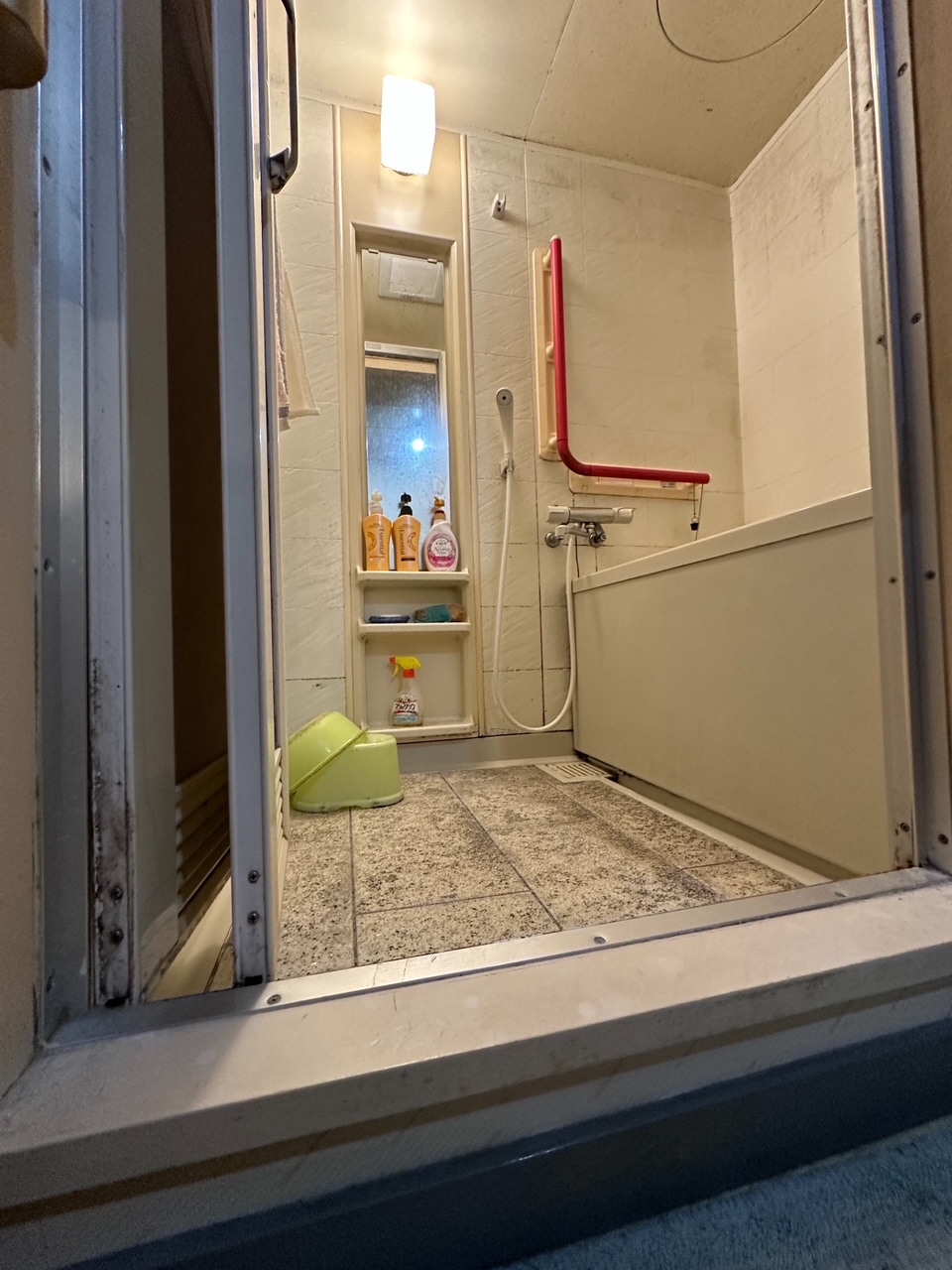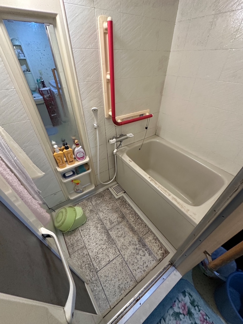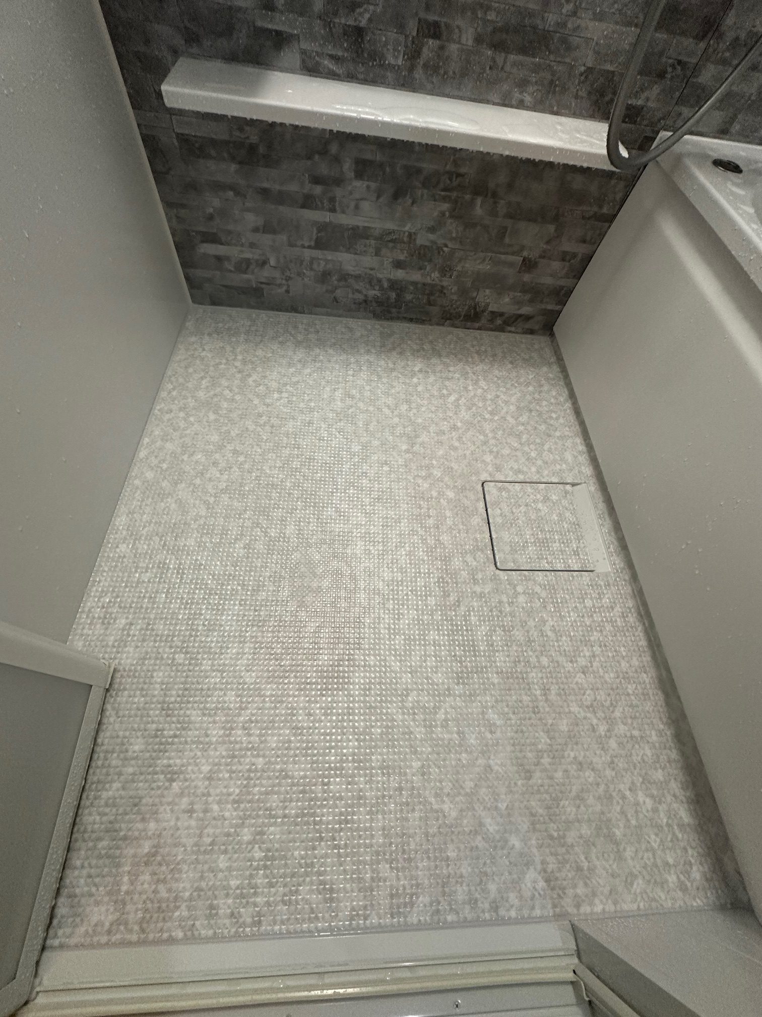 工事詳細 | 浴室改修工事 ・アクセントパネル:クレアライトグレー ・周辺パネル:プリエホワイト ・浴槽:ラウンド浴槽(ホワイト) ・カウンター:ホワイト ・床:ほっカラリ床(ホワイト ラグ調) |