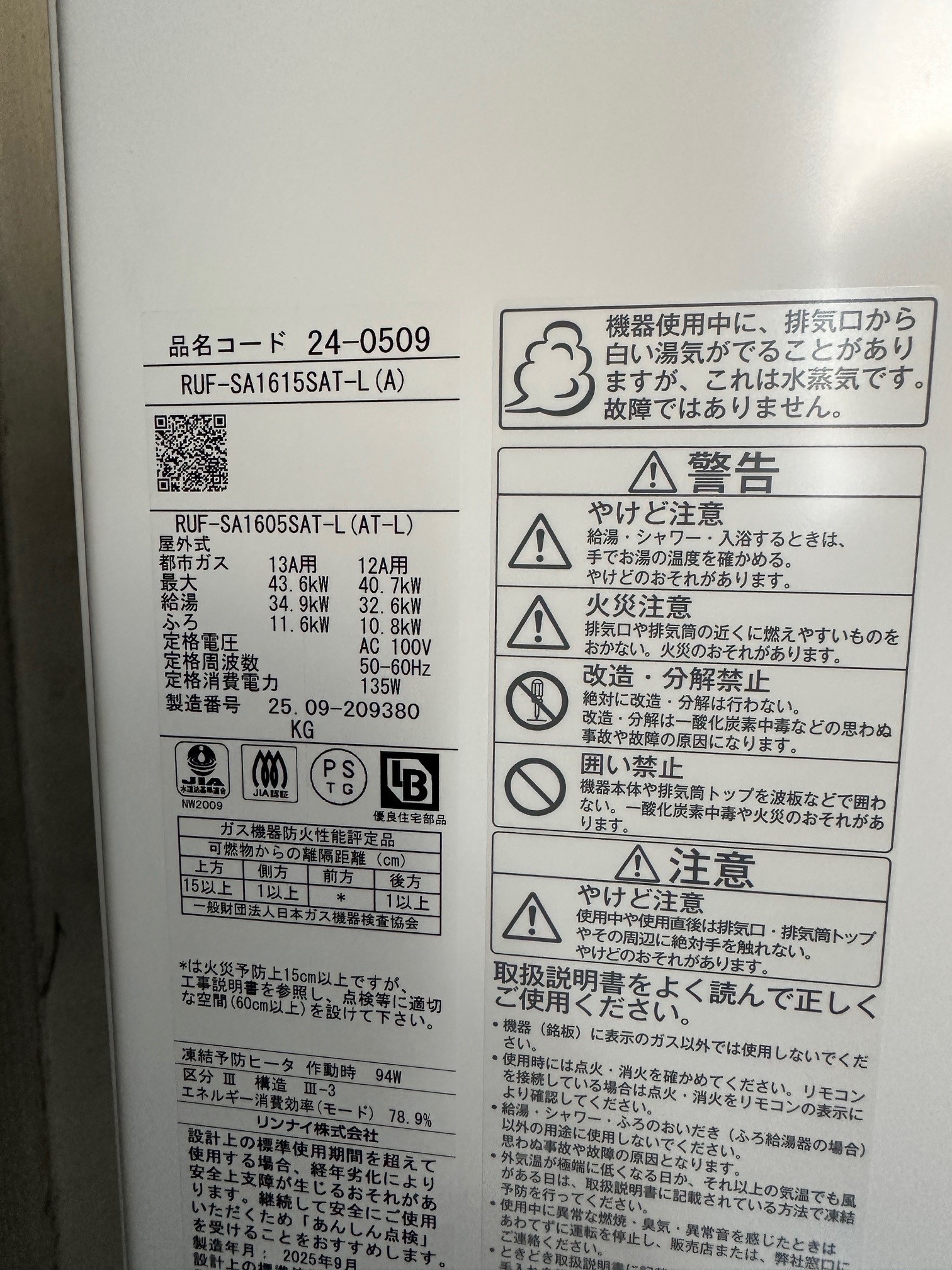 メーカー/型式 Rinnai/RUF-SA1615SAT-L
