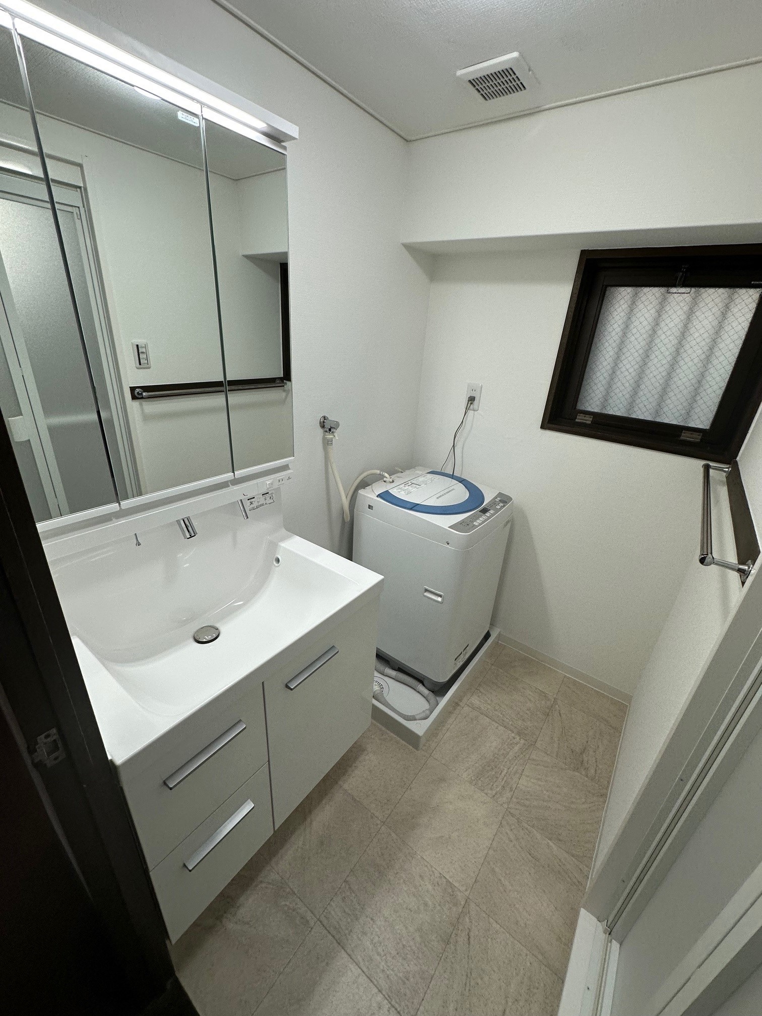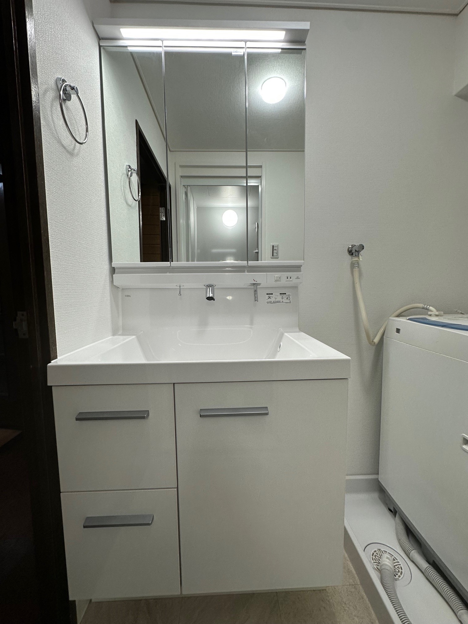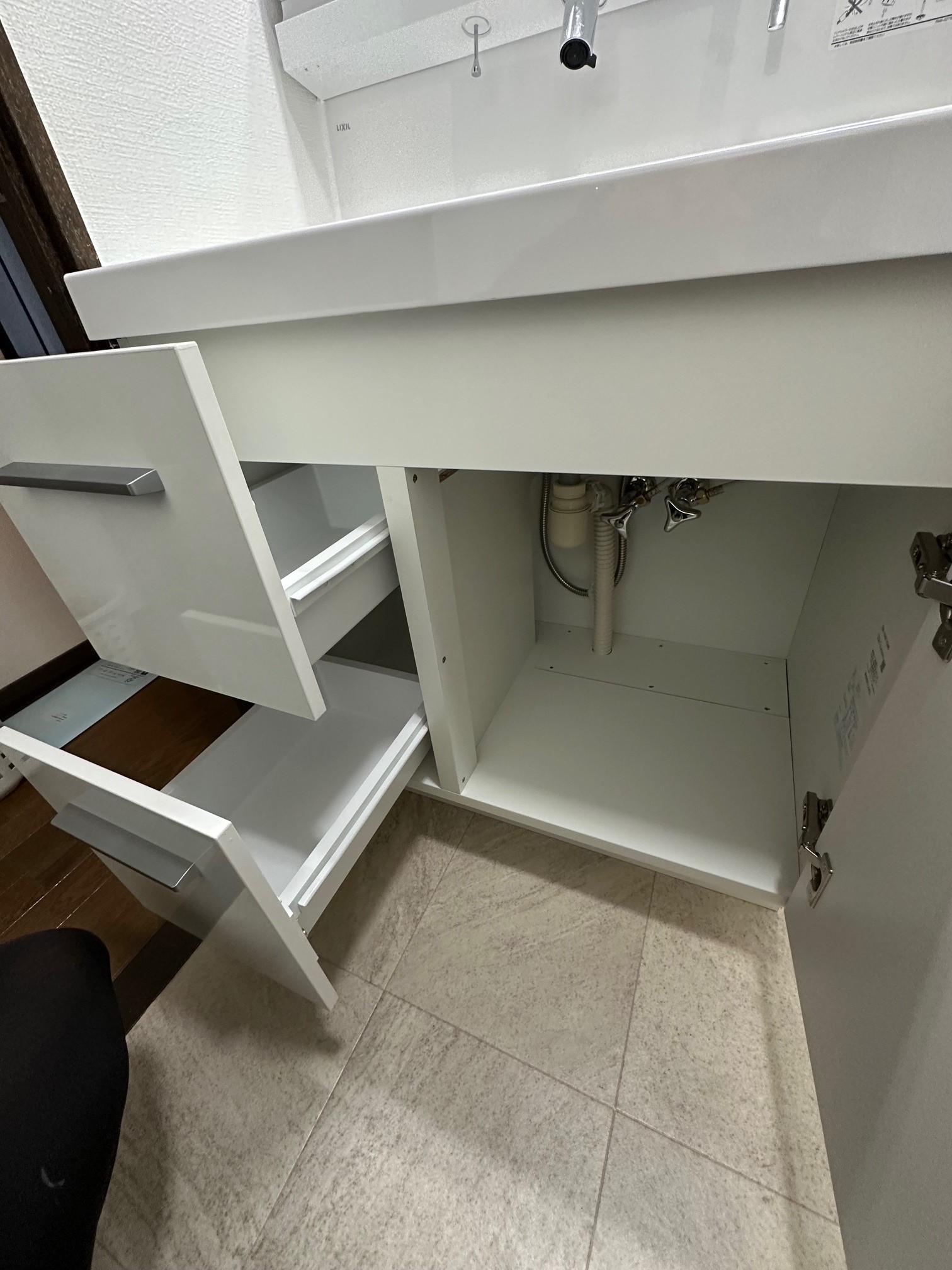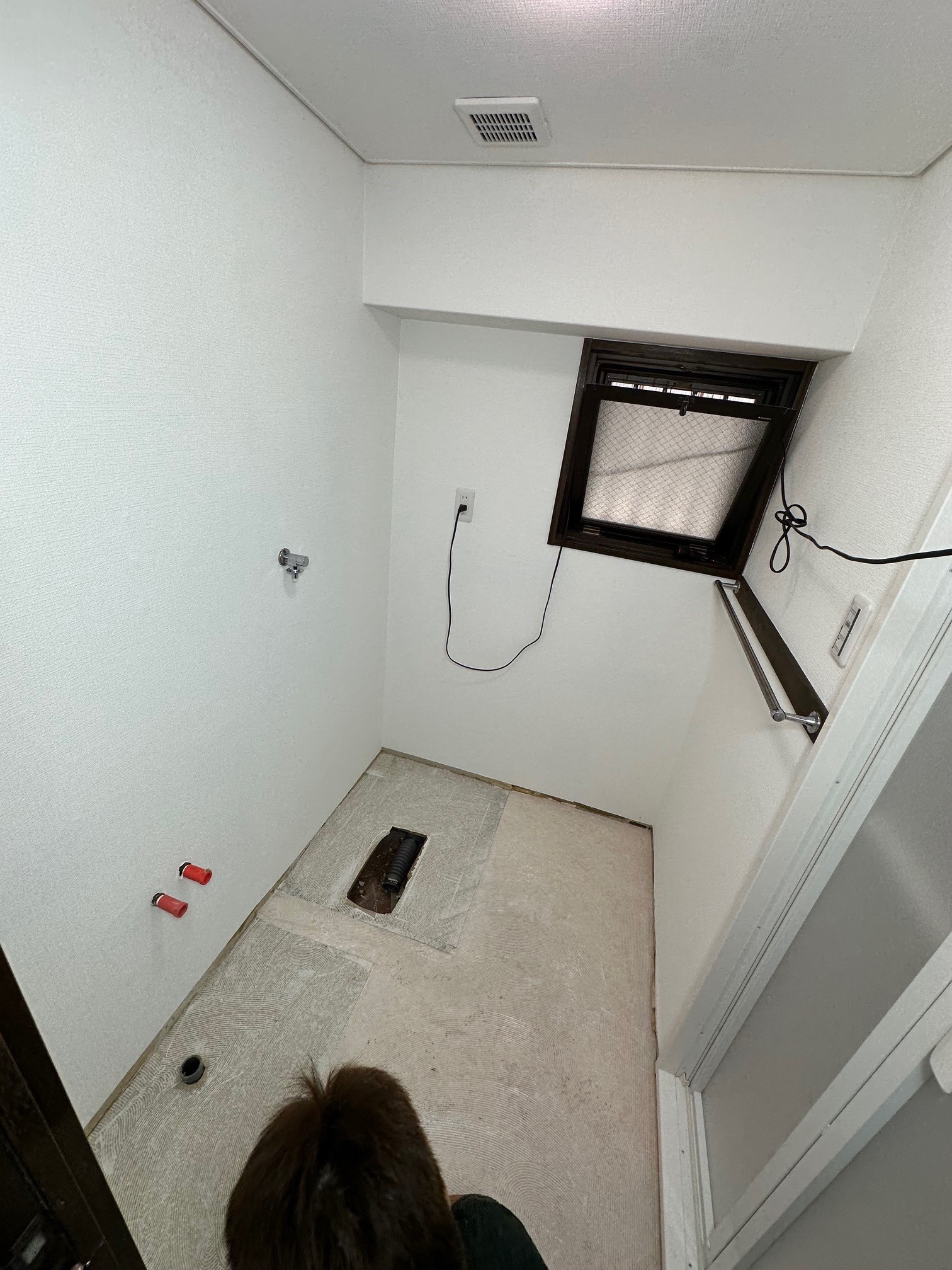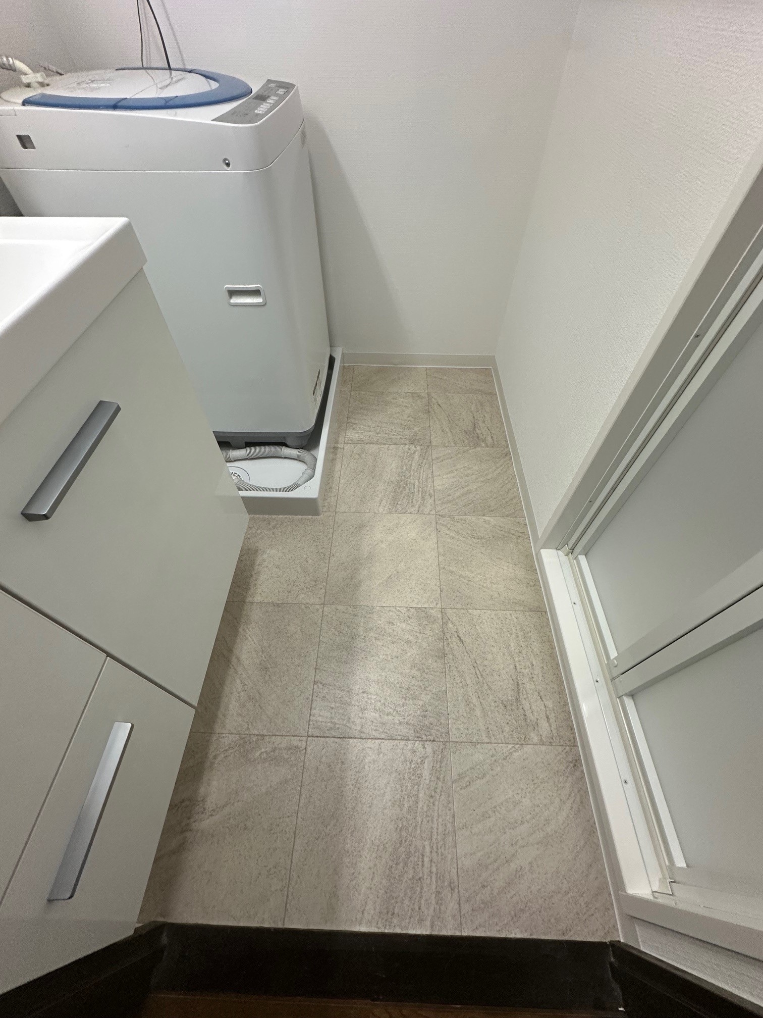 工事詳細 | 洗面室リフォーム ・洗面台取り替え ・クロス貼り替え ・床CF貼り替え ・ソフト巾木貼り替え ・防水パン交換 ・洗濯給水栓交換 ・換気カバー取り替え ・タオルリング設置 ・コンセント/スイッチ交換 |