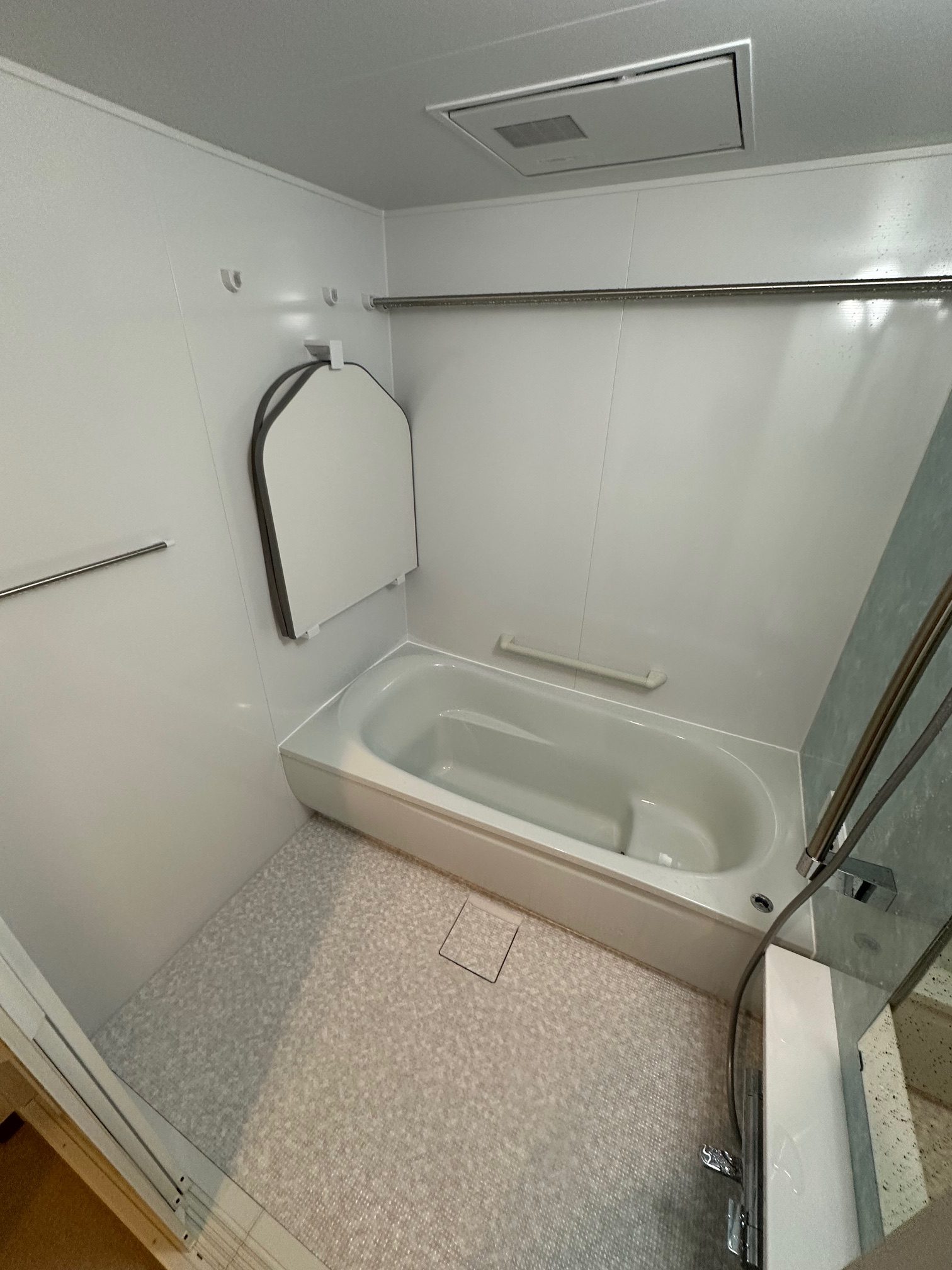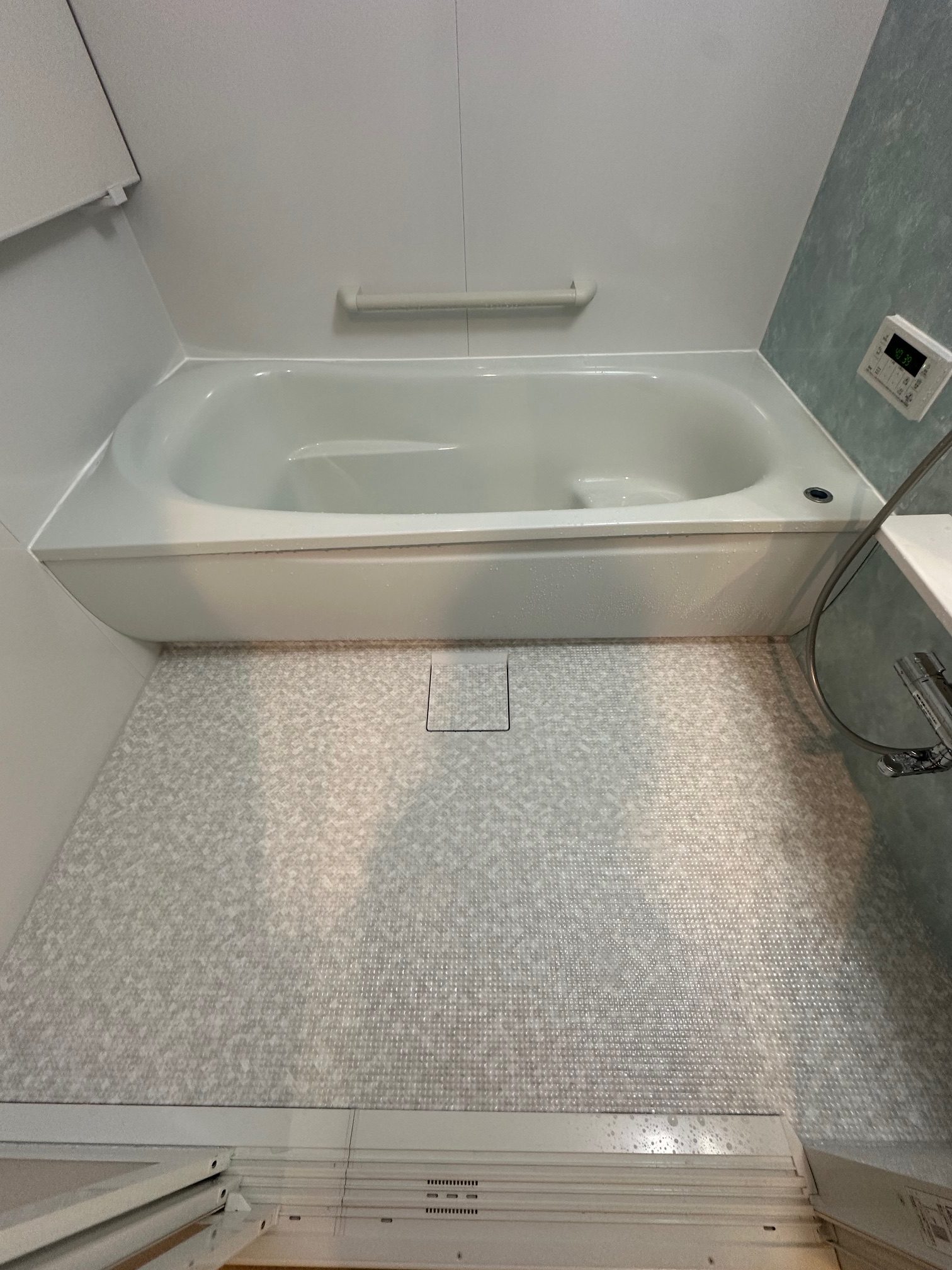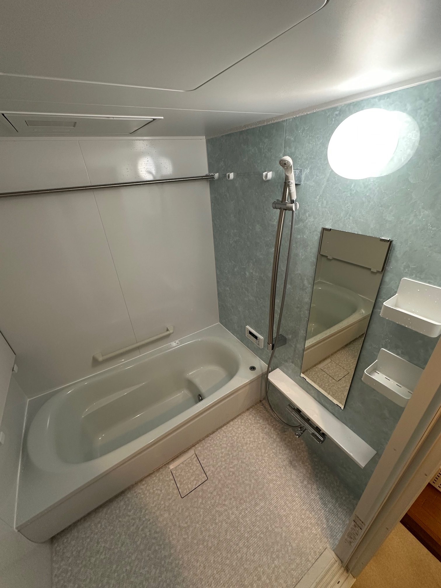 | 工事詳細 | 浴室改修工事 ・周辺パネル:プリエホワイト ・アクセントパネル:マテリアルアロマグリーン ・浴槽:ゆるリラ浴槽(アクアN) ・カウンター:ホワイト ・収納棚:マグネットタイプ(ホワイト) ・床:ほっカラリ床(ホワイト ラグ調) ・換気扇:三乾王 |