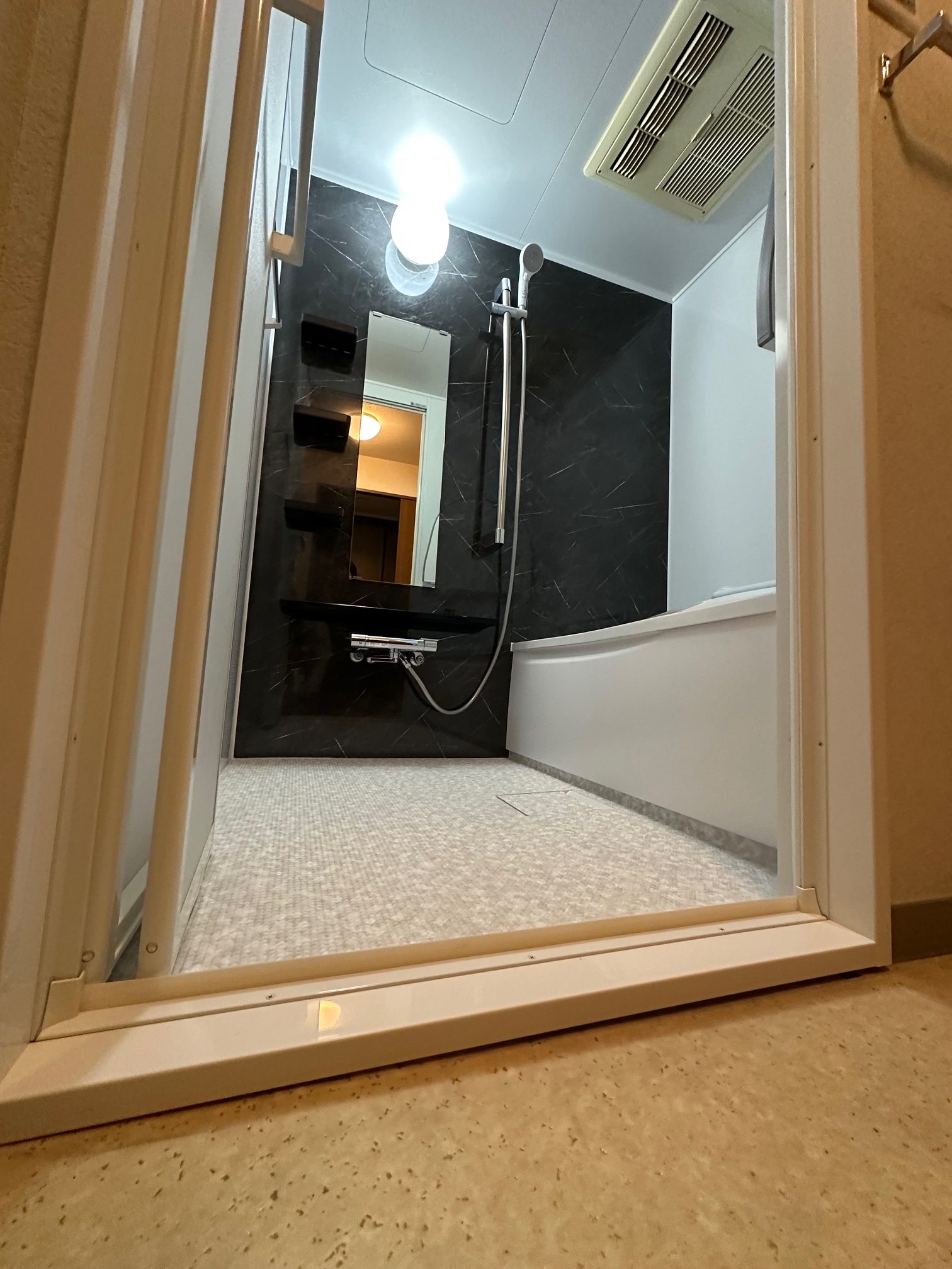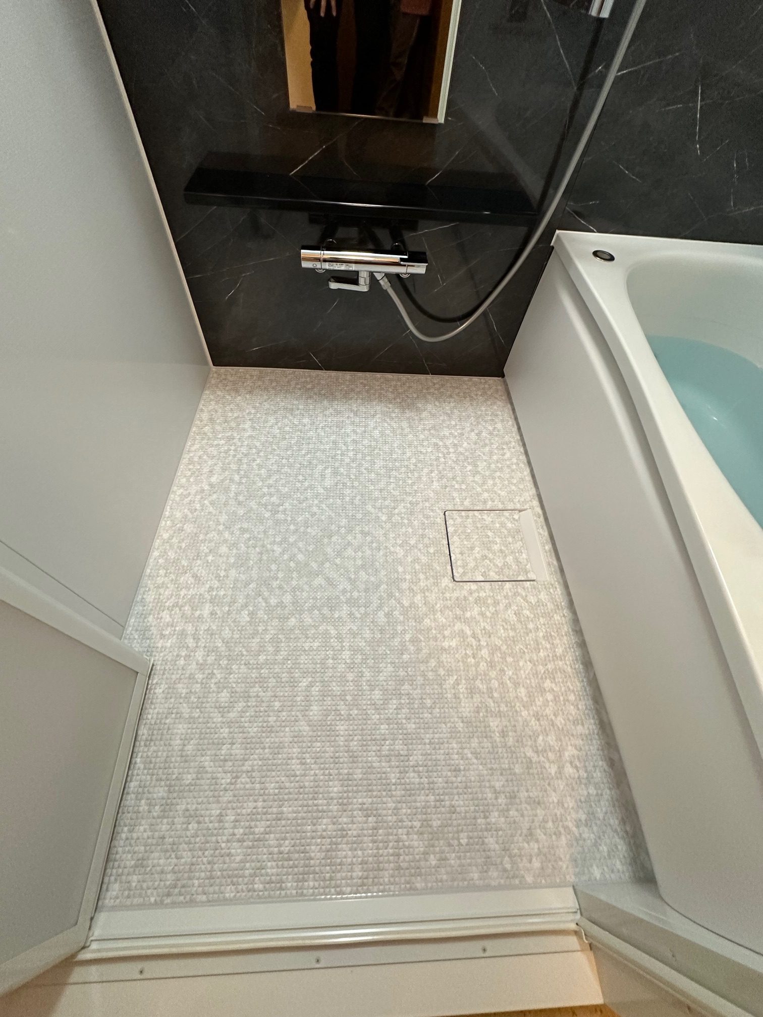| 工事詳細 | 浴室改修工事 ・周辺パネル:プリエホワイト ・アクセントパネル:マルキーナグレー ・浴槽:ゆるリラ浴槽(ホワイト) ・カウンター:ブラック ・床:ほっカラリ床(ホワイト ラグ調) ・換気扇:現状使用 |