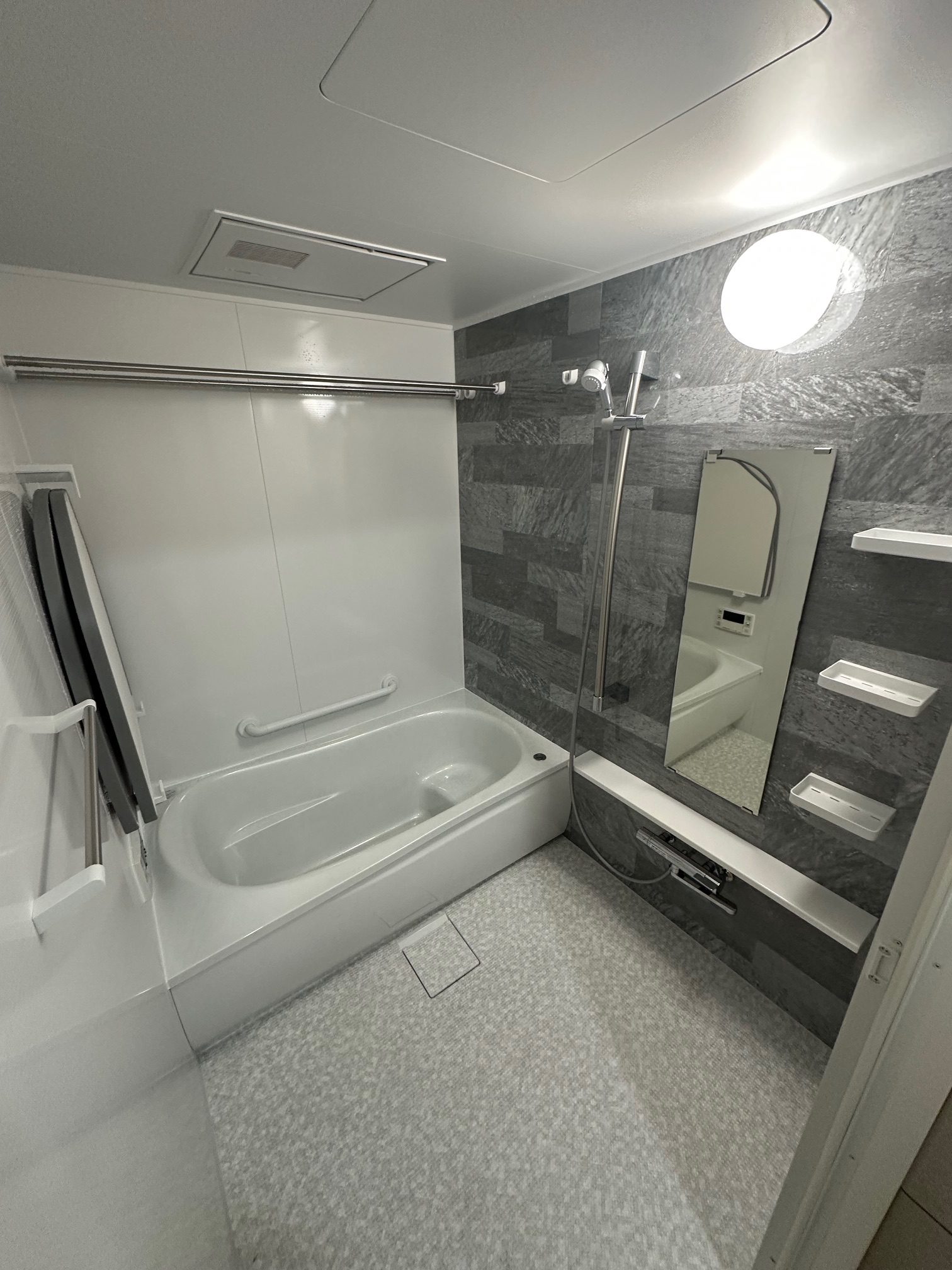 | 工事詳細 | 浴室改修工事 ・周辺パネル:プリエホワイト ・アクセントパネル:プラナスグレーウッド ・浴槽:ゆるリラ浴槽(ホワイト) ・カウンター:ホワイト ・床:カラリ床(ライトグレー) |