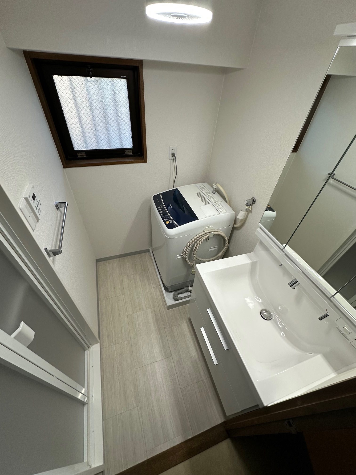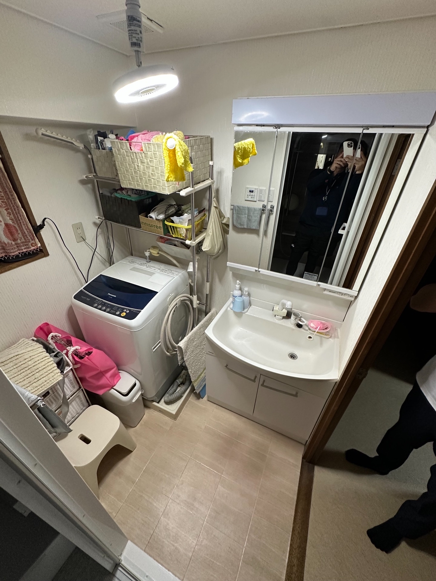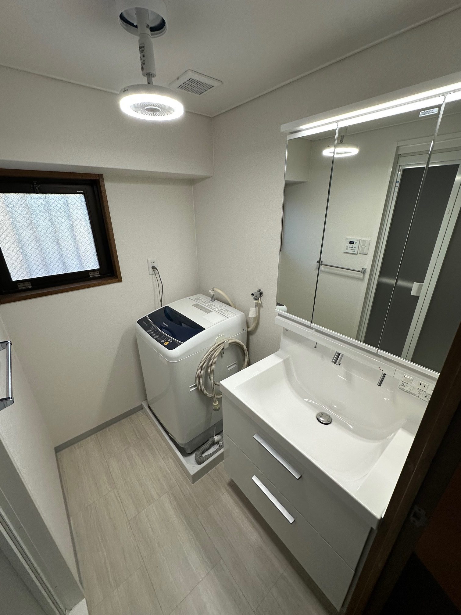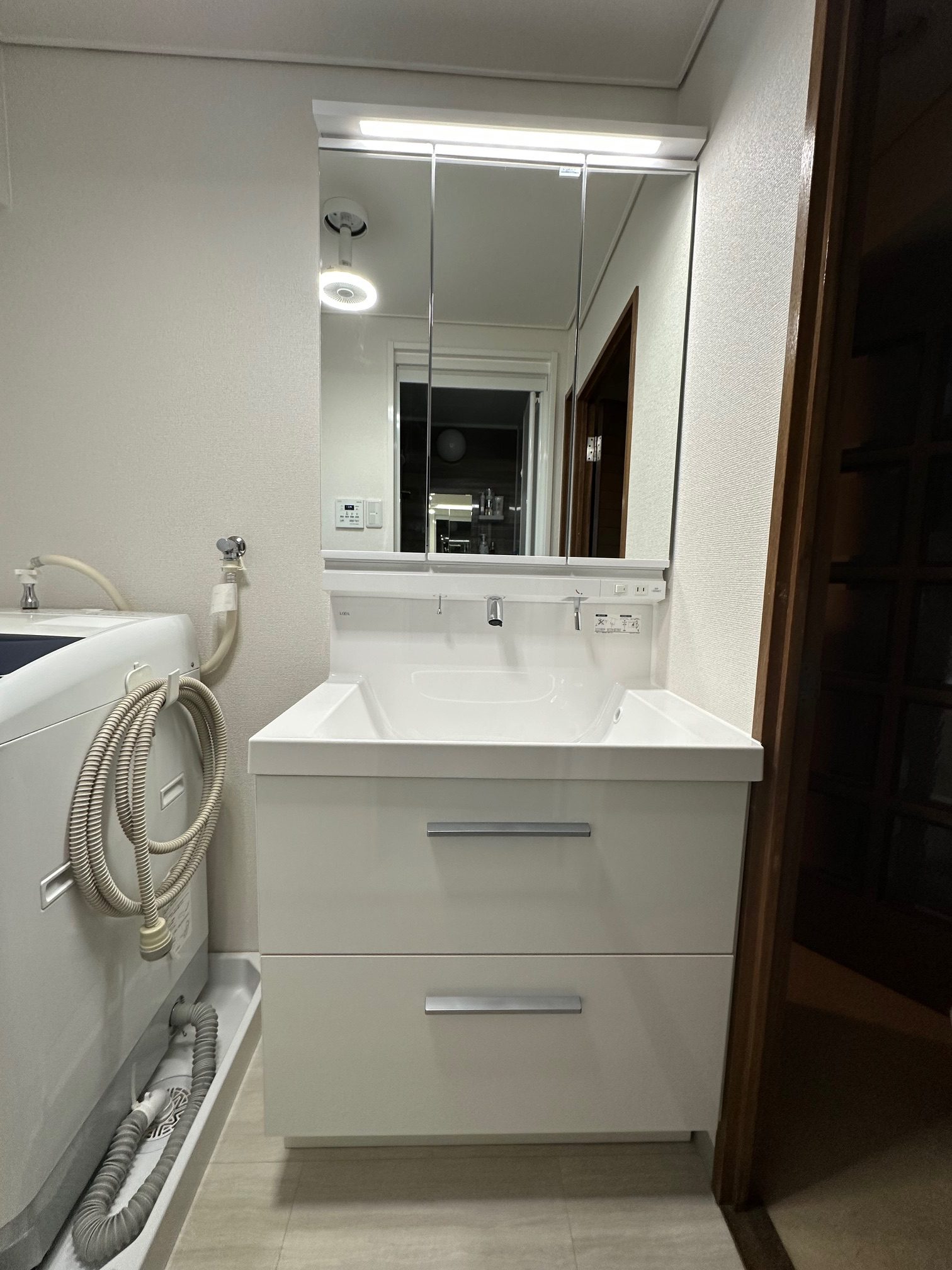 | 工事詳細 | 洗面室リフォーム ・洗面台取り替え ・クロス貼り替え ・ソフト巾木貼り替え ・床CF貼り替え ・防水パン交換 ・洗濯給水栓交換 ・コンセント/スイッチ交換 |