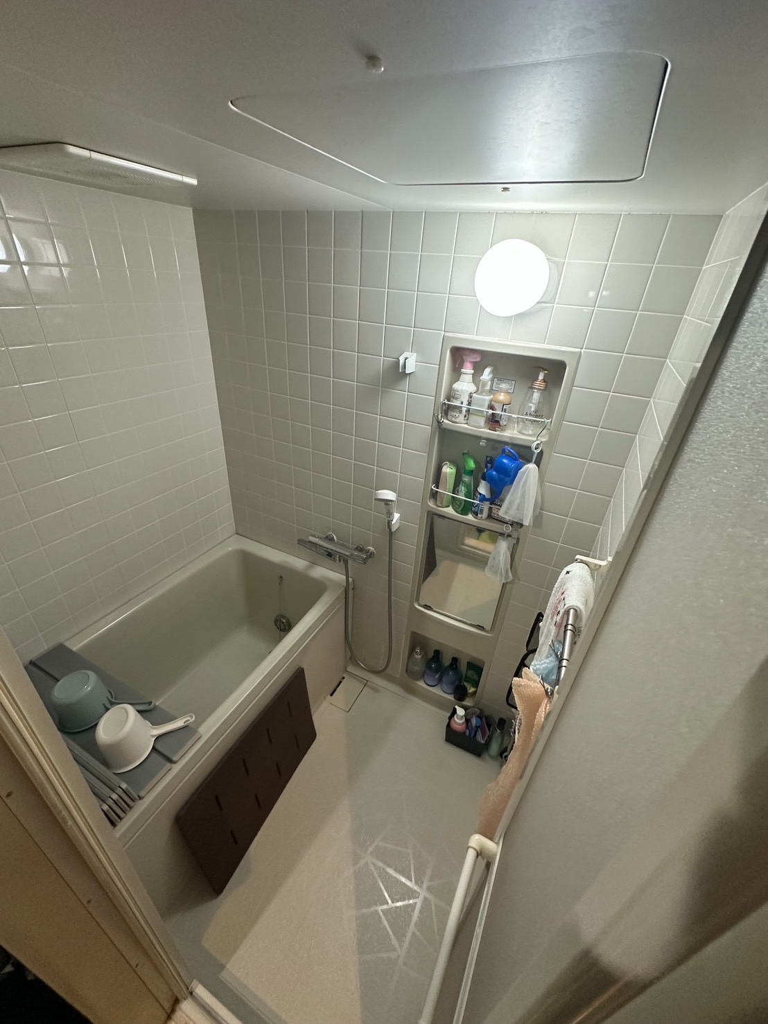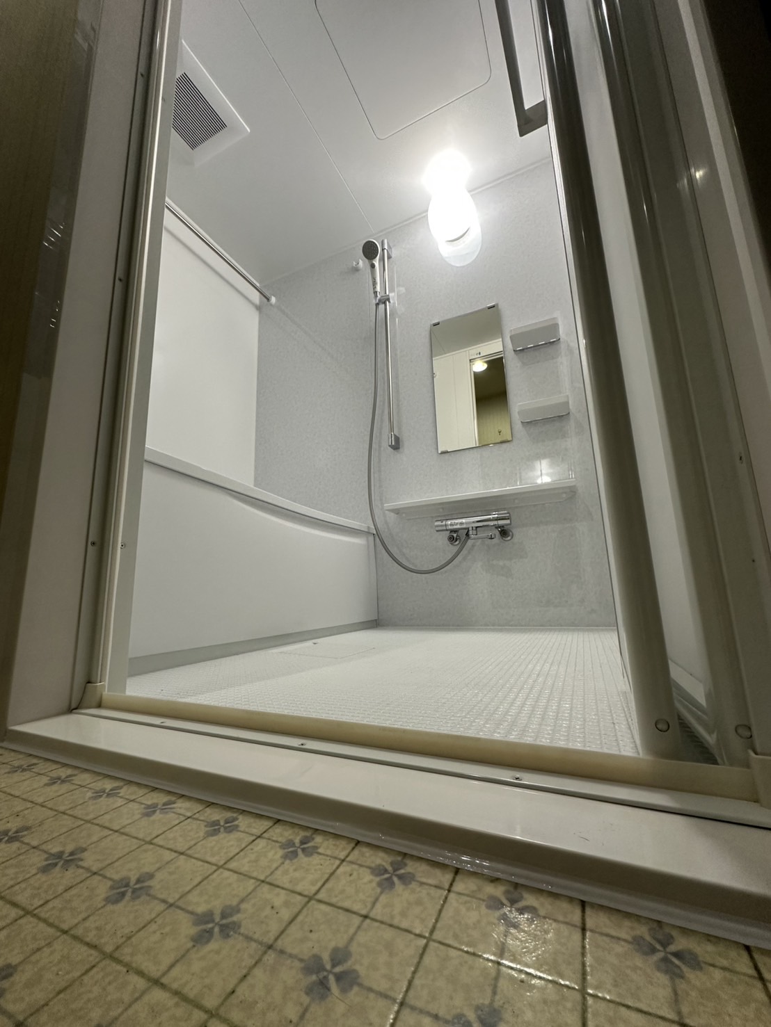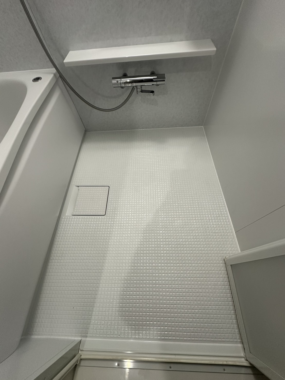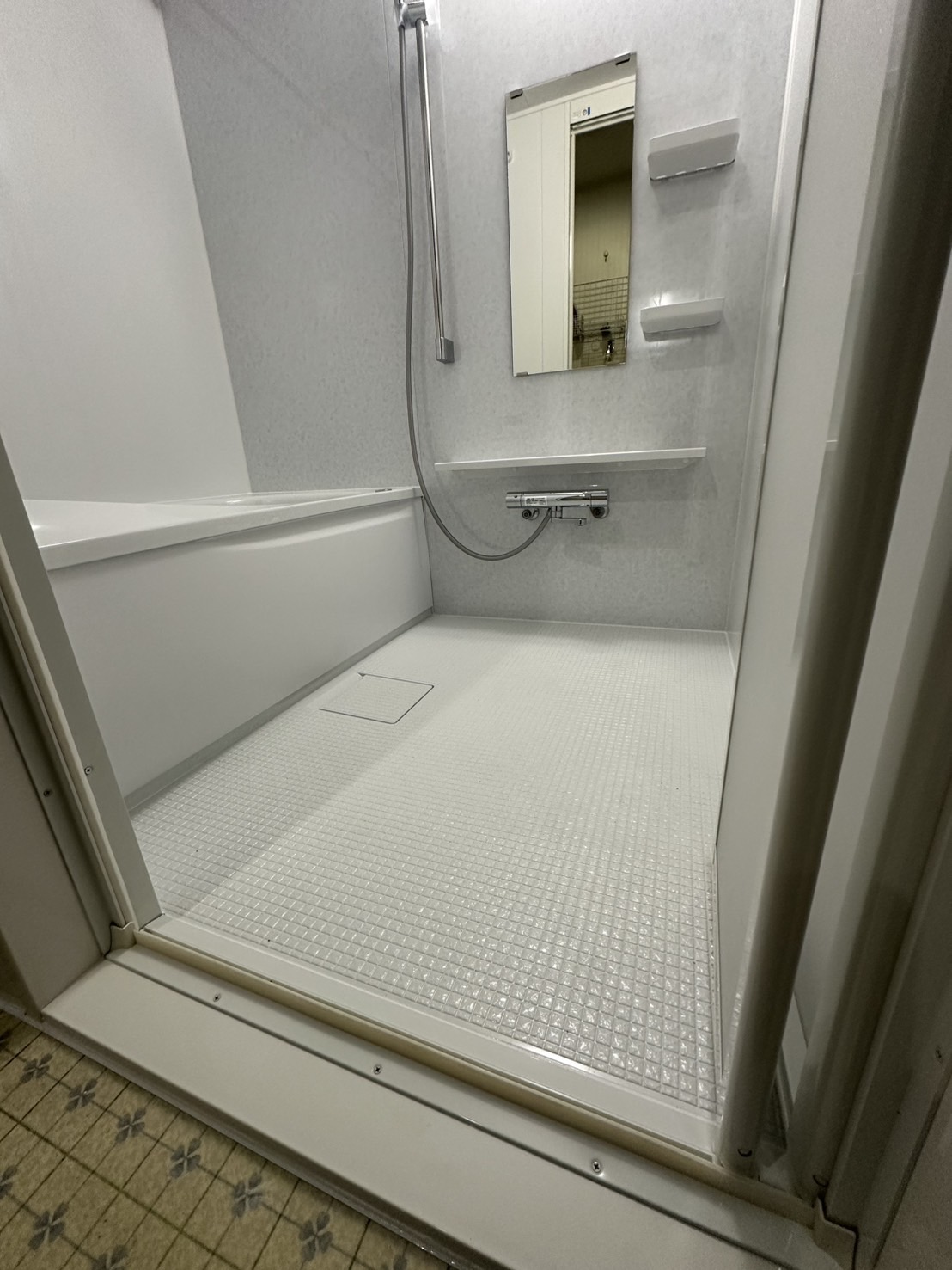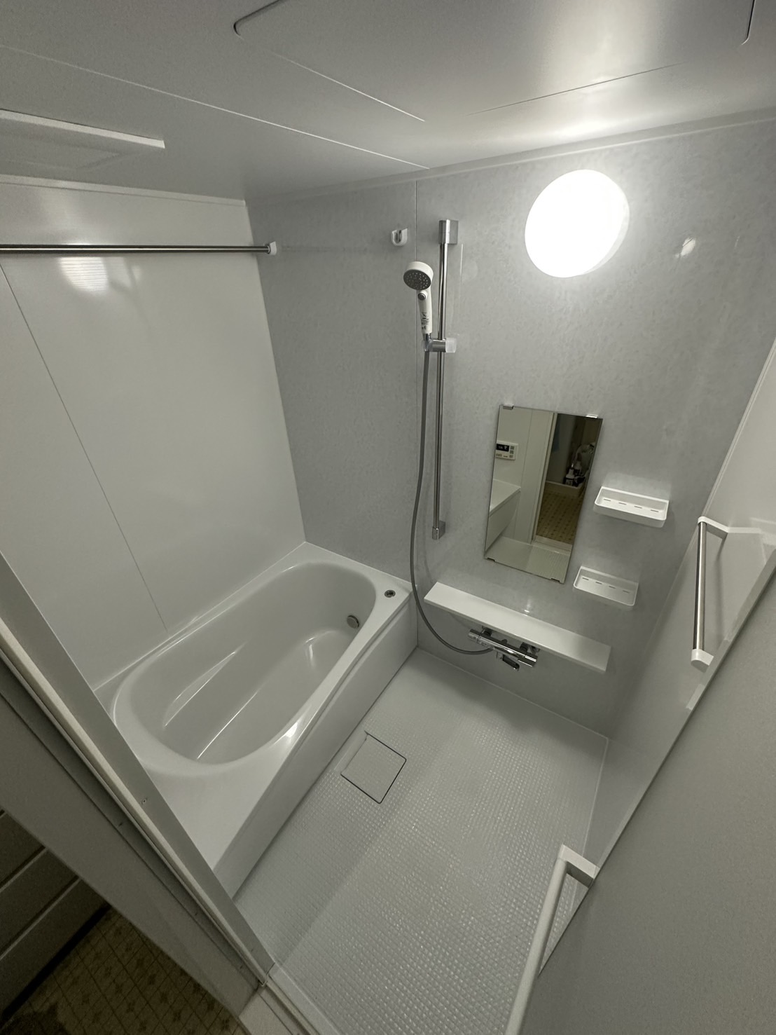 | 工事詳細 | 浴室改修工事 ・アクセントパネル:アラゴナホワイト ・周辺パネル:プリエホワイト ・浴槽:ゆるリラ浴槽(ホワイト) ・カウンター:ホワイト ・床:カラリ床(ホワイト) |