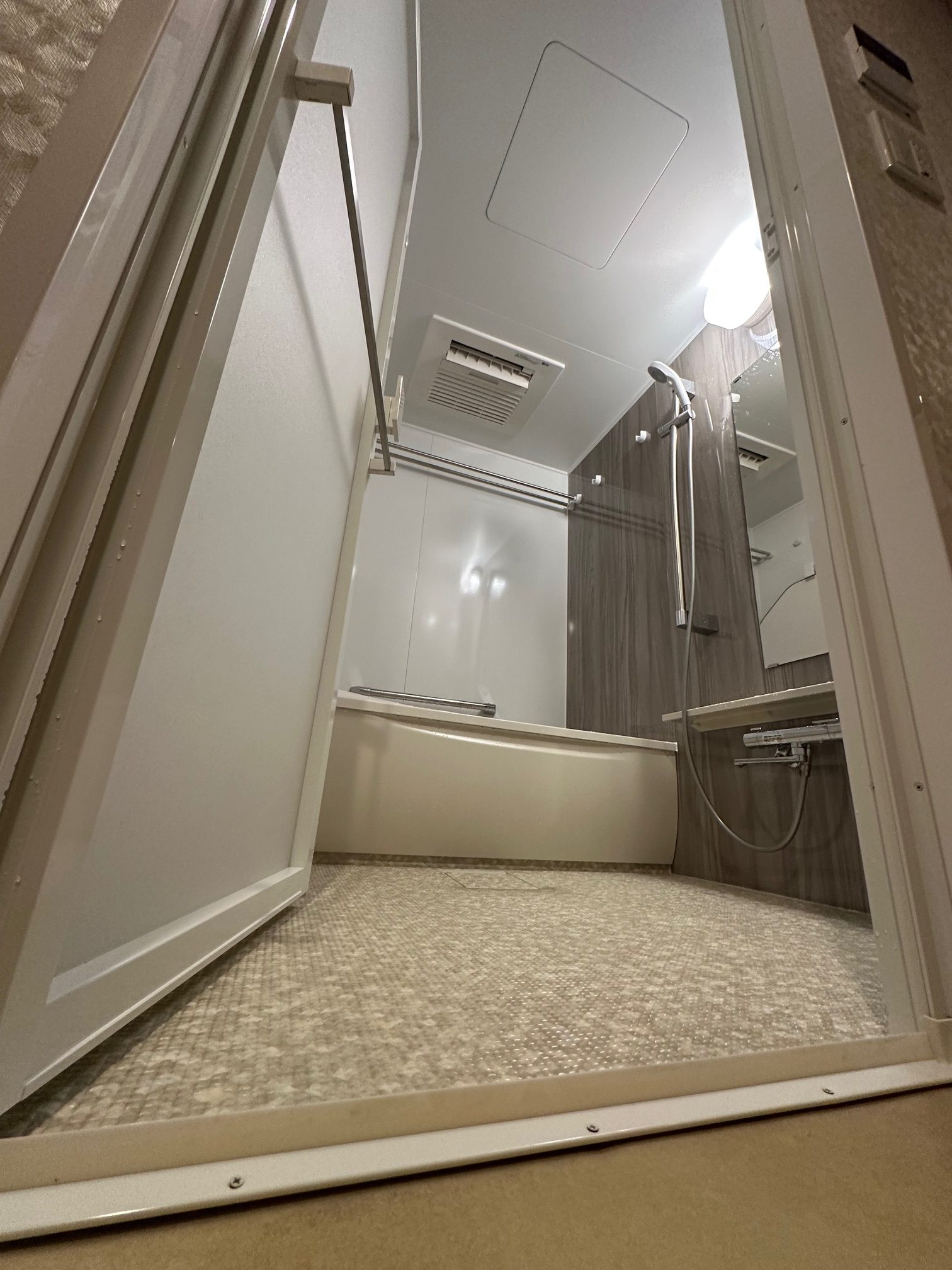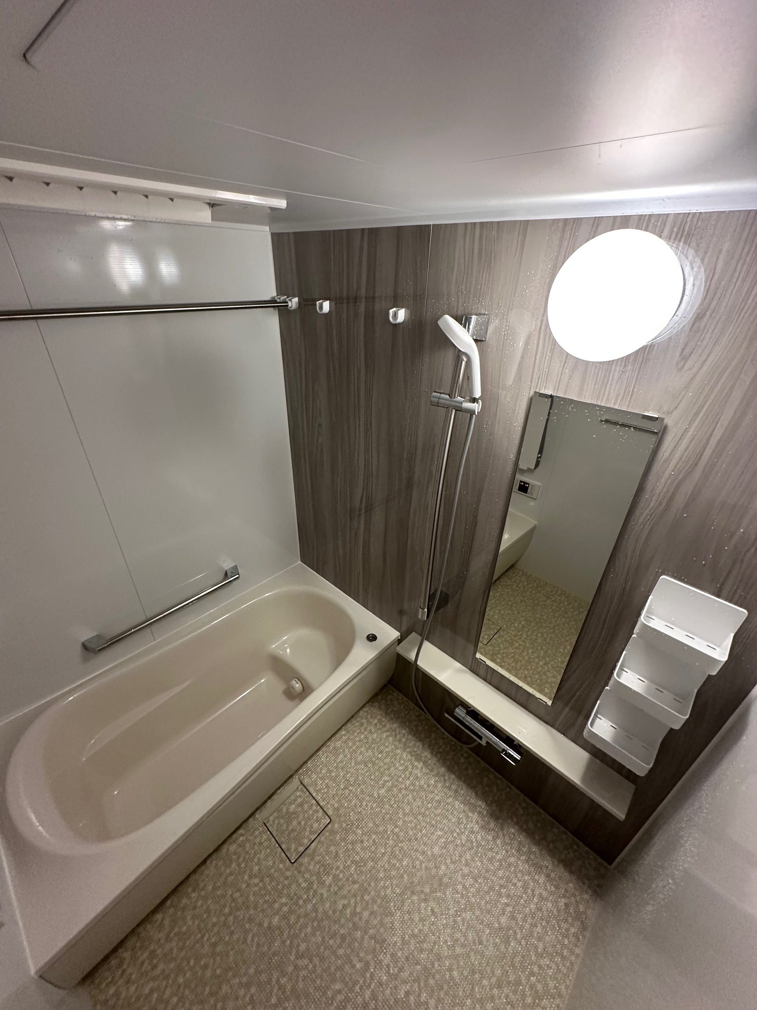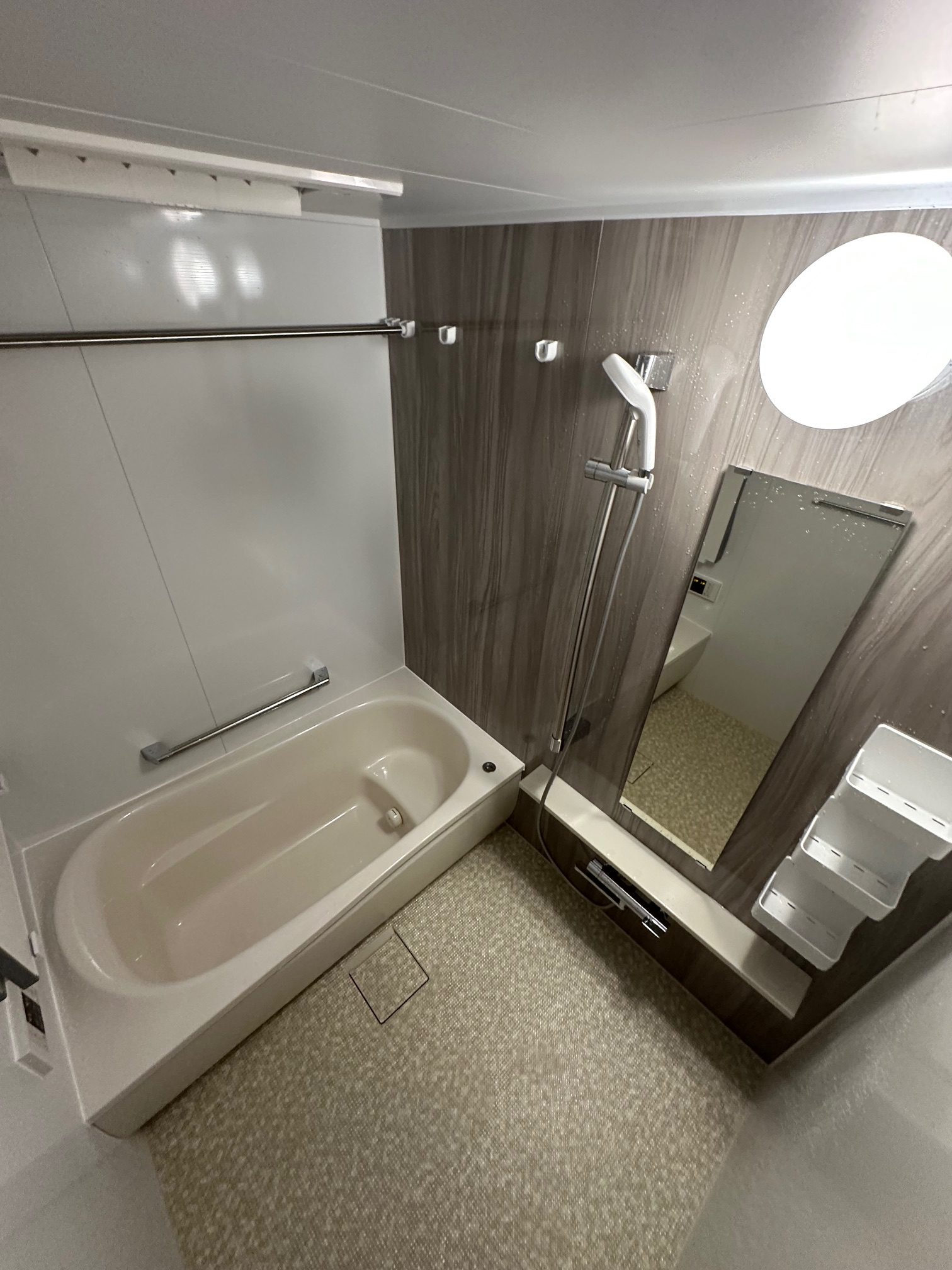 | 工事詳細 | 浴室改修工事 ・アクセントパネル:グレイッシュウォルナット ・周辺パネル:プリエホワイト ・浴槽:ゆるリラ浴槽(ベージュN) ・カウンター:ベージュ ・床:ほっカラリ床(ベージュ ラグ調) ・換気扇:現状使用 |