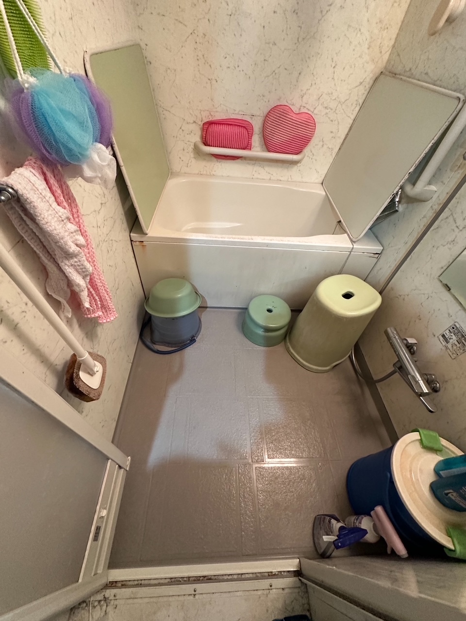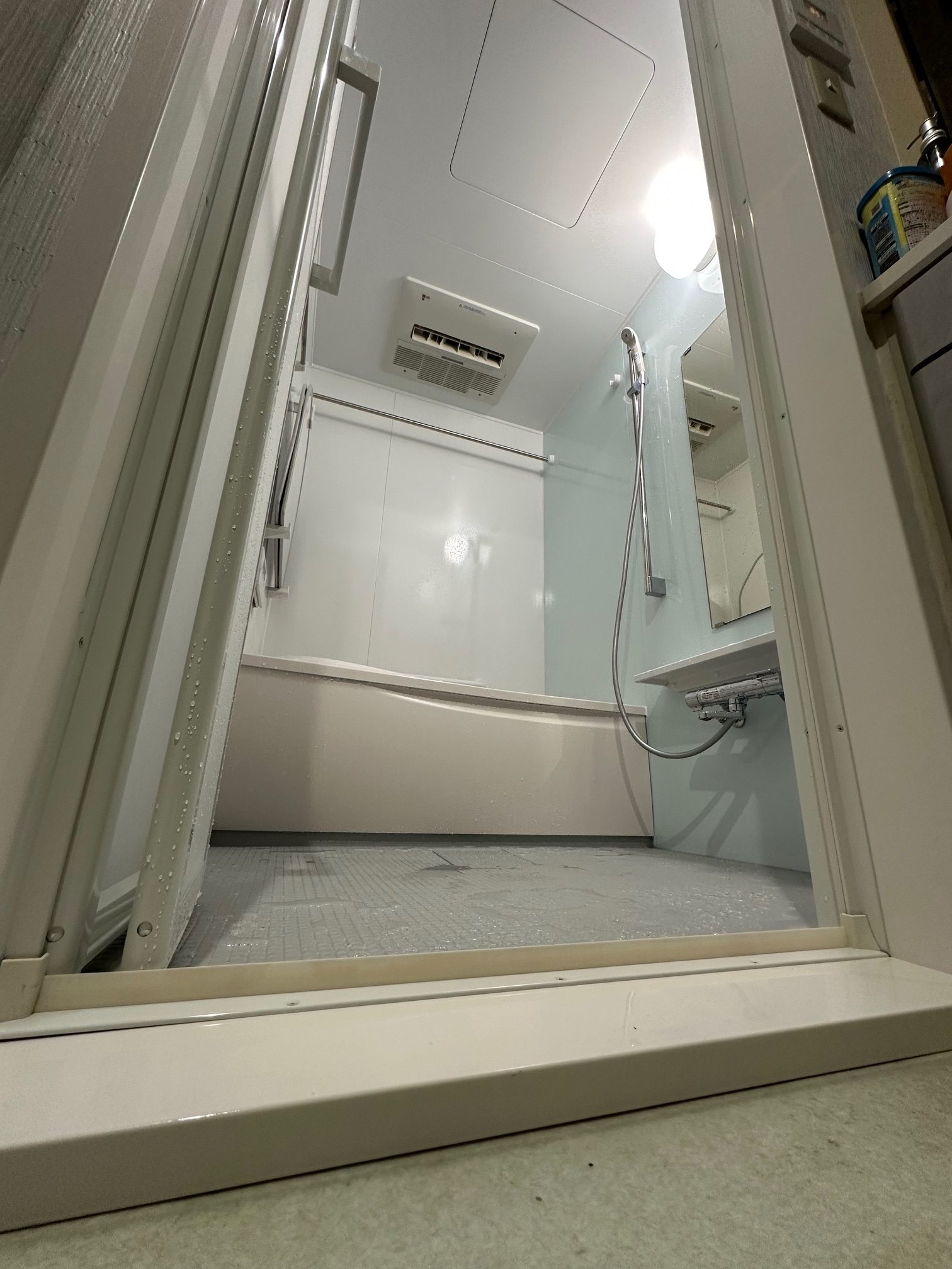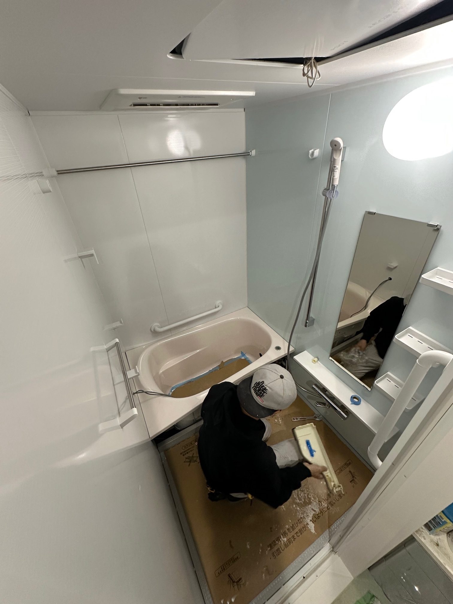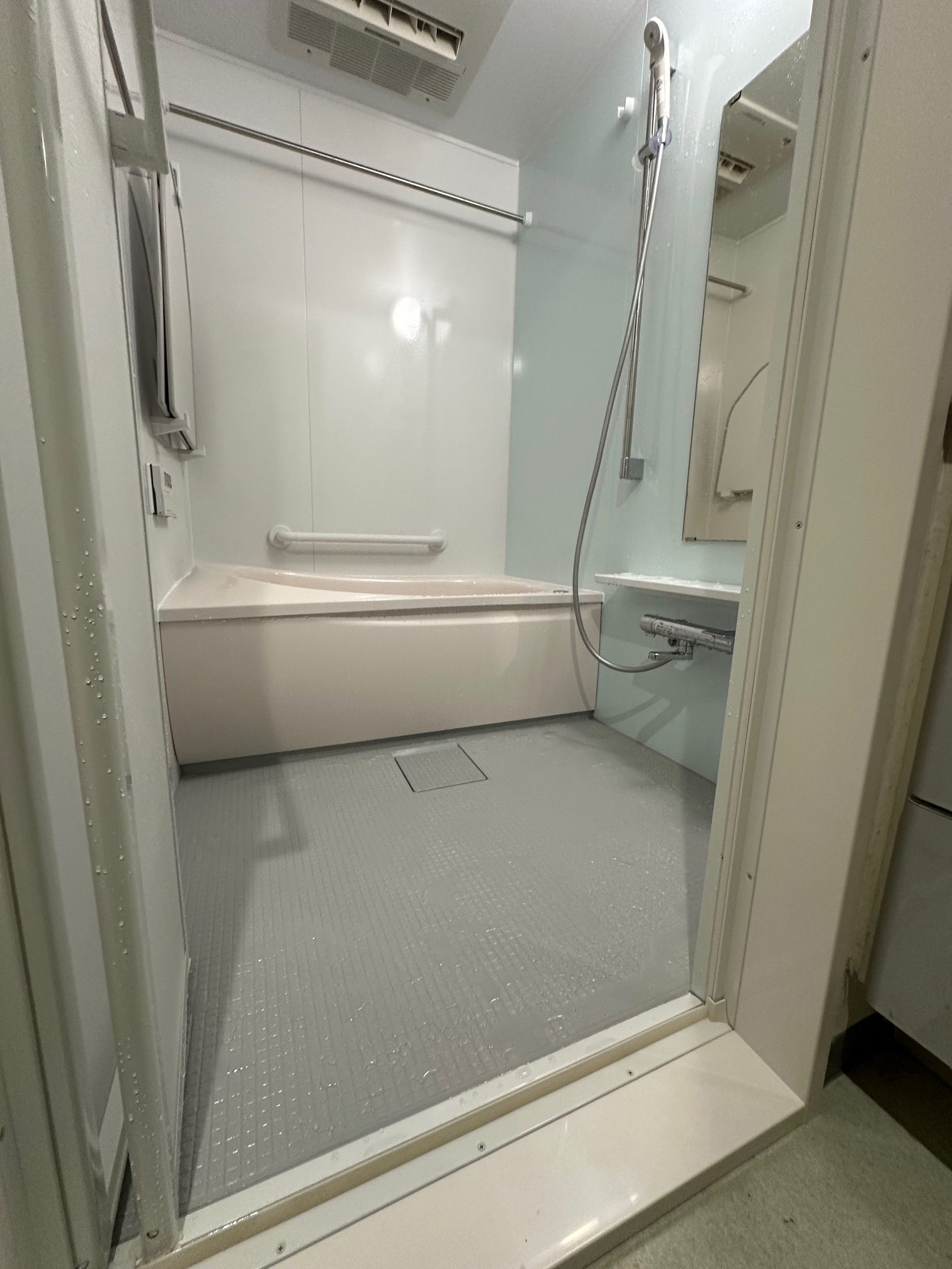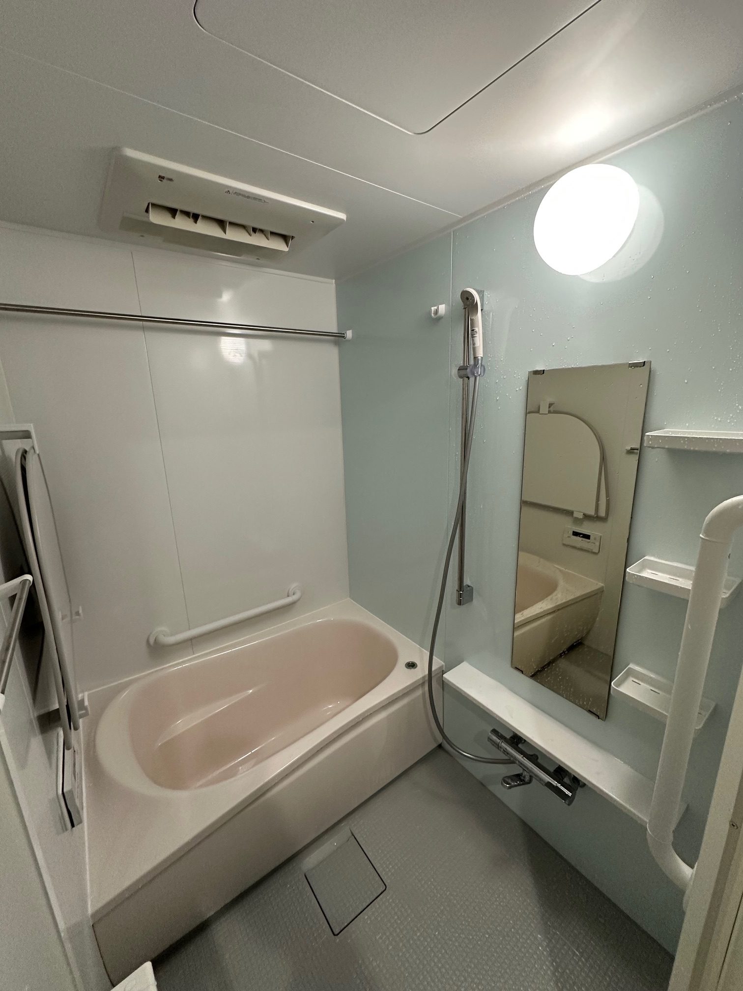 | 工事詳細 | 浴室改修工事 ・アクセントパネル:プリエアクア ・周辺パネル:プリエホワイト ・浴槽:ゆるリラ浴槽(ピンク) ・カウンター:ホワイト ・床:カラリ床(ライトグレー) ・換気扇:現状使用 |