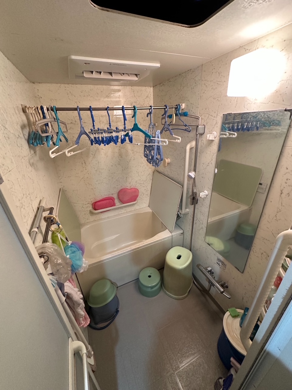 | 工事詳細 | 浴室改修工事 ・アクセントパネル:プリエアクア ・周辺パネル:プリエホワイト ・浴槽:ゆるリラ浴槽(ピンク) ・カウンター:ホワイト ・床:カラリ床(ライトグレー) ・換気扇:現状使用 |