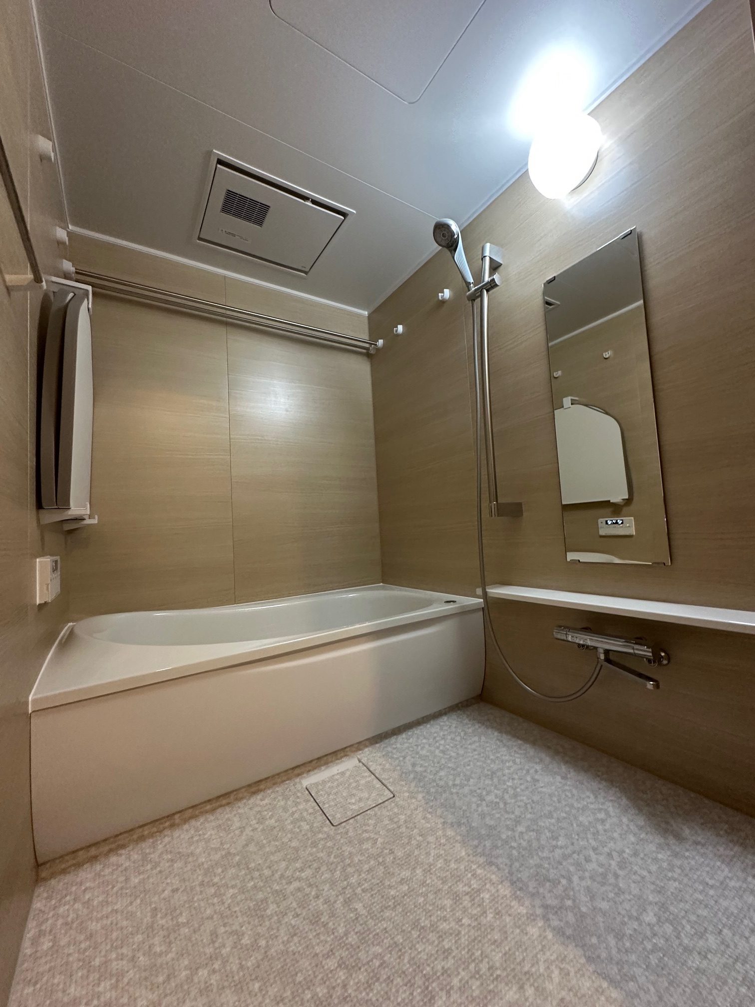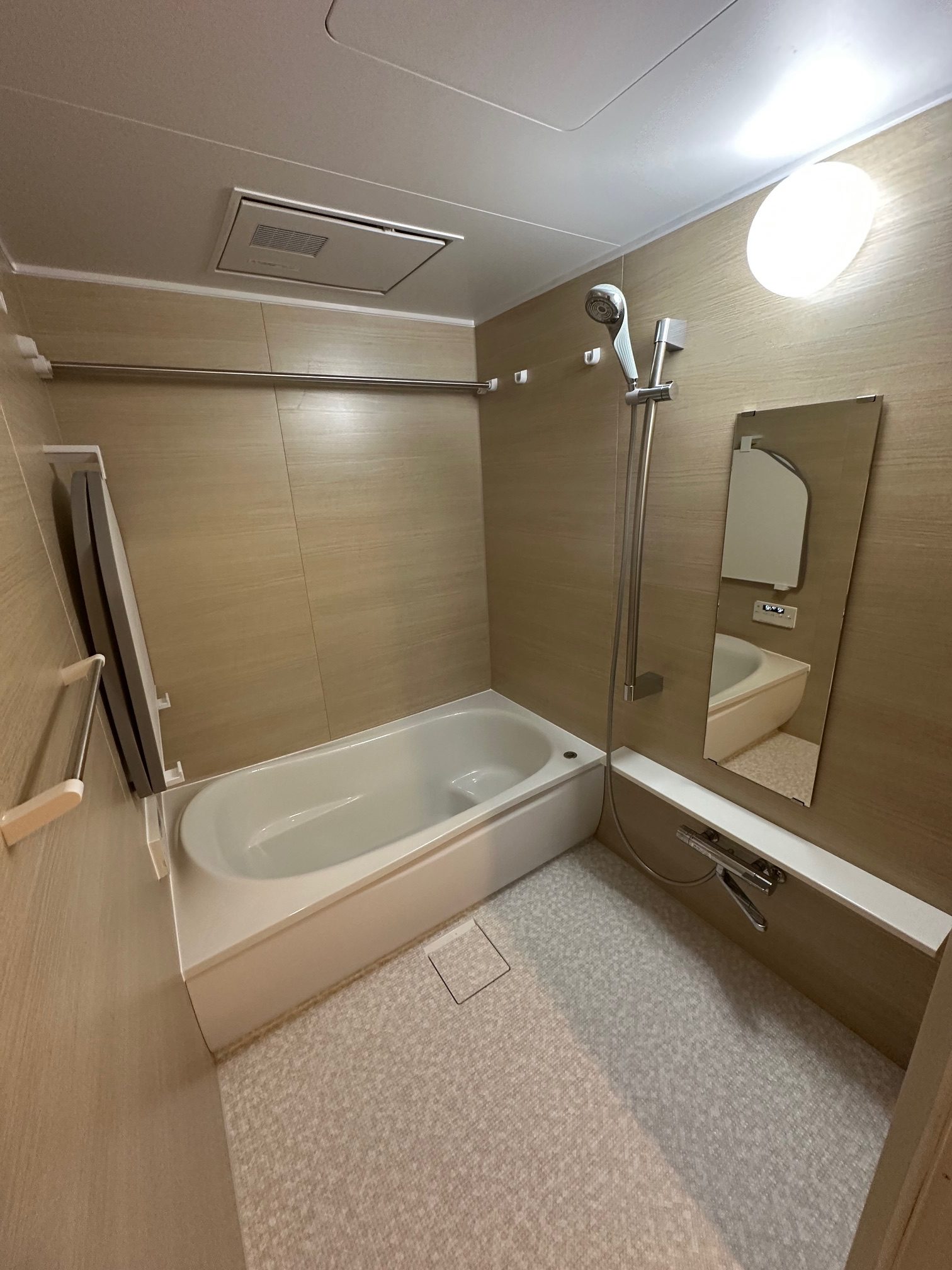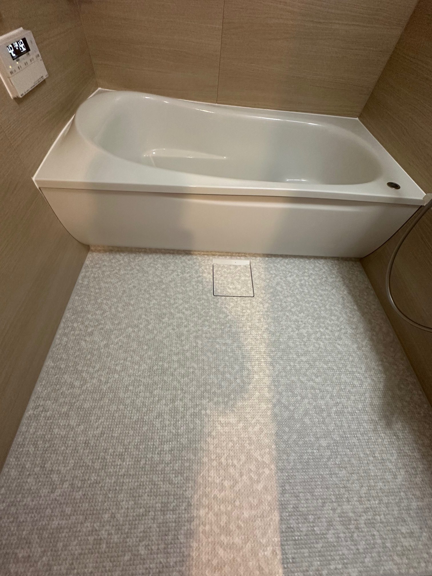 | 工事詳細 | 浴室改修工事 ・周辺パネル:ライトウッドN ・浴槽:ゆるリラ浴槽(ホワイト) ・カウンター:ホワイト ・床:ほっカラリ床(ホワイト ラグ調) ・換気扇:三乾王 |