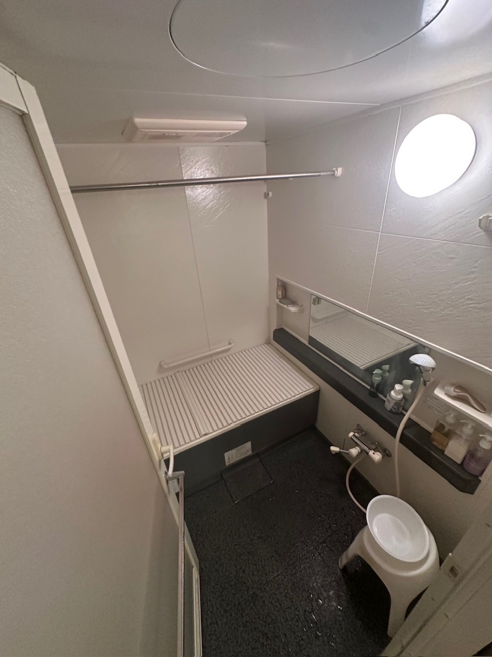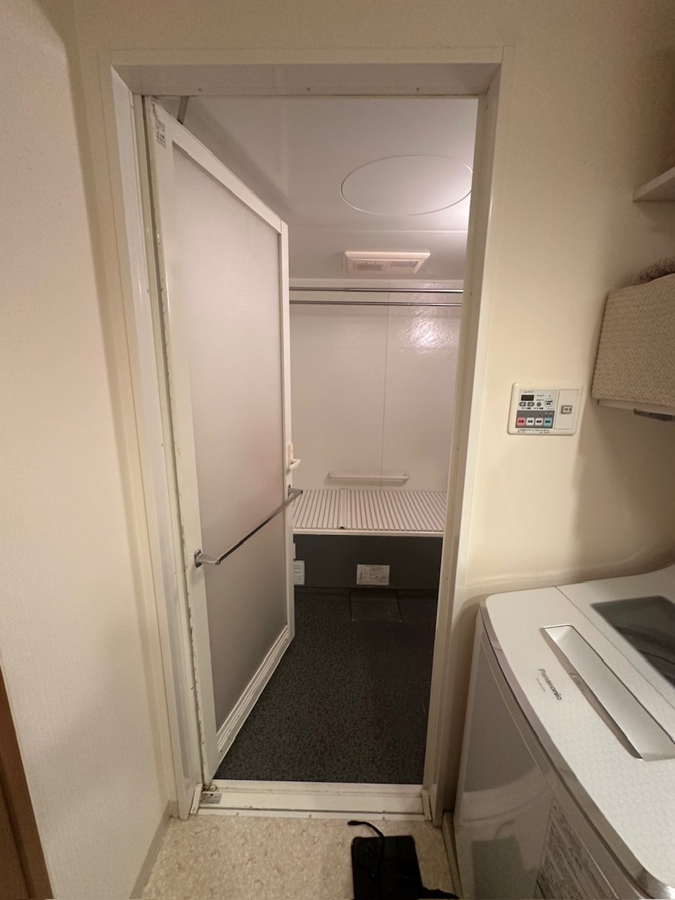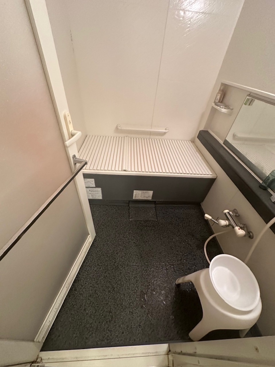 | 工事詳細 | 浴室改修工事 ・周辺パネル:ライトウッドN ・浴槽:ゆるリラ浴槽(ホワイト) ・カウンター:ホワイト ・床:ほっカラリ床(ホワイト ラグ調) ・換気扇:三乾王 |