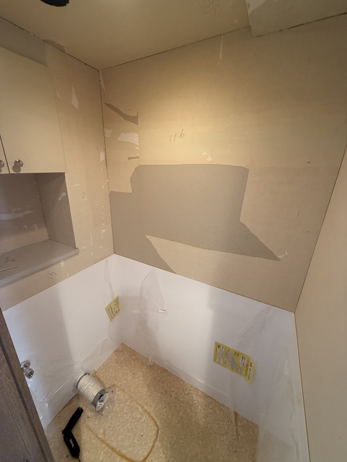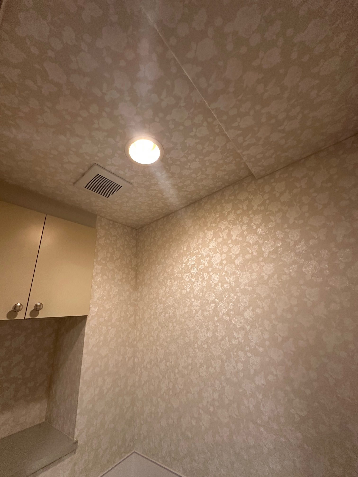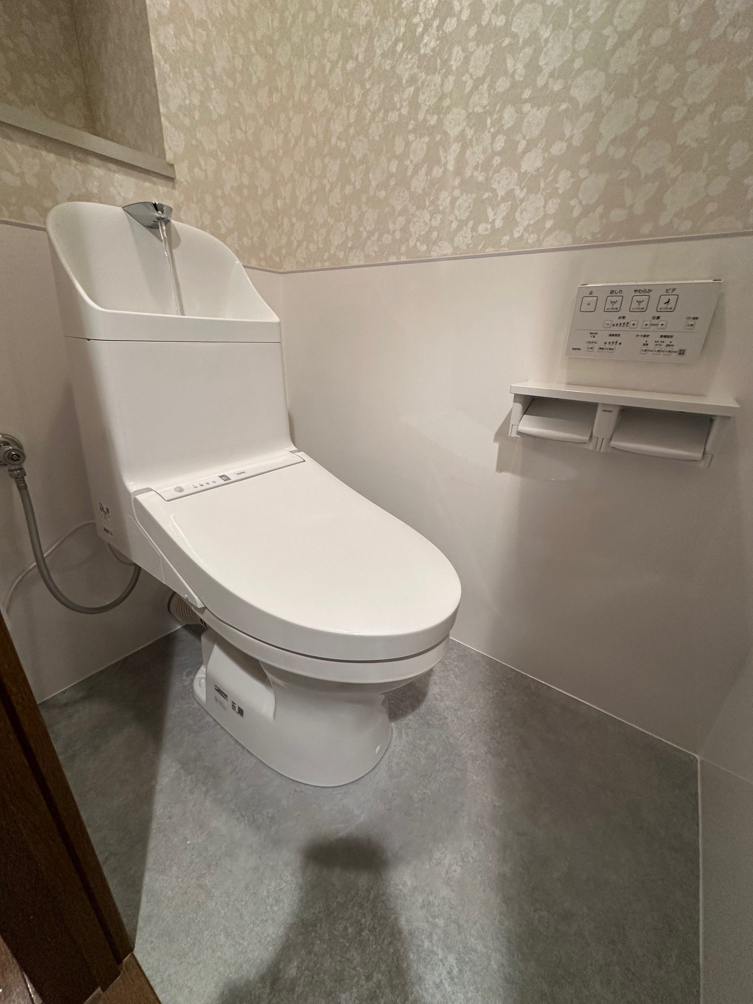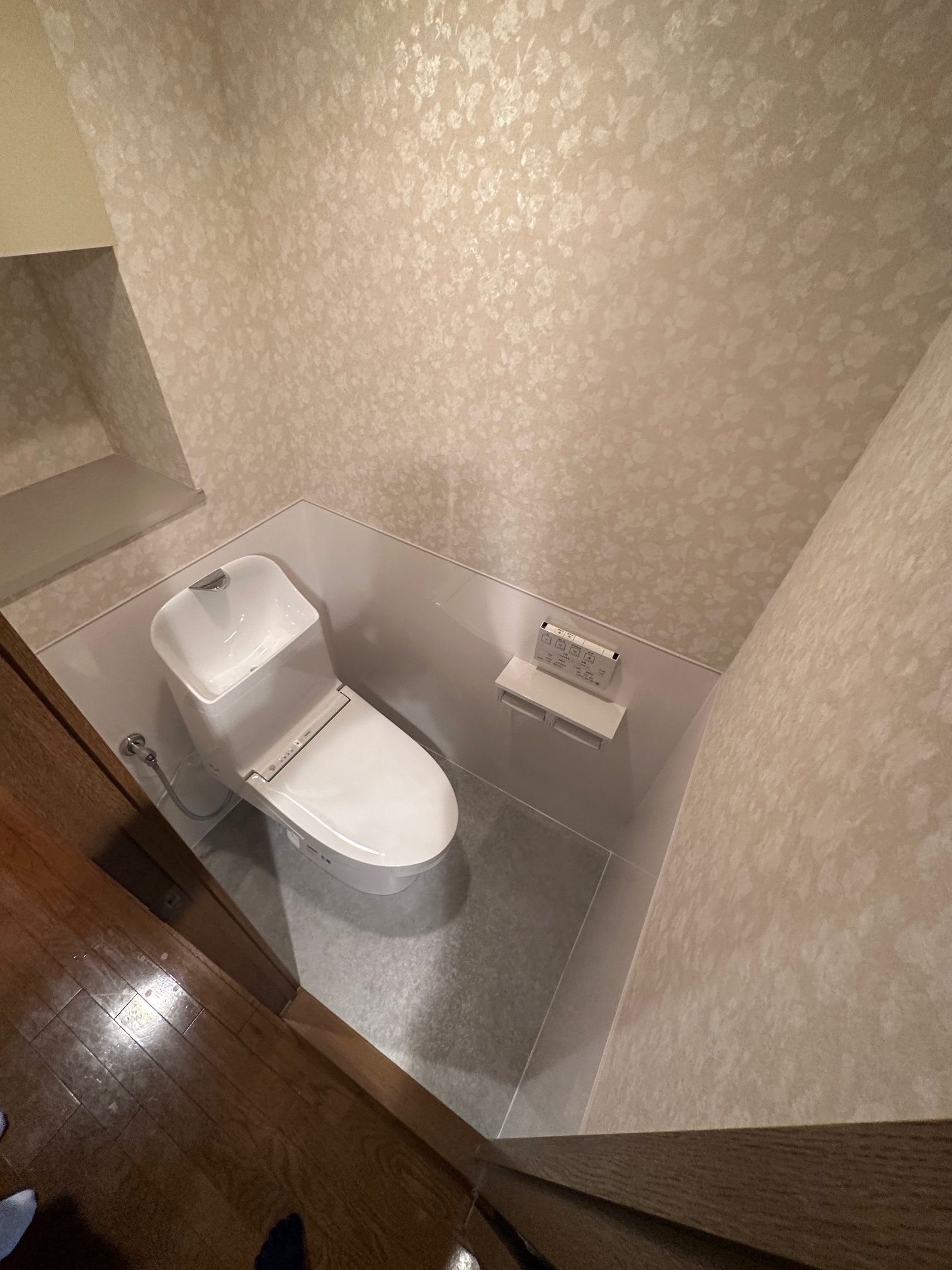 | 工事詳細 | トイレリフォーム ・腰上/天井クロス貼り変え ・腰下パネル張り ・床CF貼り ・タオル掛け取り替え ・ペーパーホルダー交換 ・換気ガラリ交換 ・コンセント交換 ・トイレ入れ替え |