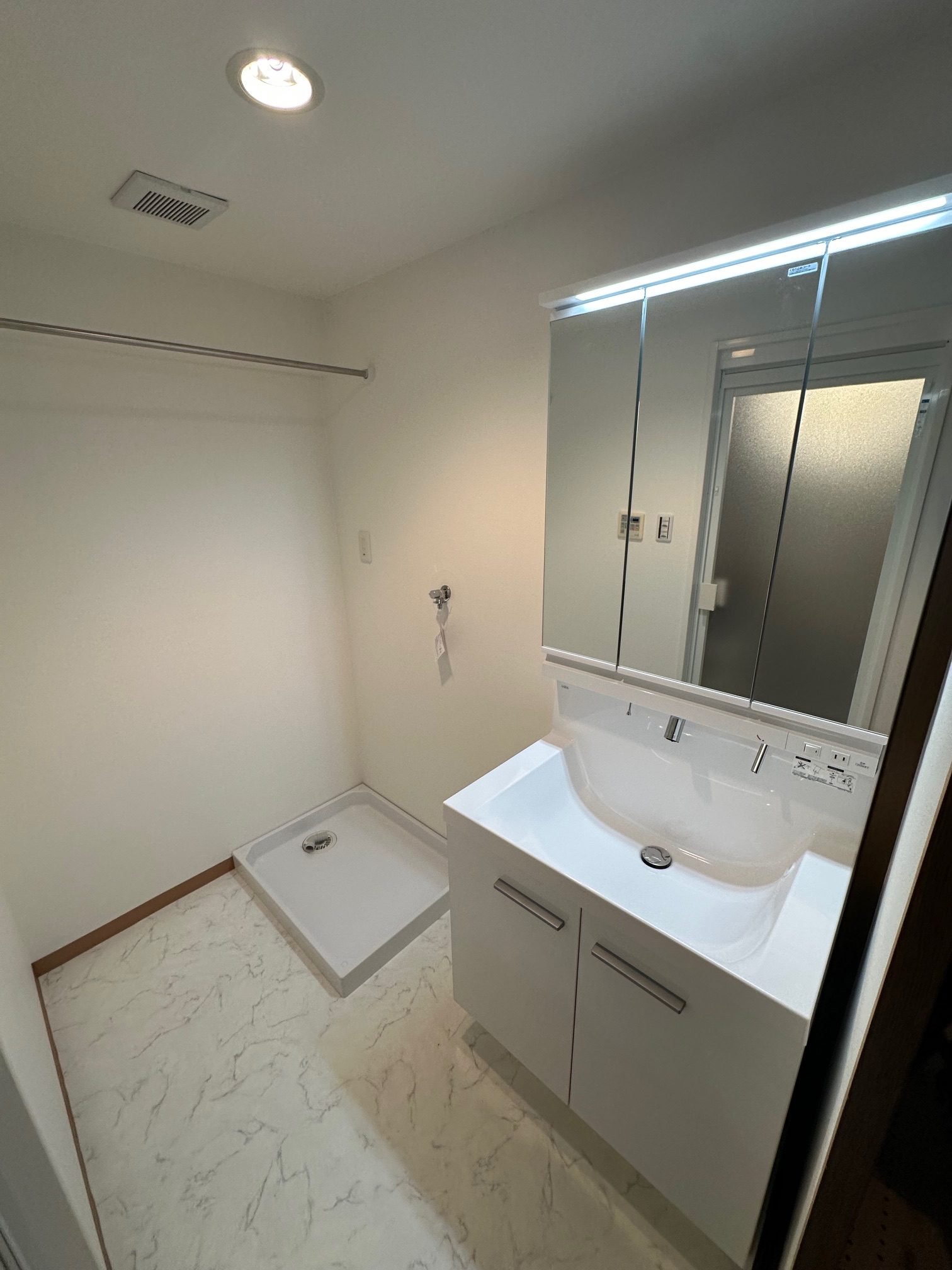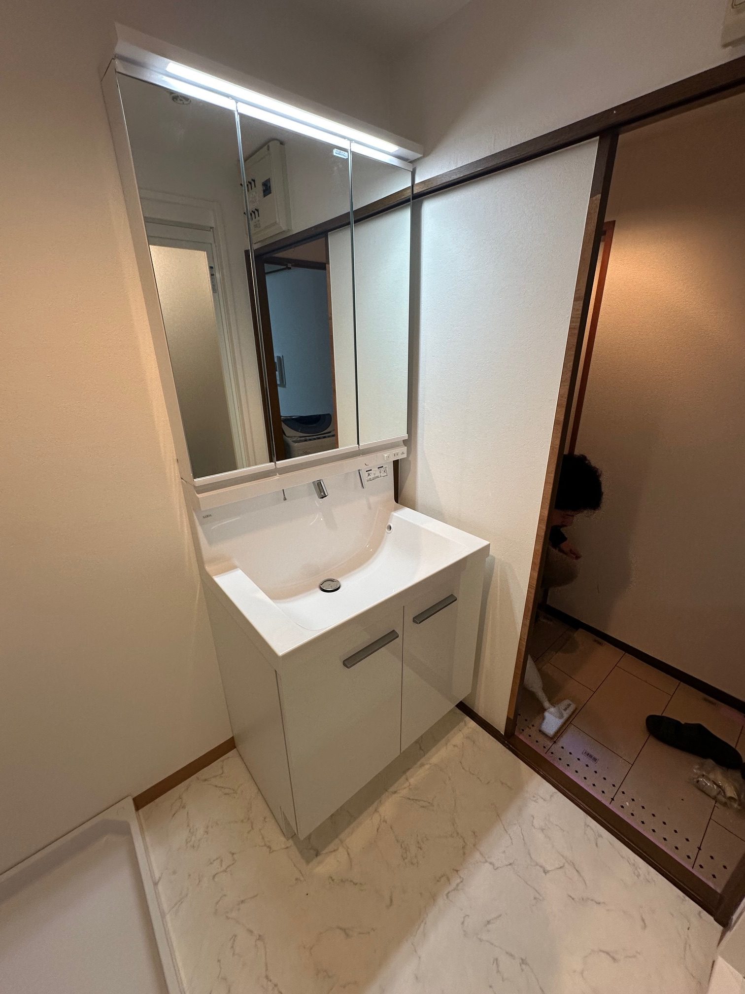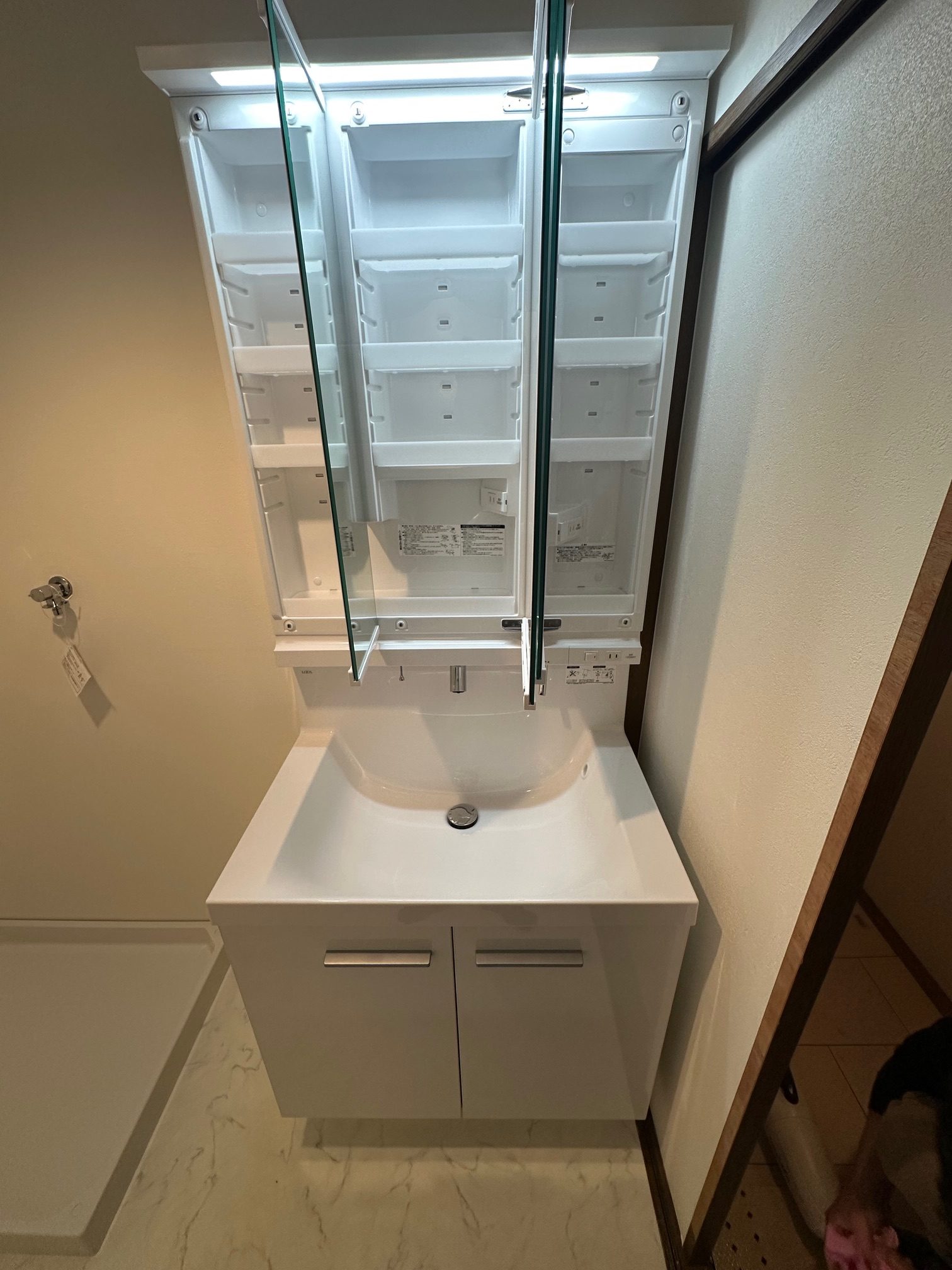 | 工事詳細 | 洗面所リフォーム ・洗面台取り替え ・クロス貼り替え ・ソフト巾木張り替え ・床CF貼り替え ・換気ガラリ交換 ・コンセント/スイッチ交換 ・ランドリーパイプ設置 |