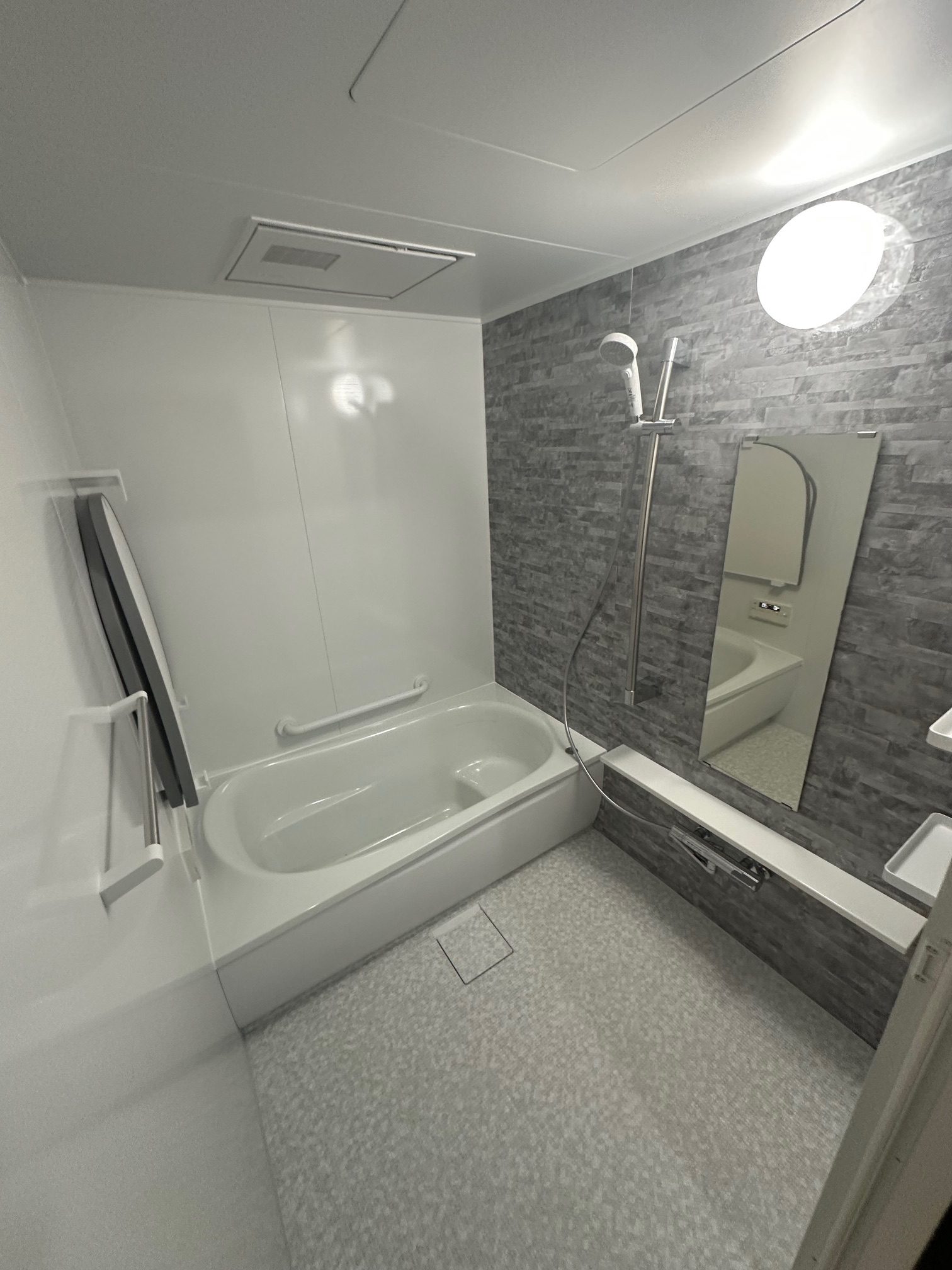 | 工事詳細 | 浴室改修工事 ・アクセントパネル:クレアライトグレー ・周辺パネル:プリエホワイト ・浴槽:ゆるリラ浴槽(ホワイト) ・カウンター:ホワイト ・床:ほっカラリ床(ホワイト ラグ調) ・換気扇:三乾王 |