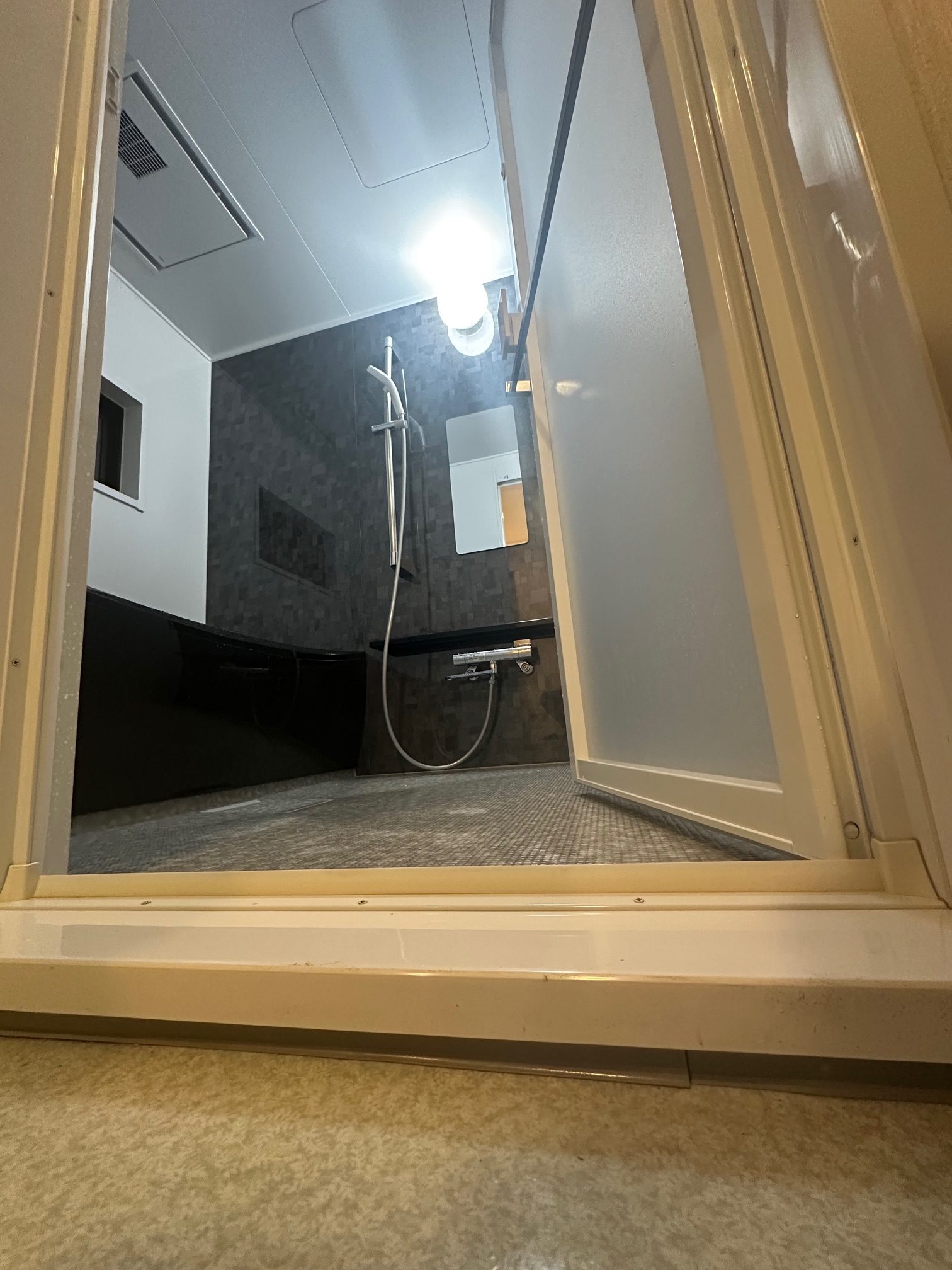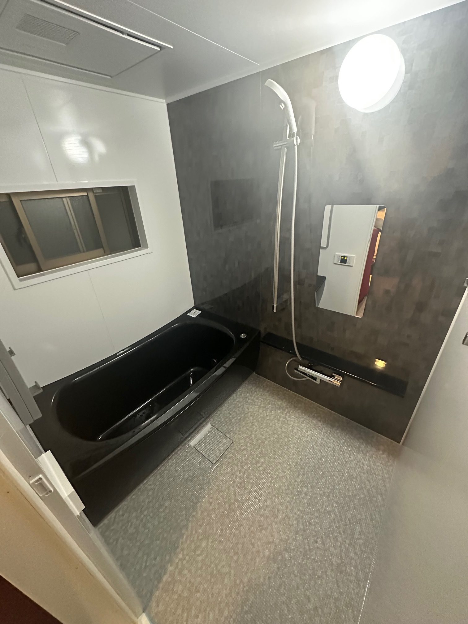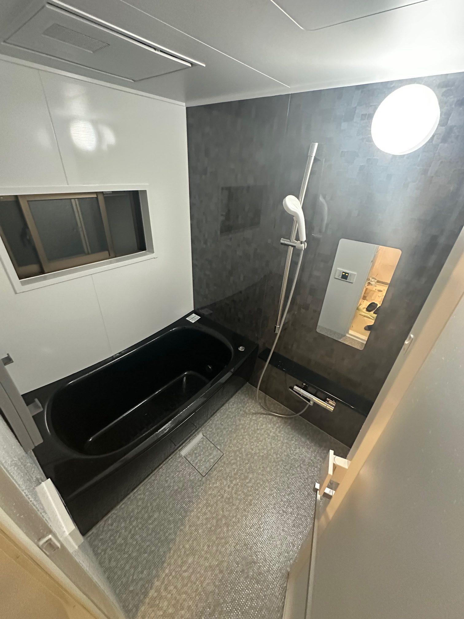 | 工事詳細 | 浴室改修工事 ・アクセントパネル:ロブストグレー ・周辺パネル:プリエホワイト ・浴槽:人大クレイドル浴槽(ジュエリーブラック) ・カウンター:ブラック ・床:ほっカラリ床(ライトグレー ラグ調) ・換気扇:三乾王 |