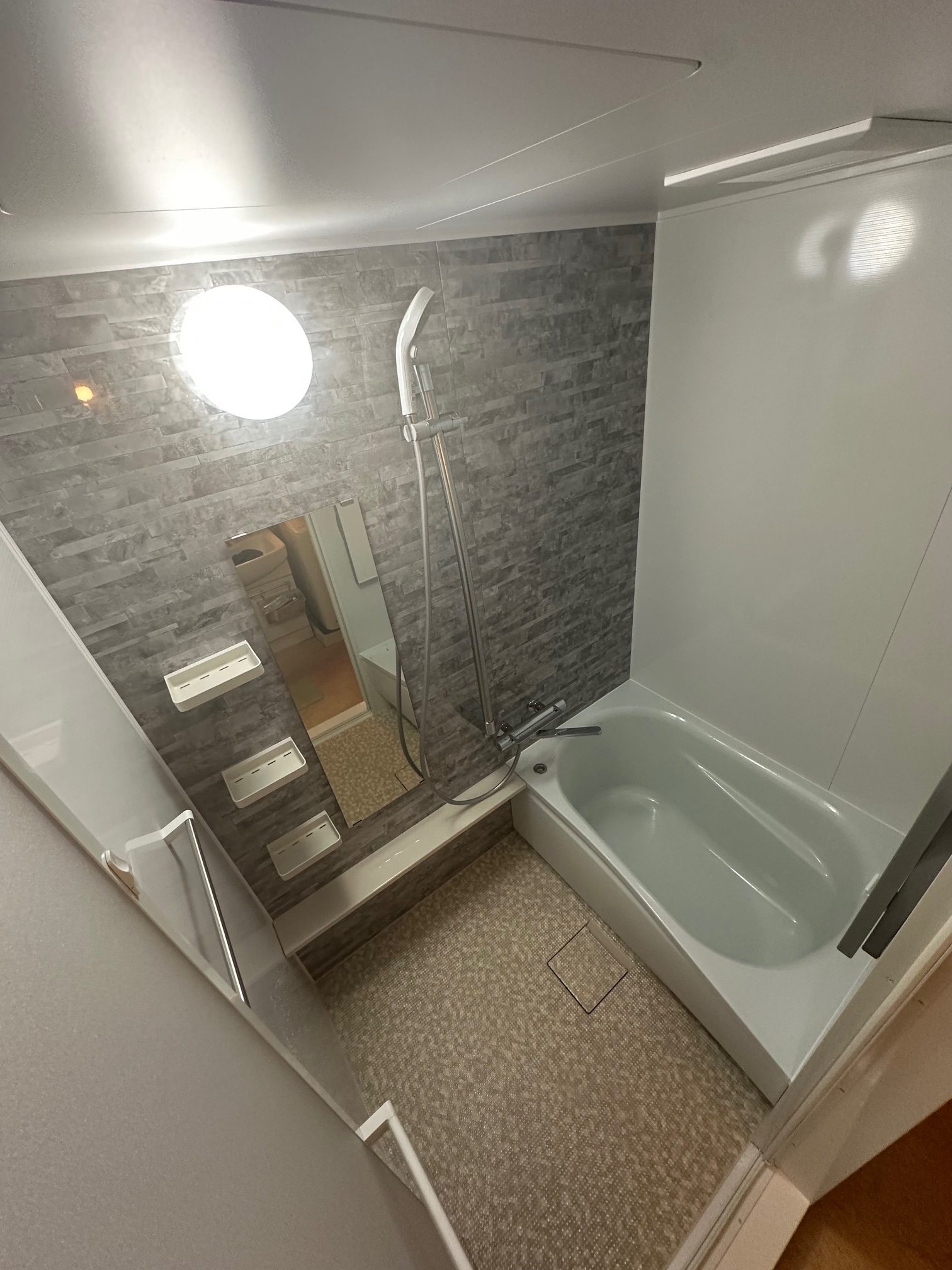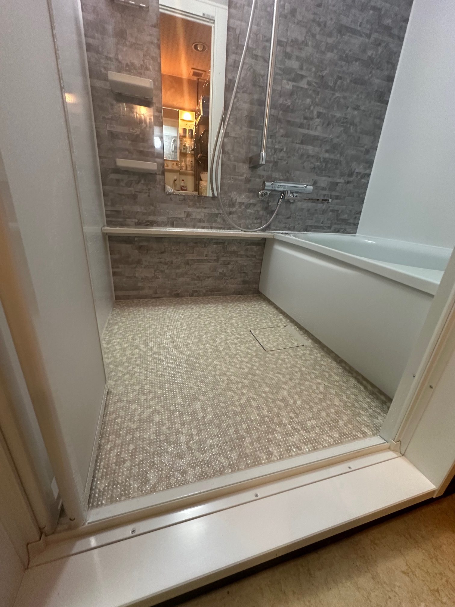 | 工事詳細 | 浴室改修工事 ・アクセントパネル:クレアライトグレー ・周辺パネル:プリエホワイト ・浴槽:ラウンド浴槽(アクアN) ・カウンター:ベージュN ・床:ほっカラリ床(ベージュ ラグ調) |