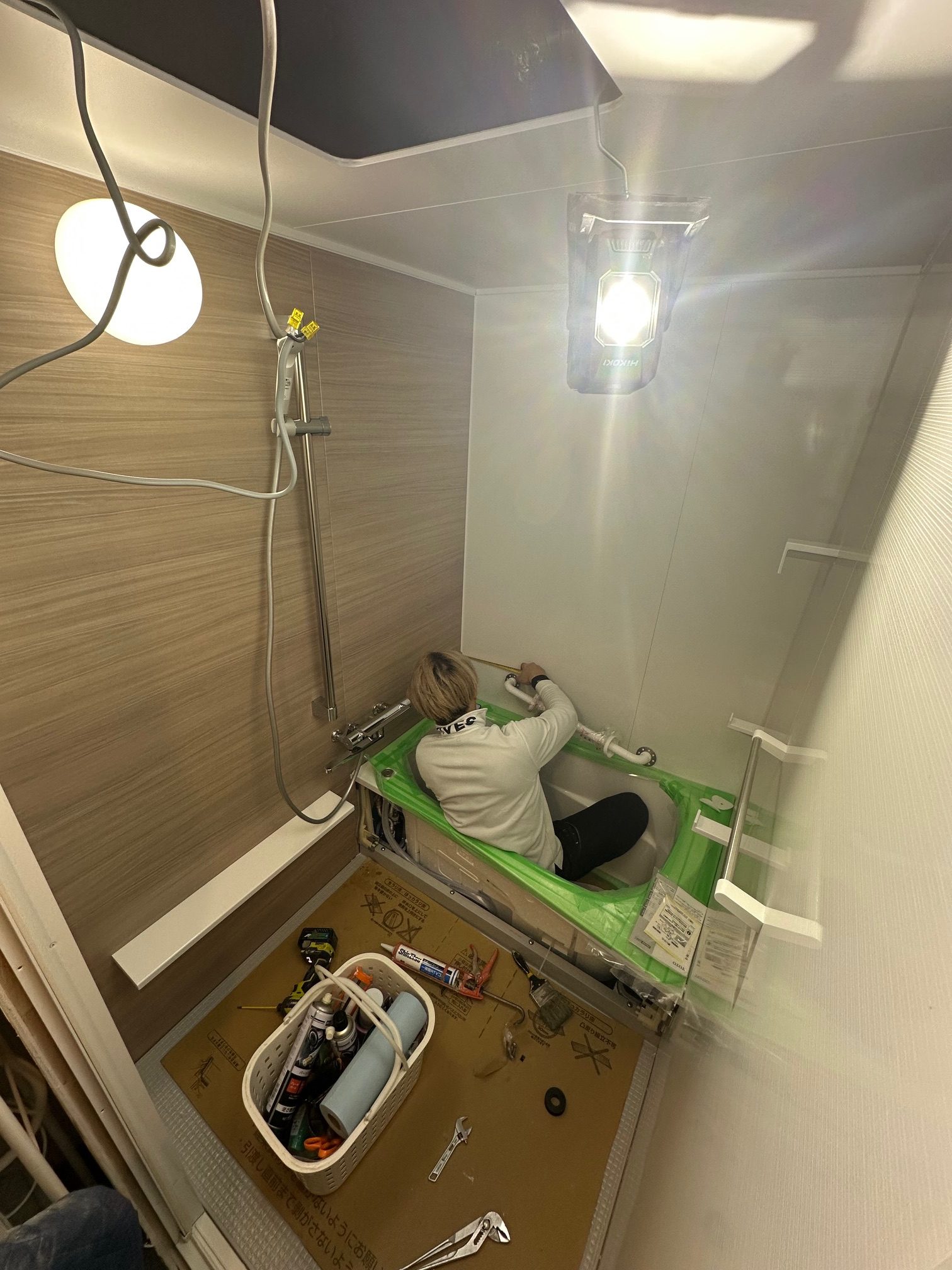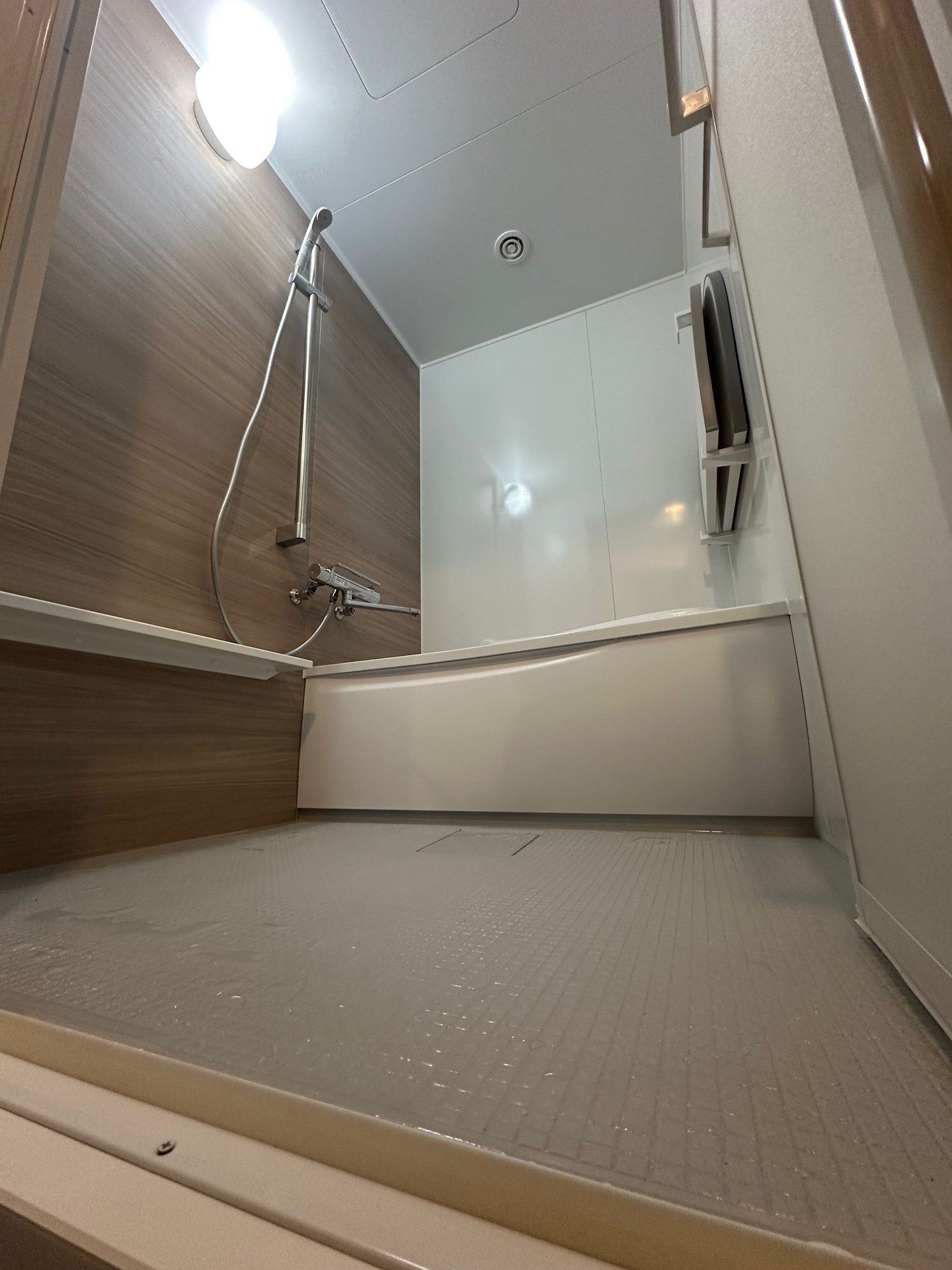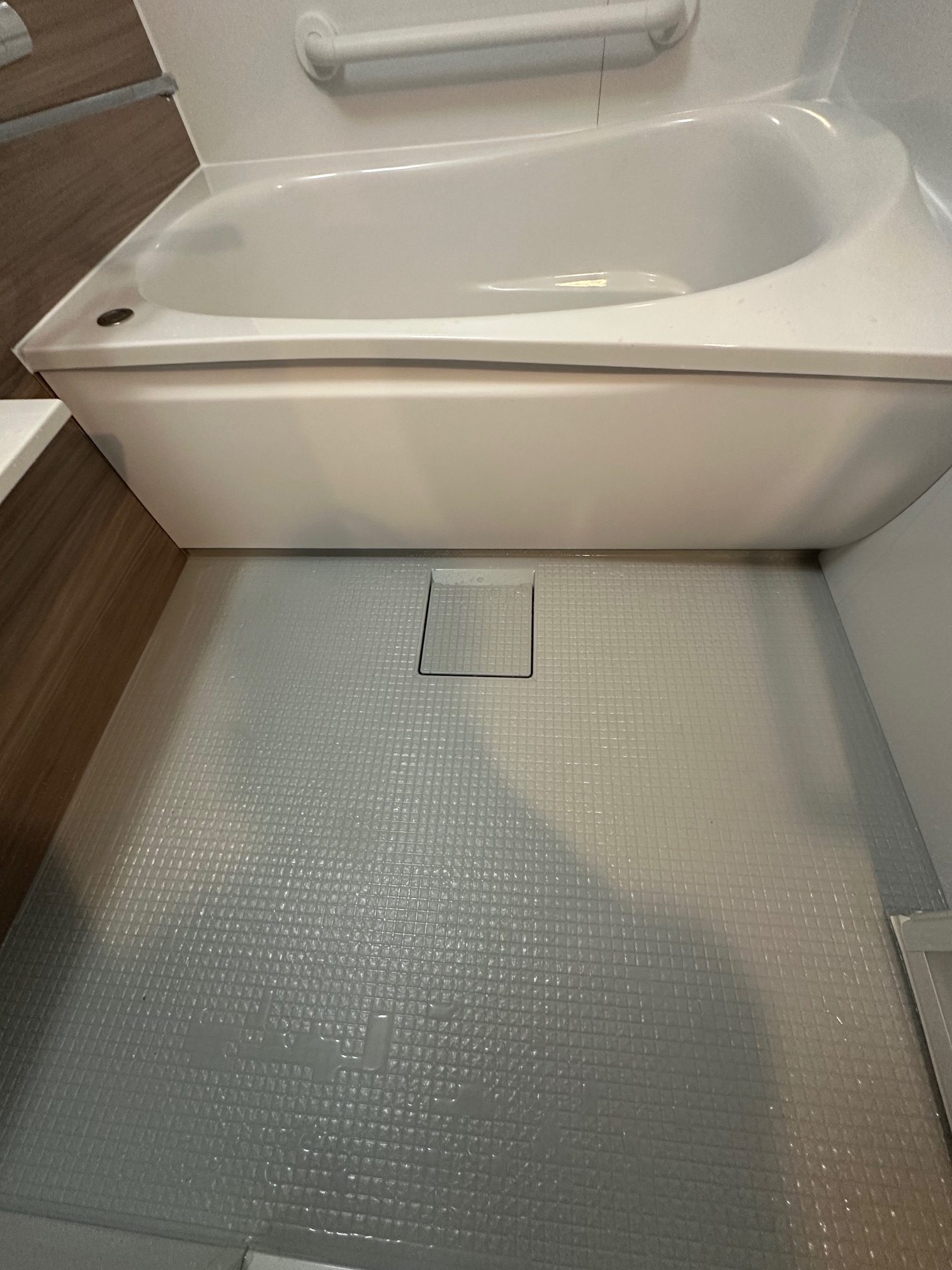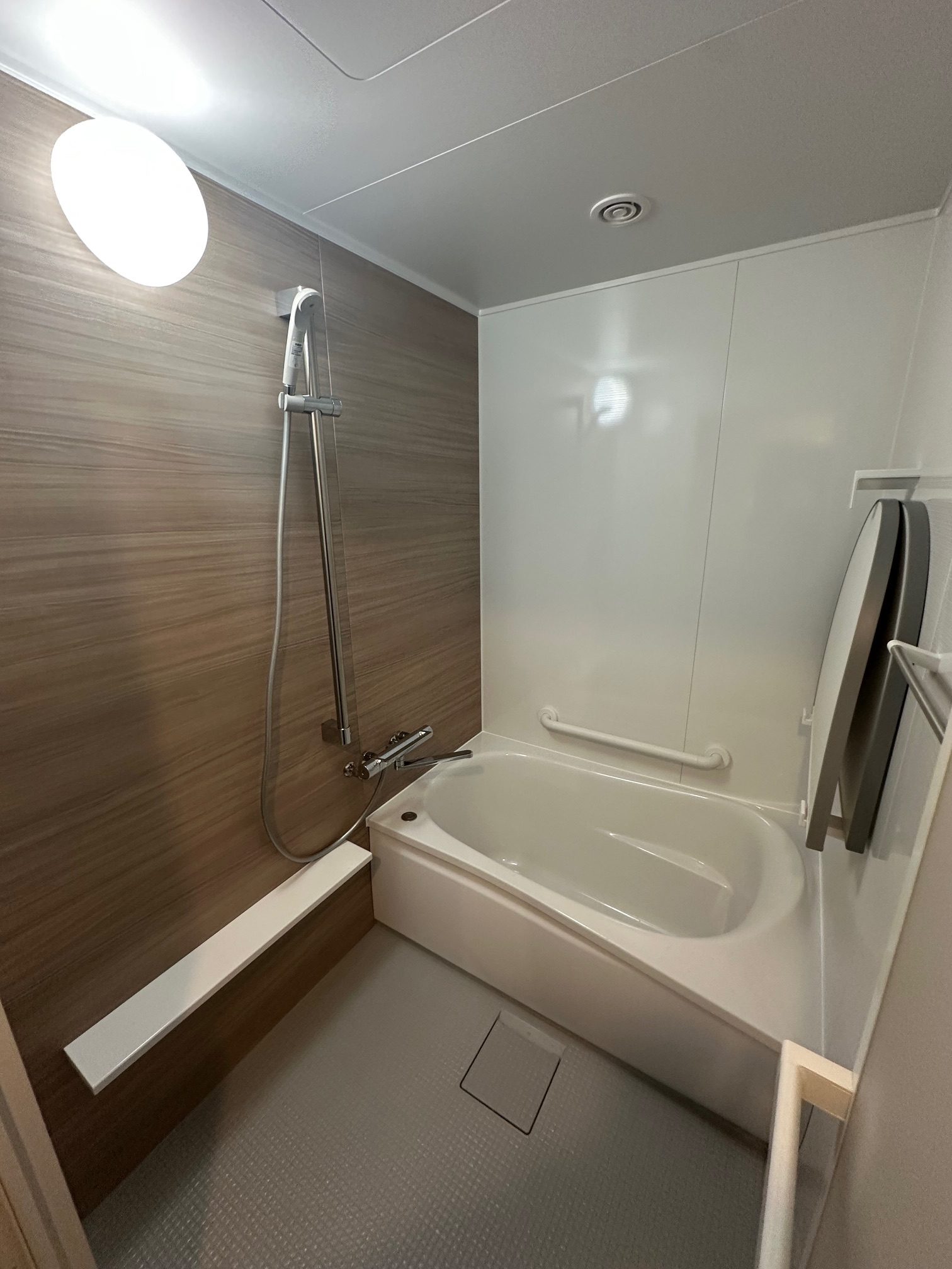 | 工事詳細 | 浴室改修工事 ・アクセントパネル:カルムグレーウッド ・周辺パネル:プリエホワイト ・浴槽:ゆるリラ浴槽(ホワイト) ・カウンター:ホワイト ・床:カラリ床(ライトグレー) |