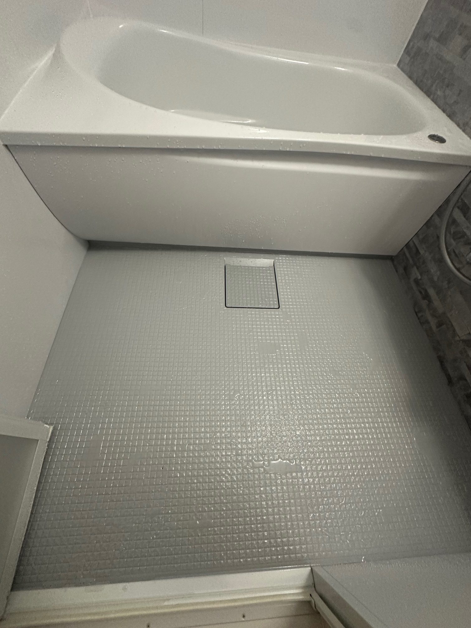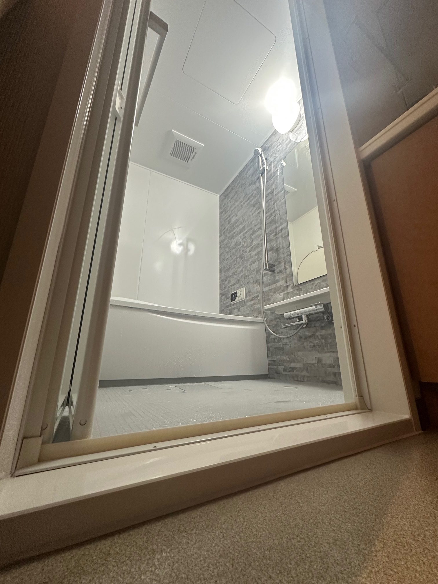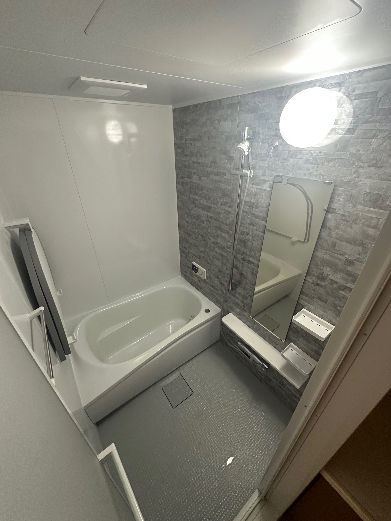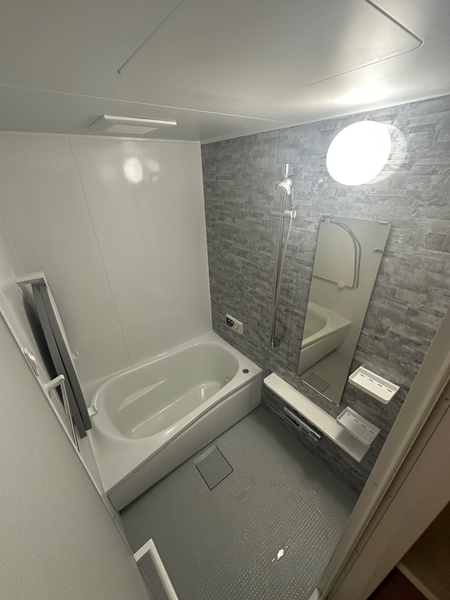 | 工事詳細 | 浴室改修工事 ・アクセントパネル:クレアライトグレー ・周辺パネル:プリエホワイト ・浴槽:ゆるリラ浴槽(ホワイト) ・カウンター:ホワイト ・床:カラリ床(ライトグレー) ・シャワーヘッド:ミラブル潤 |