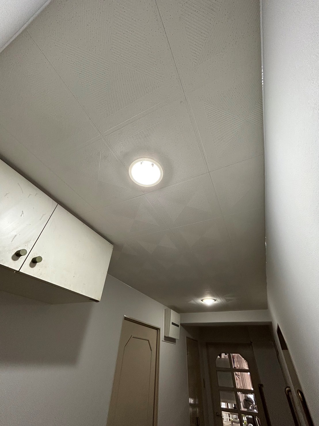 | 工事詳細 | ・天井部:ダイロートン張り(全部屋) ・壁:クロス貼り替え(玄関.廊下・リビング) |