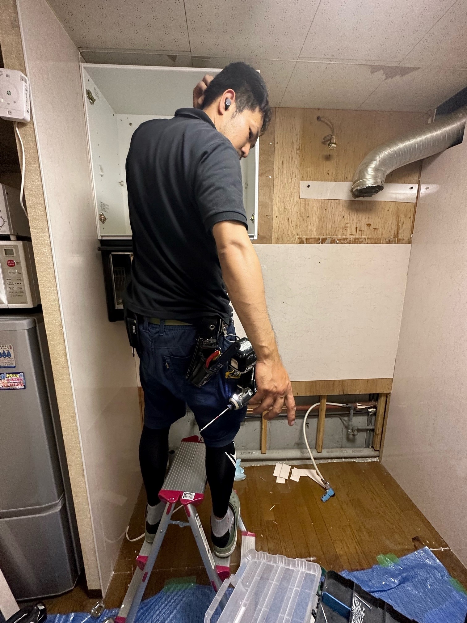 | 工事詳細 | ・扉:開き:モカウッド ・ワークトップ:ステンレス ・シンク:ステンレス ・コンロ:3口ホーロートップタイプ ・レンジフード:フラットスリム型:W750 シルバー ・水栓:シャワーホース付き水栓 |