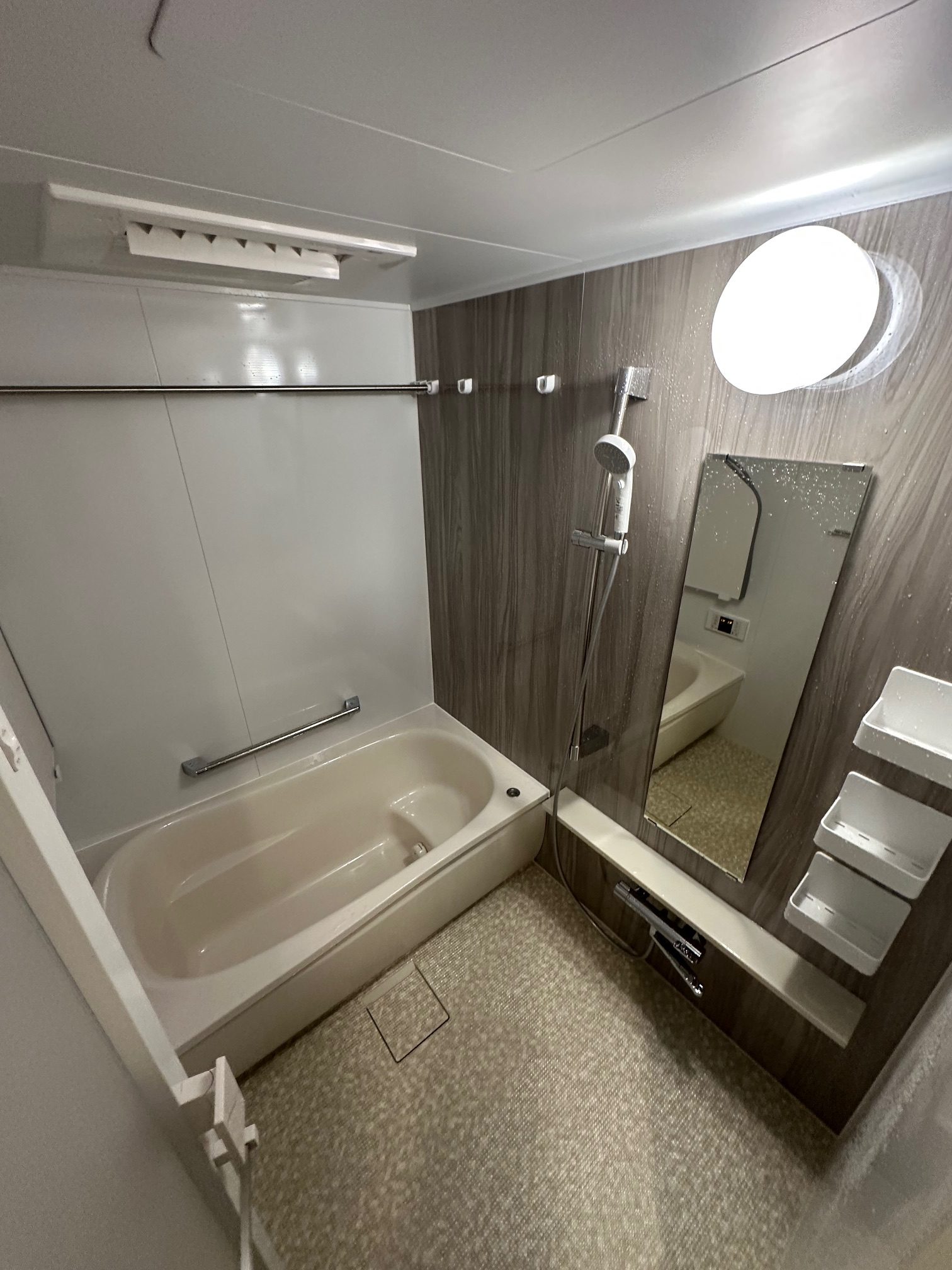 | 工事詳細 | 浴室改修工事 ・周辺パネル:プリエホワイト ・アクセントパネル:マテリアルアロマグリーン ・浴槽:ラウンド浴槽(アクアN) ・床:ほっカラリ床(ペールブルー タイル調) |