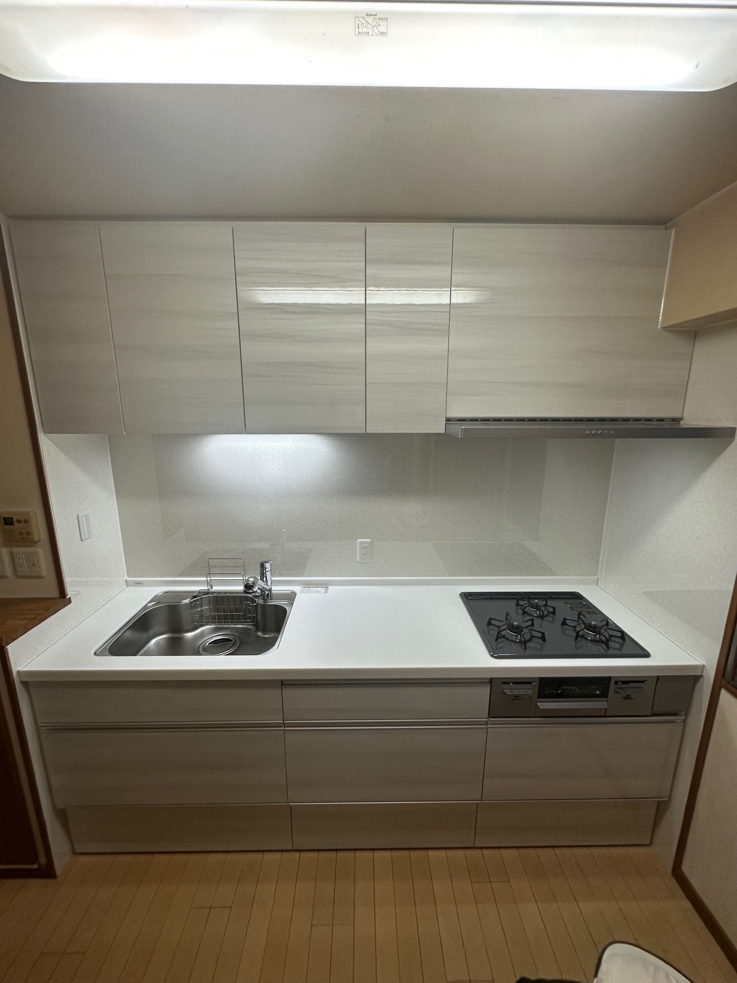 | 工事詳細 | キッチンリフォーム ・扉:開き(モカウッド) ・ワークトップ:ステンレス ・シンク:ステンレス ・コンロ:ホーロートップ2口 ・レンジフード:フラットスリムW600 |