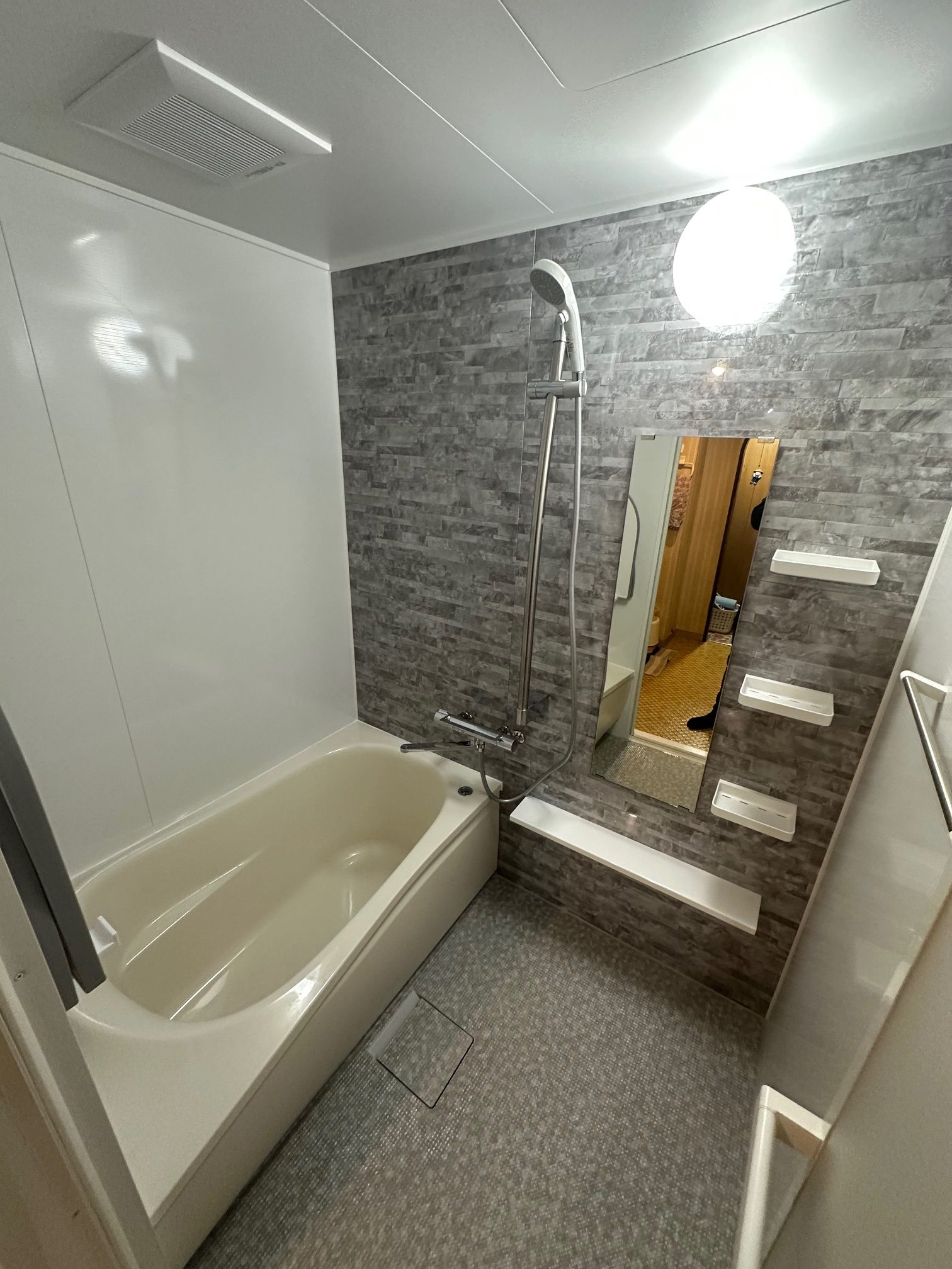 | 工事詳細 | 浴室改修工事 ・周辺パネル:プリエホワイト ・アクセントパネル:ノルディグレーウッド ・浴槽:ゆるリラ浴槽(ベージュ) ・カウンター:ホワイト ・床:ほっカラリ床(ベージュ ラグ調) ・シャワーヘッド:ミラブルプラス |