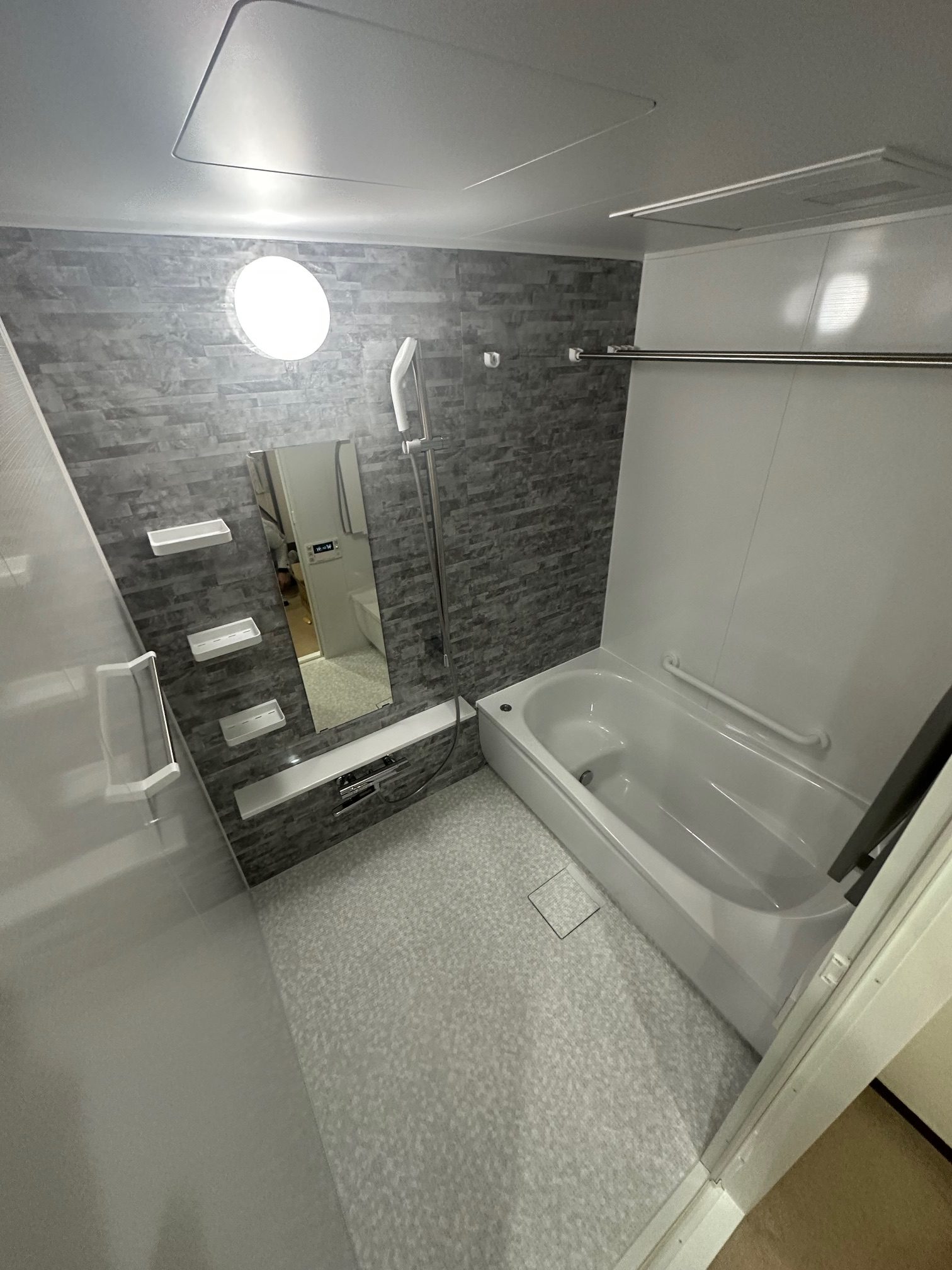| 工事詳細 | 浴室改修工事 ・周辺パネル:プリエホワイト ・アクセントパネル:ノルディグレーウッド ・浴槽:ゆるリラ浴槽(ホワイト) ・カウンター:ホワイト ・床:ほっカラリ床(ホライトグレー ラグ調) ・換気扇:浴室換気暖房乾燥機 |