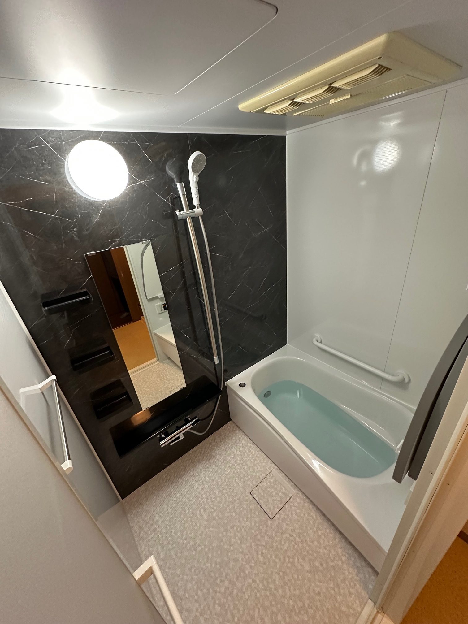 | 工事詳細 | 浴室改修工事 ・周辺パネル:プリエホワイト ・アクセントパネル:クレアライトグレー ・浴槽:人大ラウンド浴槽(ジュエリーホワイト) ・カウンター:ホワイト ・床:ほっカラリ床(ライトグレー ラグ調) ・換気扇:三乾王 ・シャワーヘッド:ミラブルプラス |